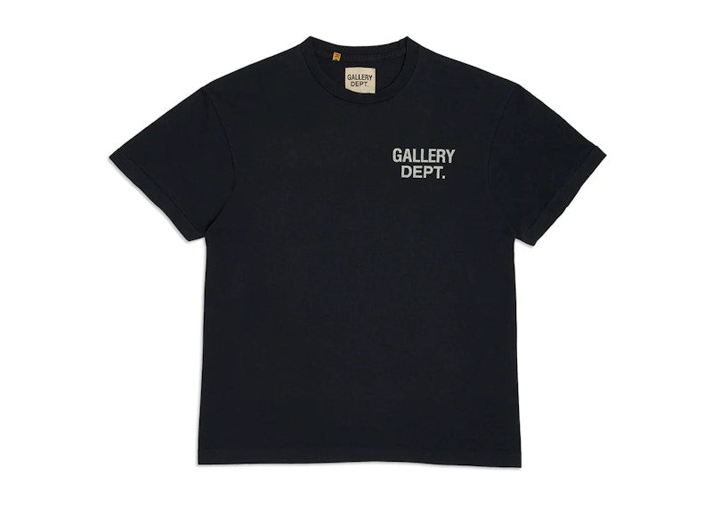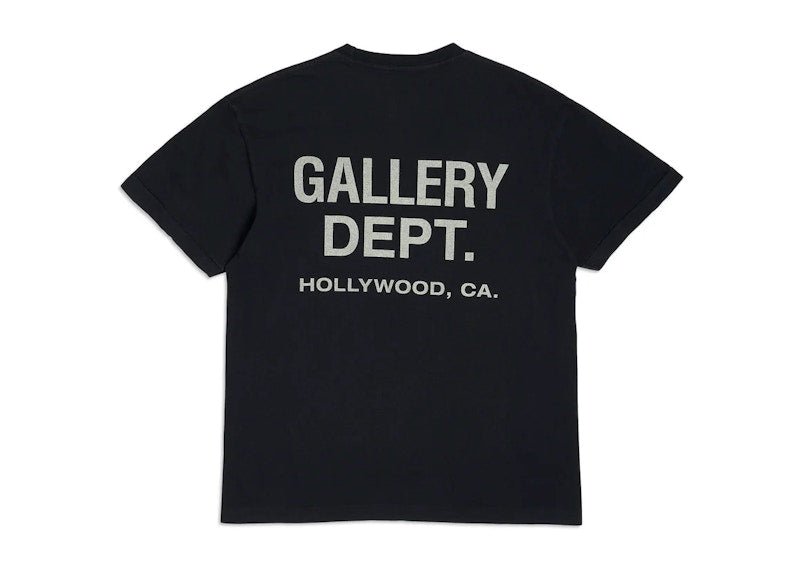 The Vintage Black White Souvenir is a black T-shirt made from 100% cotton by Gallery Dept., a comfortable and breathable material. It features a small white Gallery Dept. logo on the left chest and a larger "Hollywood CA" logo on the back. A company logo label is located on the back of the neck. The T-shirt has a scoop neckline for comfort and durability, open sleeves for ease of movement, and a crew neck.