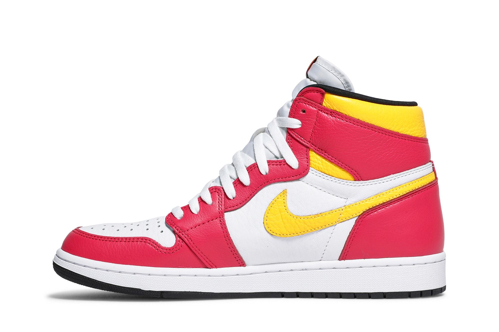 The Air Jordan 1 Light Fusion Red design features a white leather heel counter paired with Light Fusion Red panels and Laser Orange details on the Swoosh logo and collar wrap. A woven Nike label stitched onto the tongue completes the look of the Air Jordan 1 Light Fusion Red.