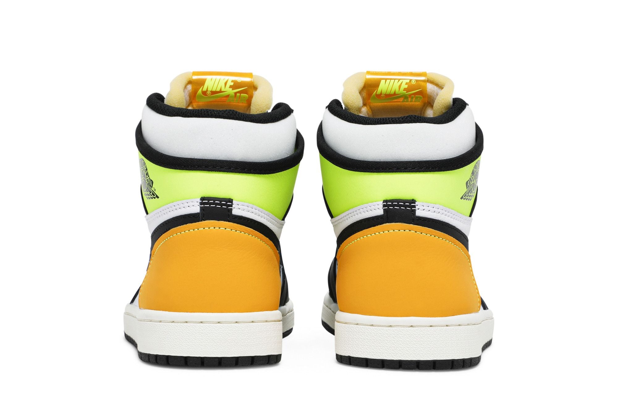 The Jordan 1 High Volt Gold introduces a new look for the Black Toe theme, with innovative materials and features that contribute to a reconstructed design aesthetic. The Jordan 1 Volt Gold upper is composed of white, black and yellow leather, with a Volt Yellow panel that includes the Jordan Wings logo around the ankle. The Jordan 1 High Volt Gold is distinguished by single-stitch reinforcement on the overlays, which creates dimension with exposed edges, and includes a nylon tongue with exposed foam edges and a reversible clear label. The Jordan 1 High Volt Gold offers a unique and revamped design.