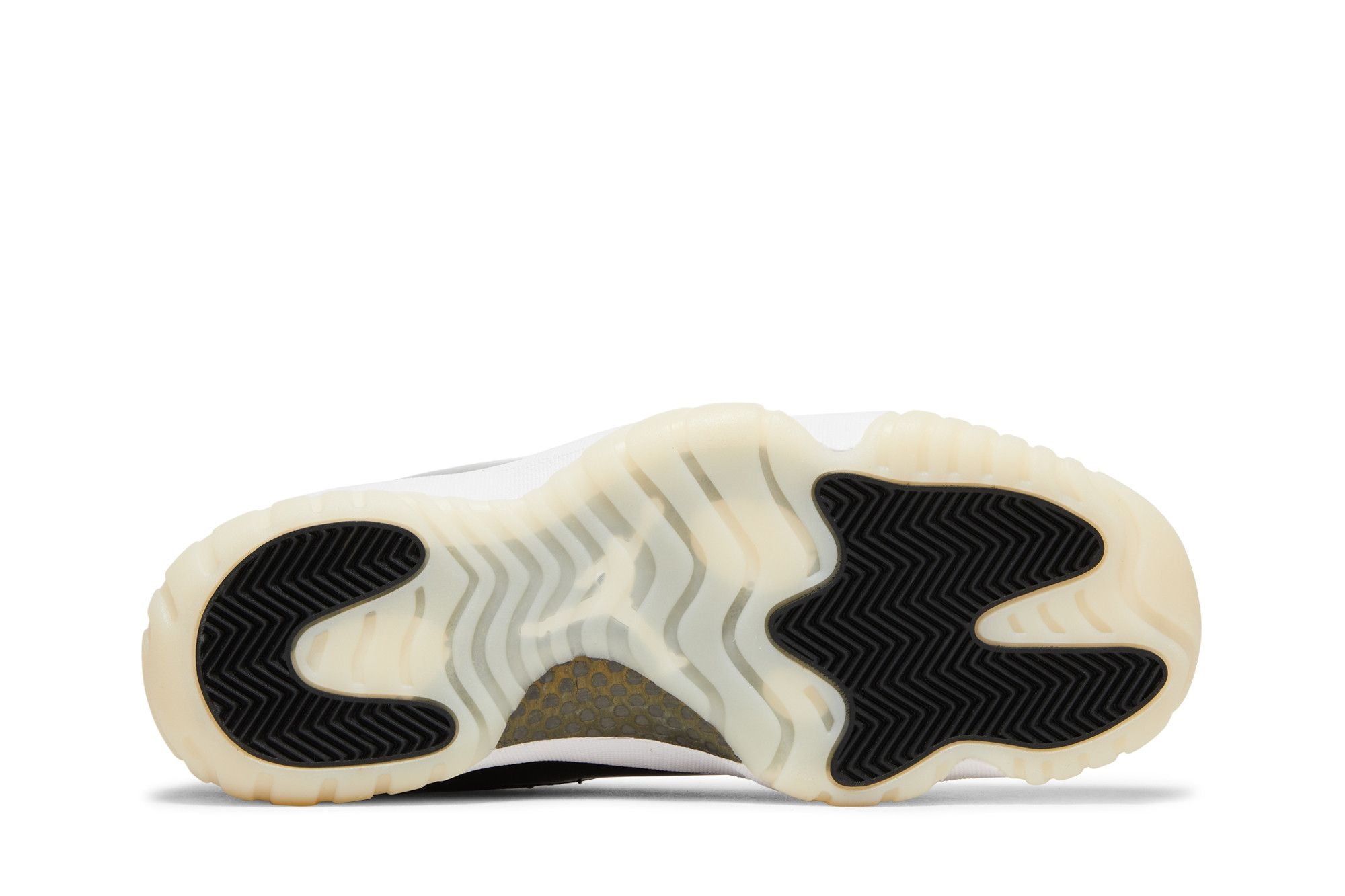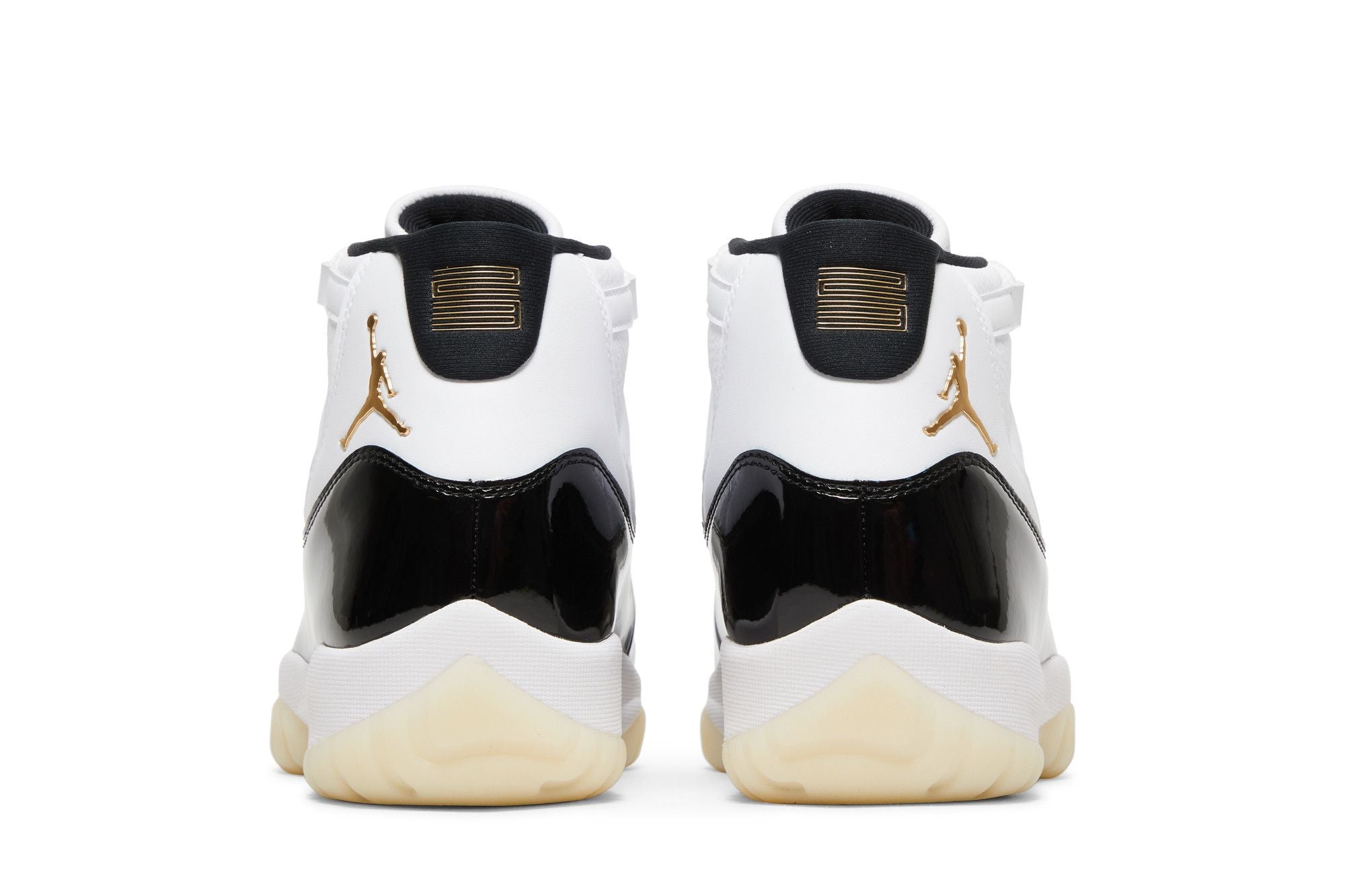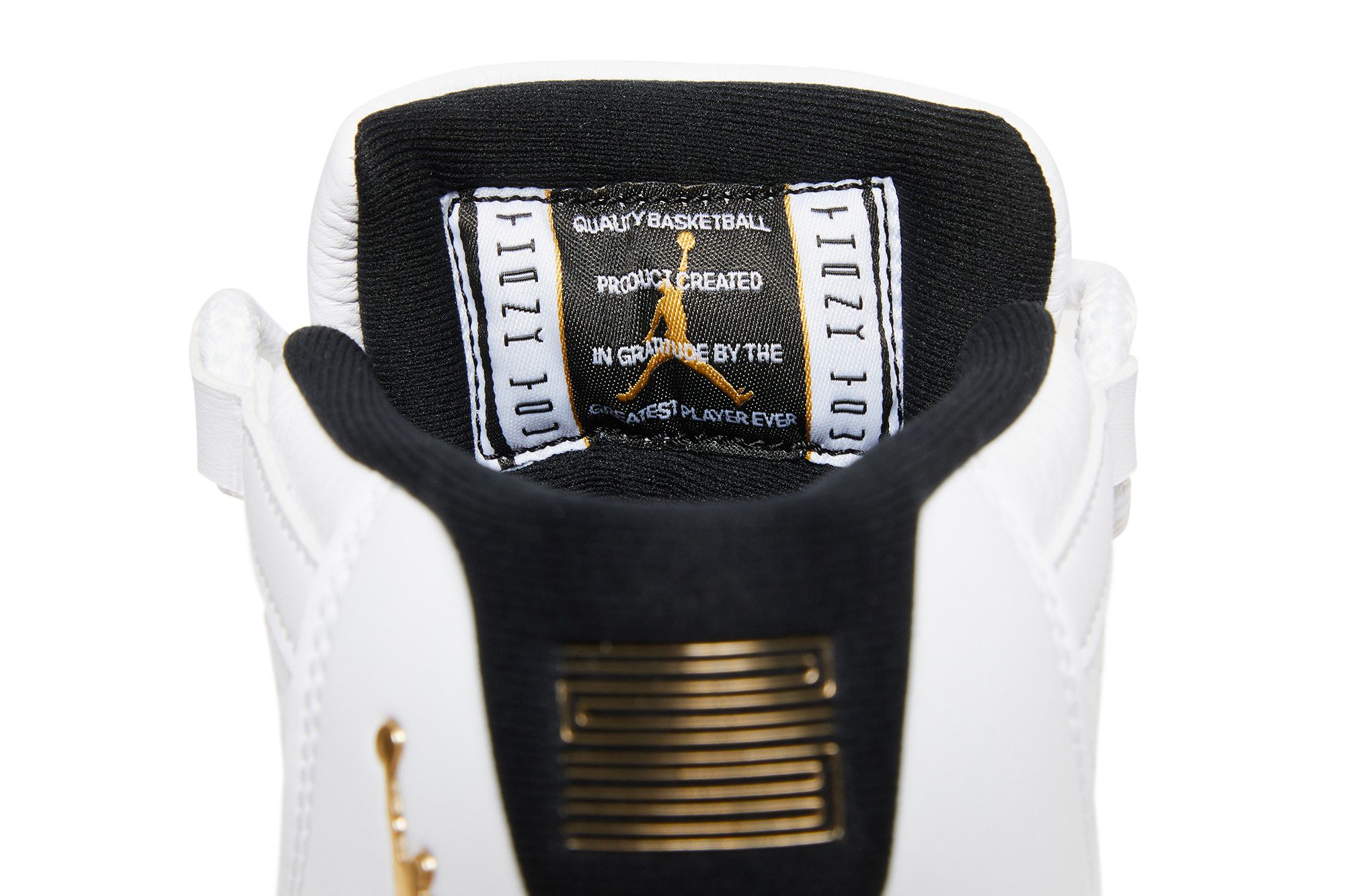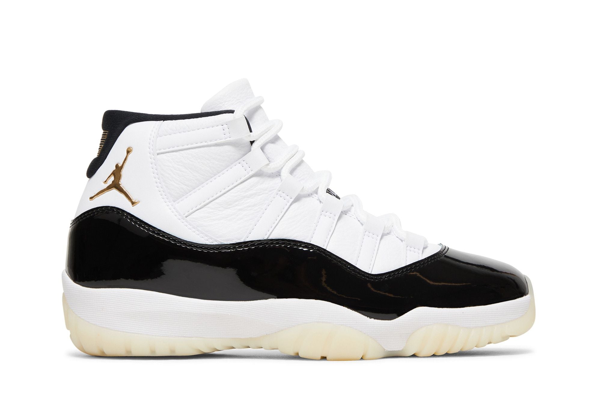 This Air Jordan 11 Retro Gratitude features a white leather base, accompanied by the legendary black patent inserts surrounding the upper. A White midsole matches the upper and laces while a Cream outsole finishes off the design. Gold, the different branding on the silhouette pays homage to His Airness' success in the 1996 NBA Finals when he wore the AJ11s on his feet as he led the Chicago Bulls to the title. See all the specs on Nike.