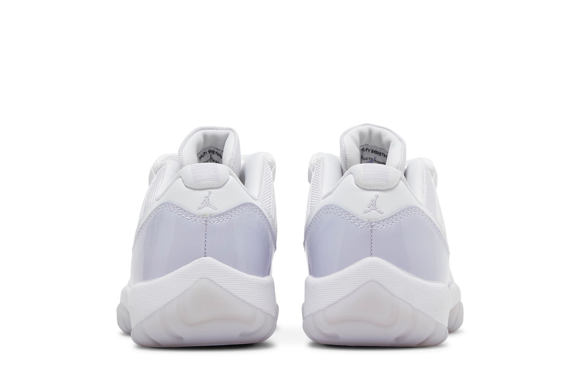 The Air Jordan 11 Retro Low Pure Violet features a white mesh construction accompanied by a purple patent mudguard in a pastel shade. Numerous tonal branding adorns the upper, such as the Jumpman embroidered on the heel. A white outsole with a translucent outsole completes the 1991 design.