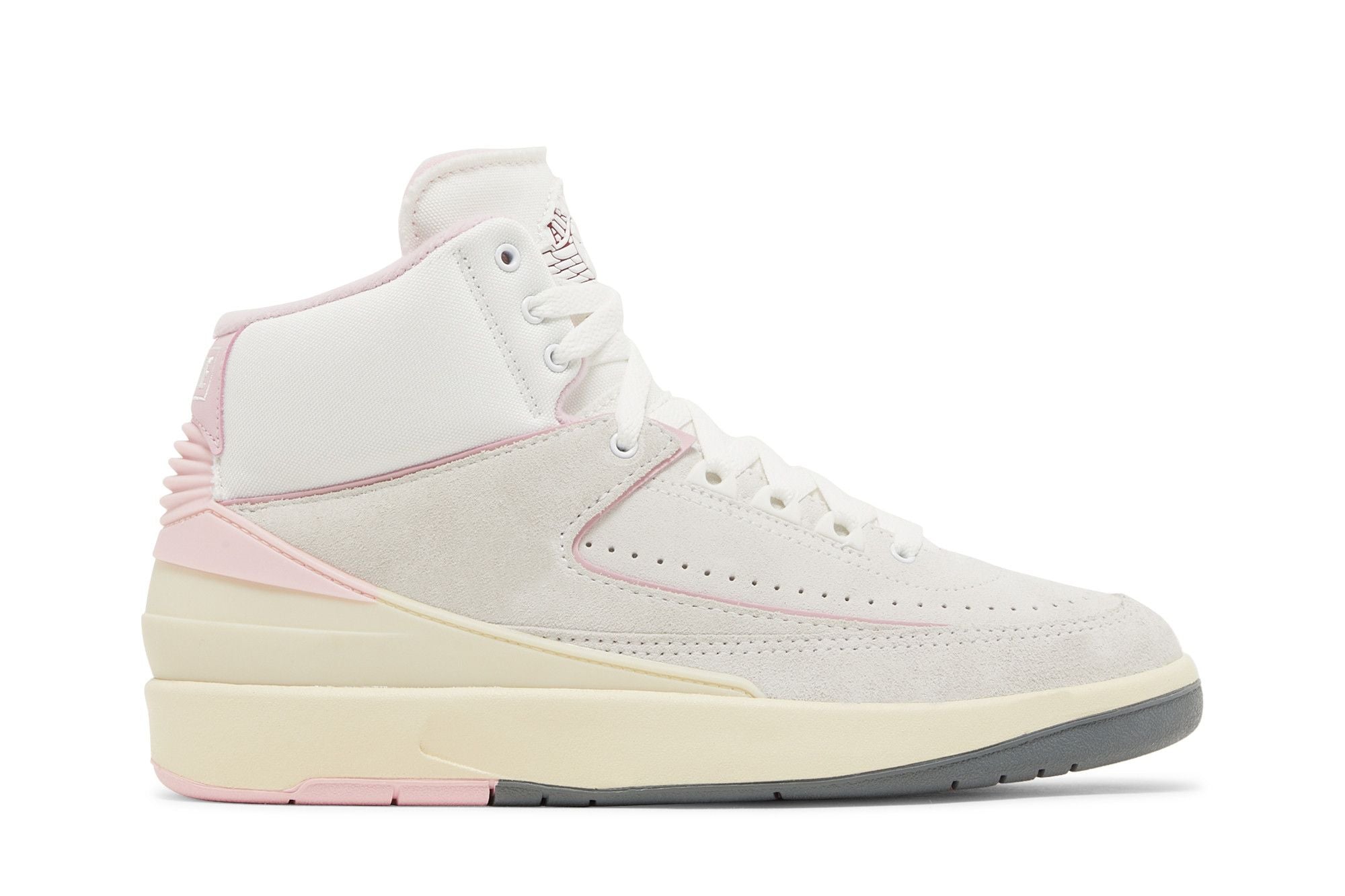 La Jordan2 Retro Soft Pink presenta una silhouette classica rivestita con toni pastello e tessuti morbidi. La parte superiore è realizzata in pelle bianca liscia con inserti in suede bianco ricco, bordati in rosa tenue e dotati di perforazioni che delineano la punta. Un contorno del tacco scolpito in rosa pallido sostiene una linguetta posteriore in pelle rosa con marchio Nike ricamato in bianco. La midsole in polipuretano bianco avvolge la tecnologia Air e poggia su una robusta outsole in gomma rosa, grigia e bianca. L'interno della parte superiore è foderato con un tessuto rosa soffice e imbottito per un adattamento confortevole.