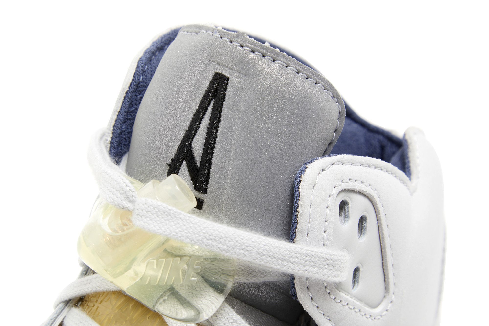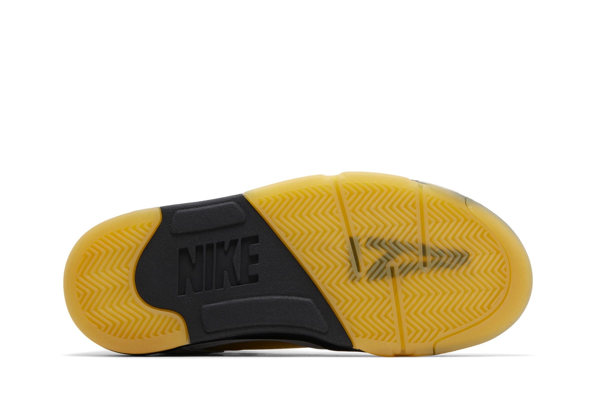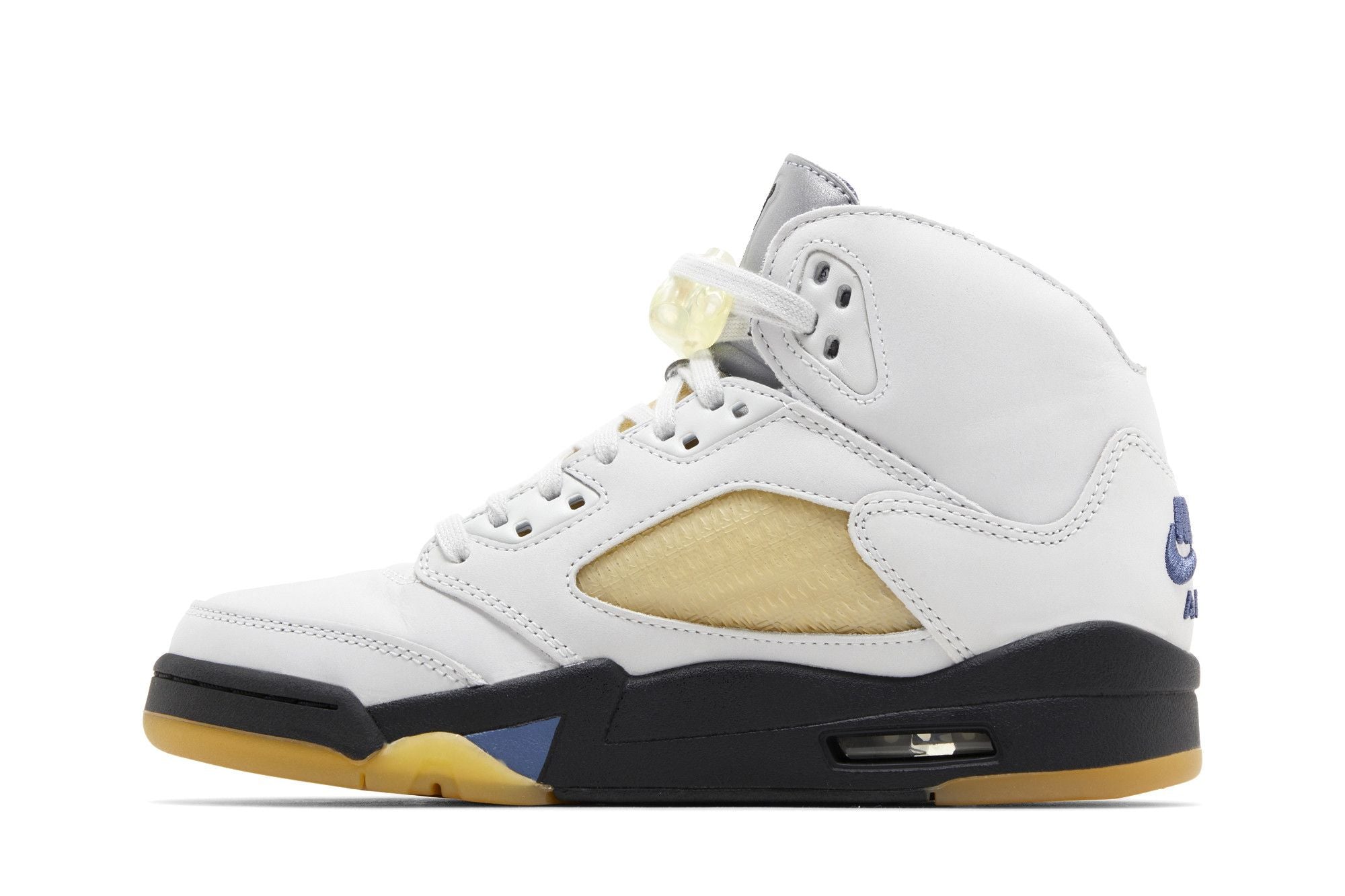 The Jordan 5 Retro A Ma Maniére Dawn features a gray leather base, accompanied by tonal panels. We notice the usual yellow cage in the center of the room. Michael Jordan's iconic number 23 occupies the heel while A Ma Maniére branding is emblazoned on the left tongue. An outsole shared between blue, yellow and black and with an air bubble finishes the design off beautifully. See all the specs on Nike.