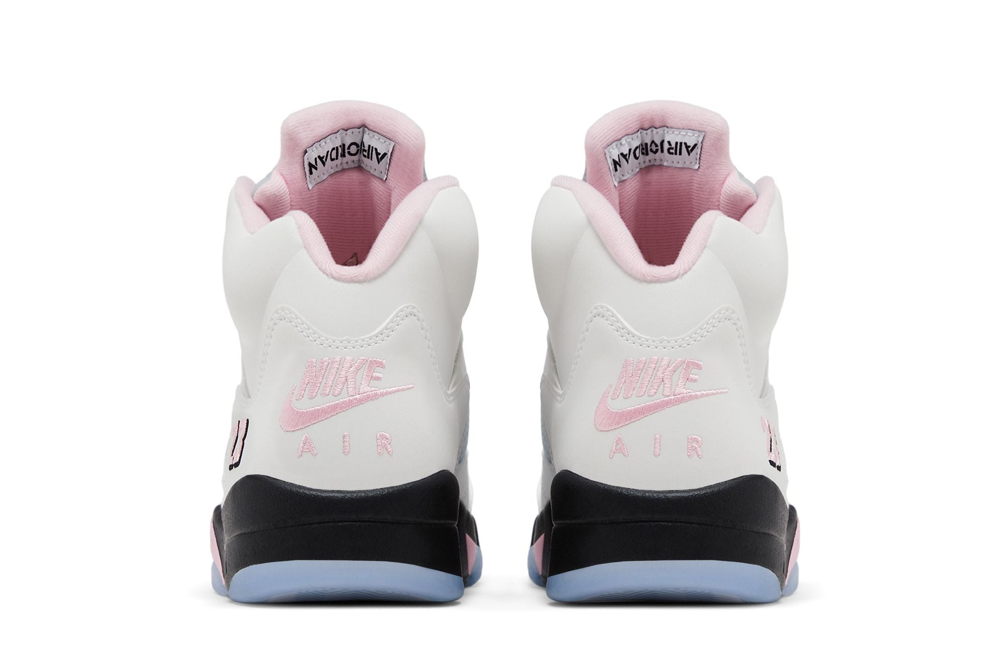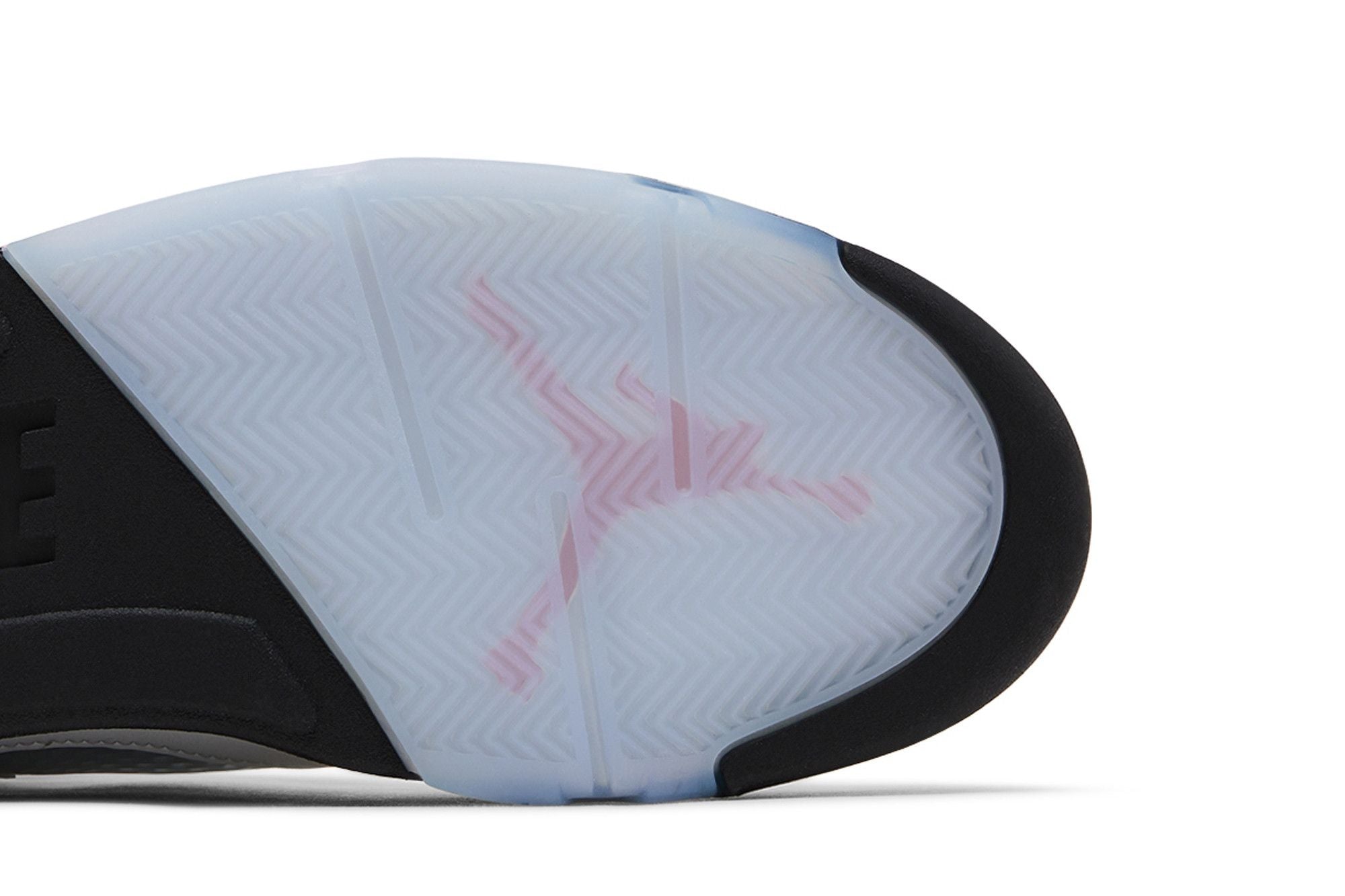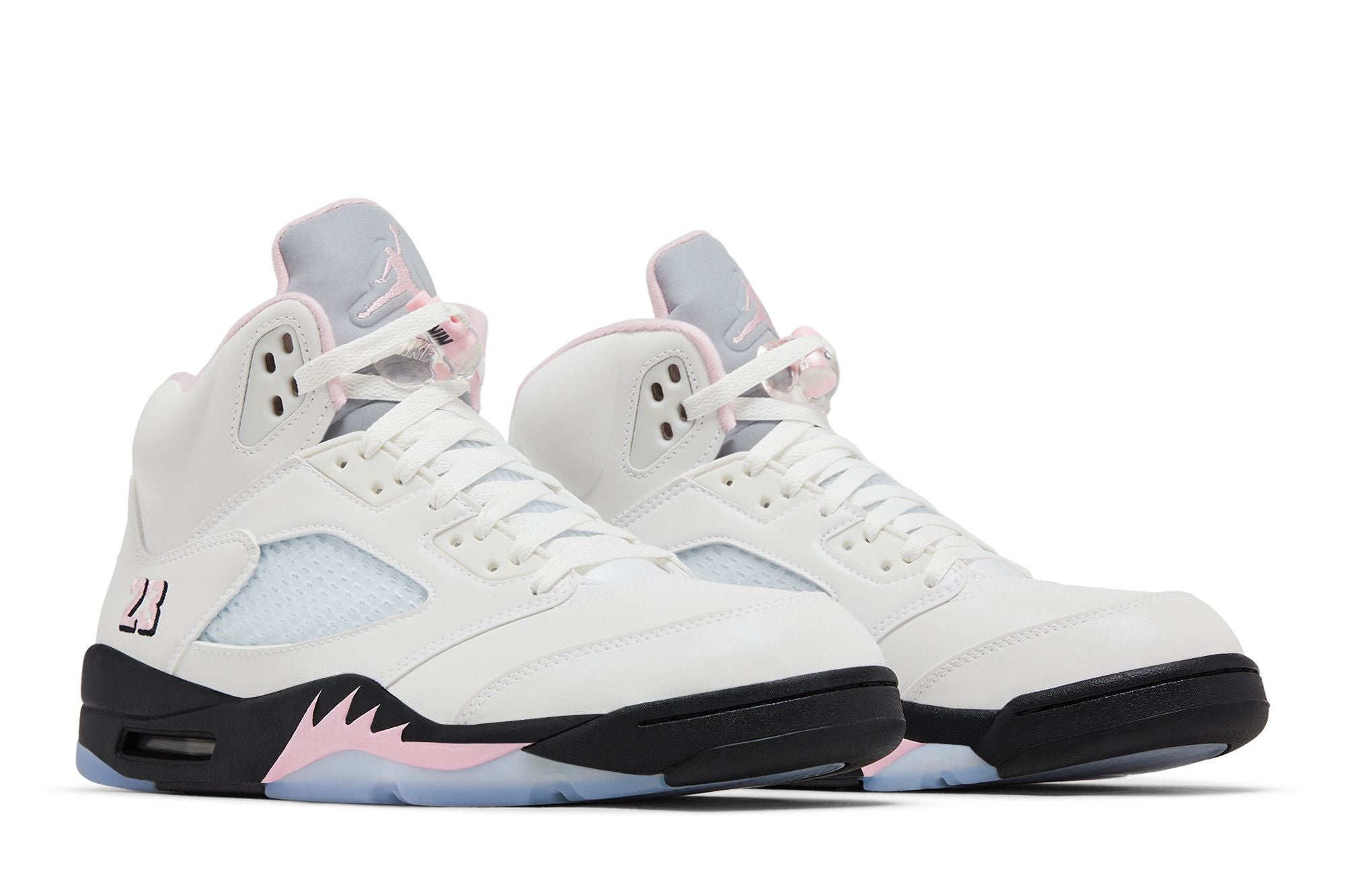 La Air Jordan 5 "Moonlight" presenta una tomaia in pelle bianca, con dettagli in rosa e grigio. La suola è nera con inserti rosa e una base semitrasparente blu. L'elemento "23" è applicato sul lato. La scarpa ha un design accattivante e una costruzione di alta qualità.