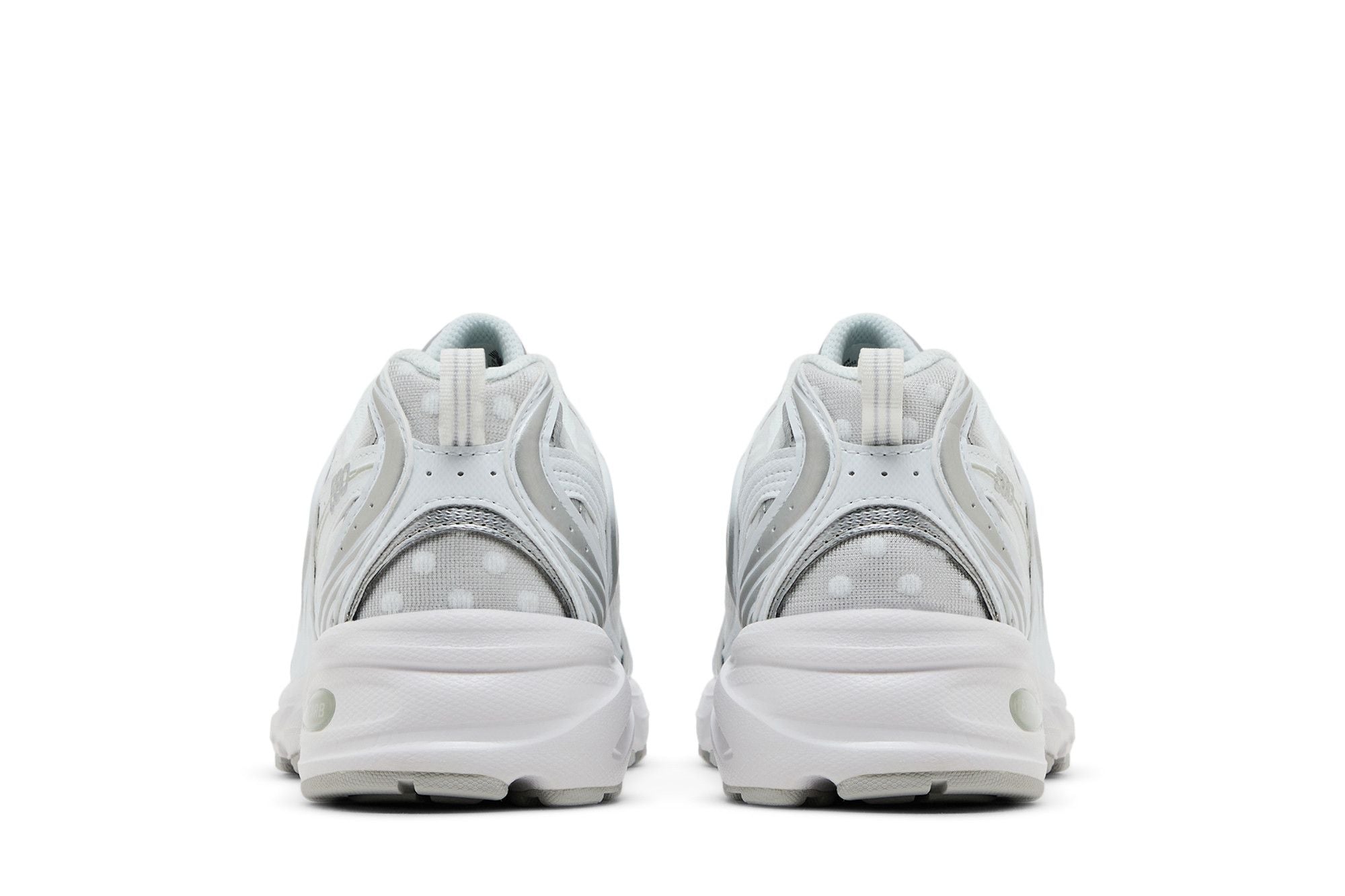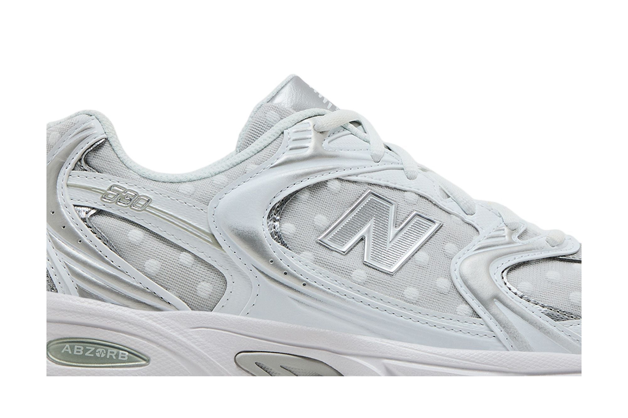 The New Balance 530 Silver Metallic Polka Dots is a running shoe featuring a silver and white color combination. The upper is made of a synthetic material with a metallic polka dot pattern. The outsole is made of white rubber and features a block design for increased traction. The sidewall of the shoe features an embossed "N" logo. The shoe is available in a single colorway of silver with metallic polka dots.