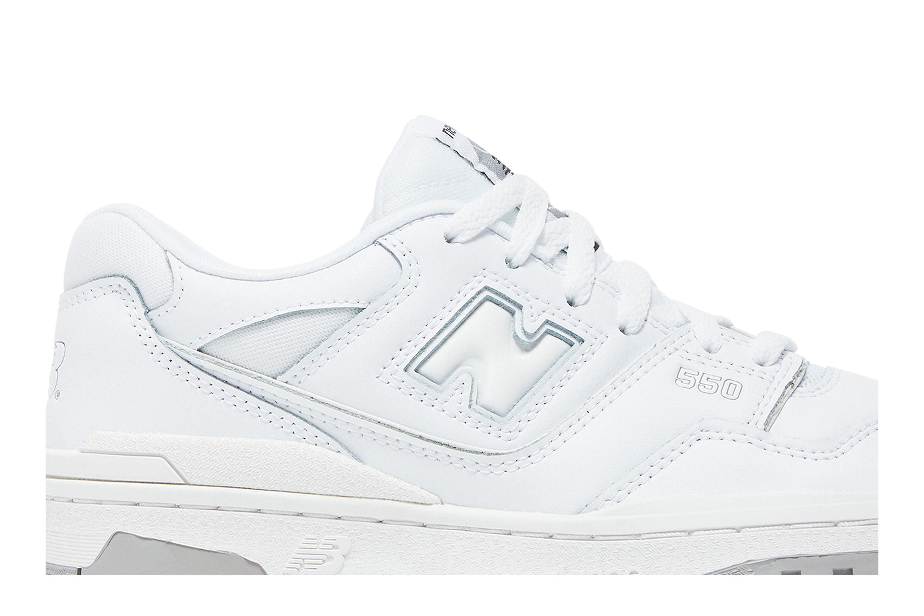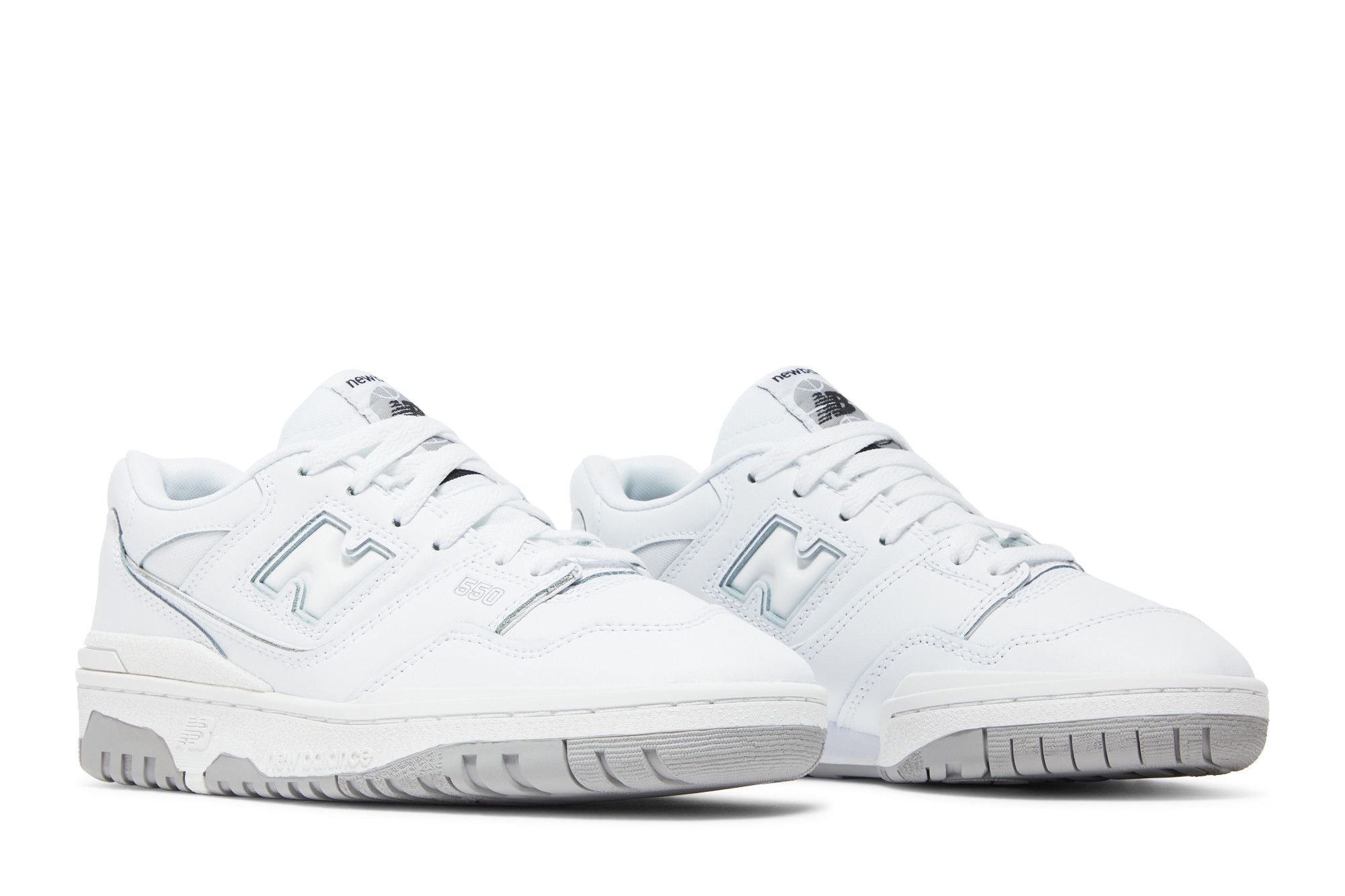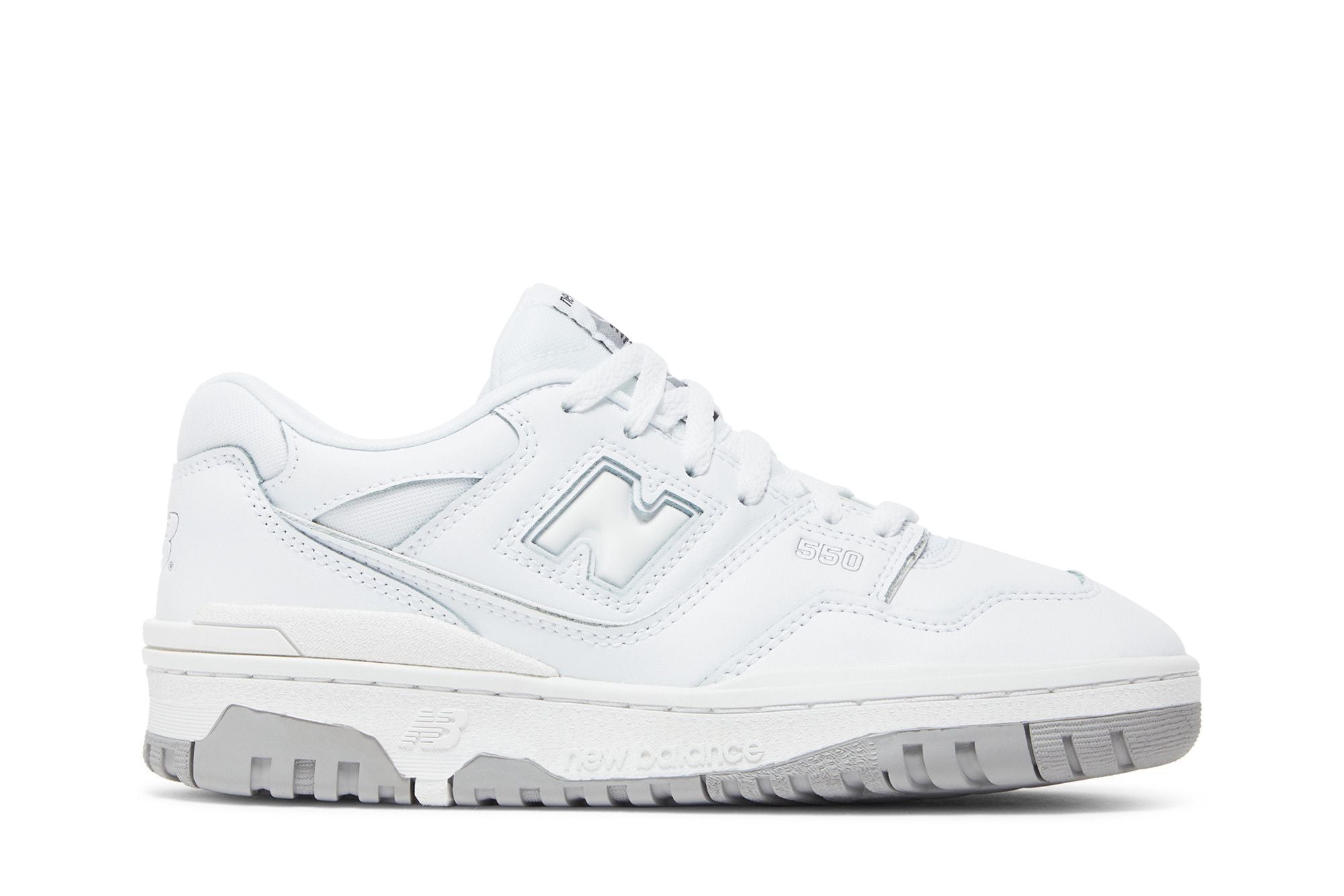 The New Balance 550 White Grey for boys features a white base with a mix of smooth and perforated leather. However, it differentiates itself by applying pearl grey accents exclusively to the outsole. A bit of branding on the tongue, quarter panel and midsole adds the finishing touches. See full specs at New Balance .