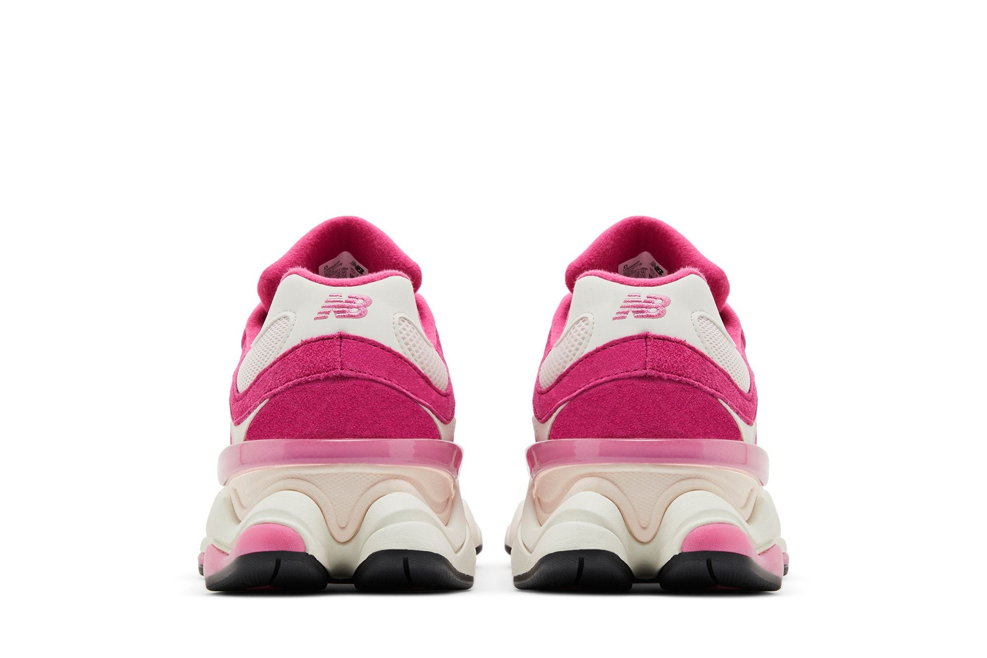 The New Balance 9060 Fuchsia Pink features an upper with a Pale Pink mesh base for breathability. Suede overlays in a bright Fuchsia color run across the upper to form the toe box, eyestays, mudguard, midfoot, and heel. The New Balance N appears in an off-white color on the lateral side and again on the inner side with embroidered pink dotted stitching. The white leather heel collar also features pink NB branding, while the tongue features a 9060 patch.
