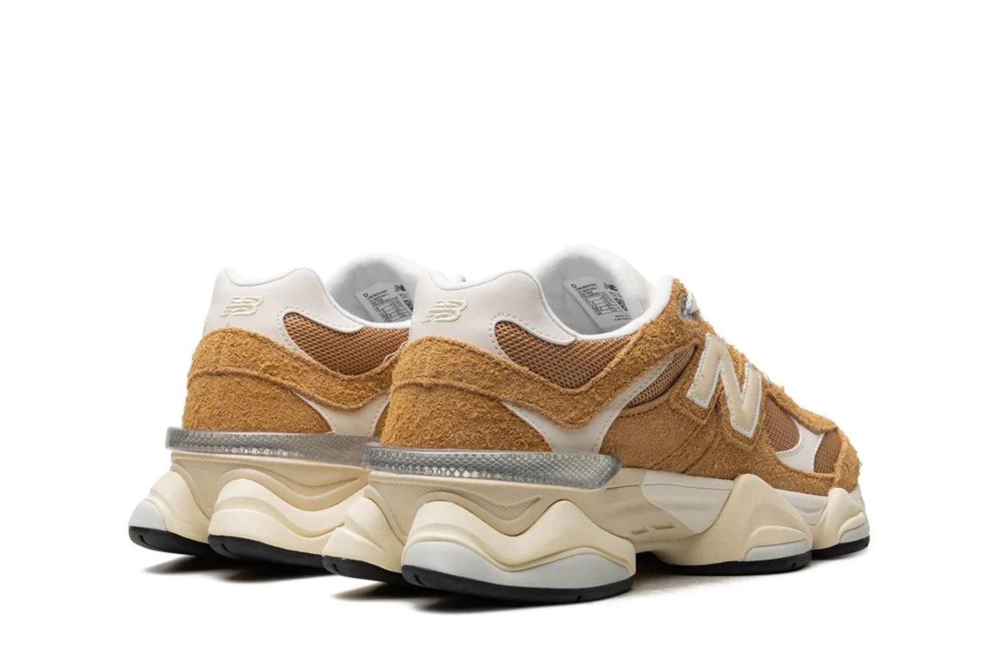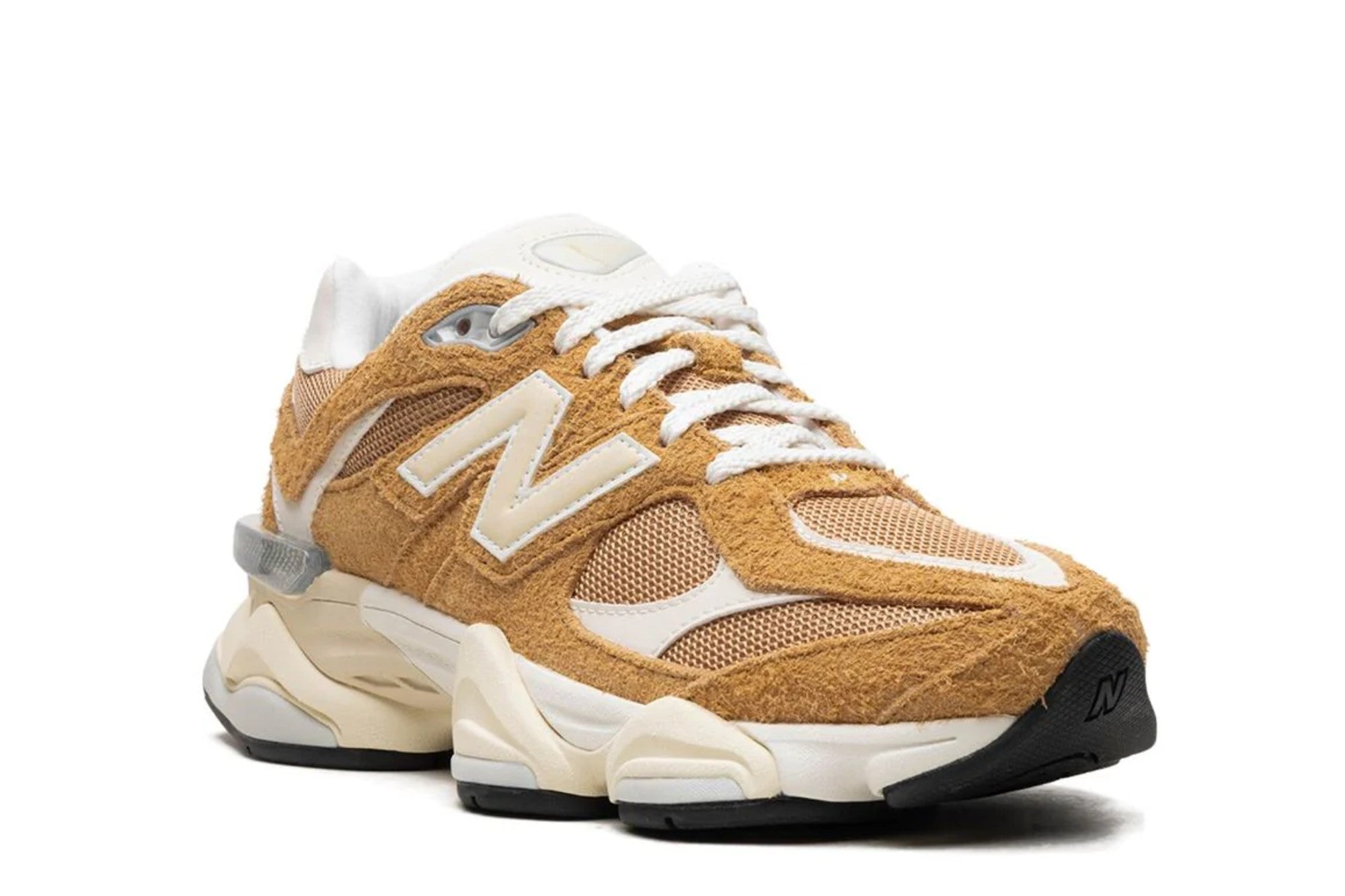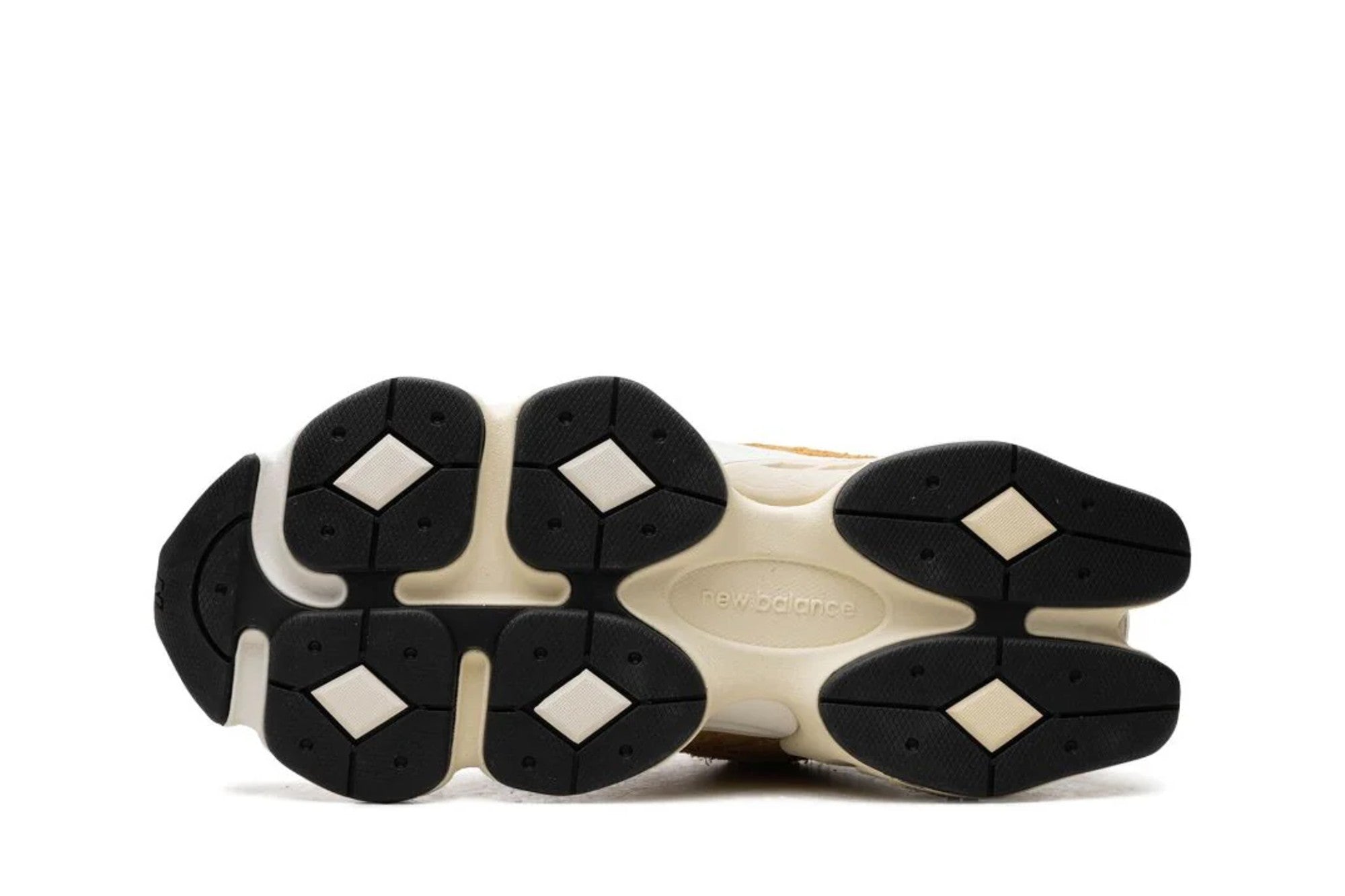 The New Balance 9060 "Great Plains" combines innovative design and premium materials, offering a bold aesthetic inspired by the landscapes of the Great Plains. The upper features a mix of mustard-colored shaggy suede and breathable mesh, with cream and white details that add a touch of sophisticated contrast. The iconic "N" on the side is in neutral tones for a balanced look.