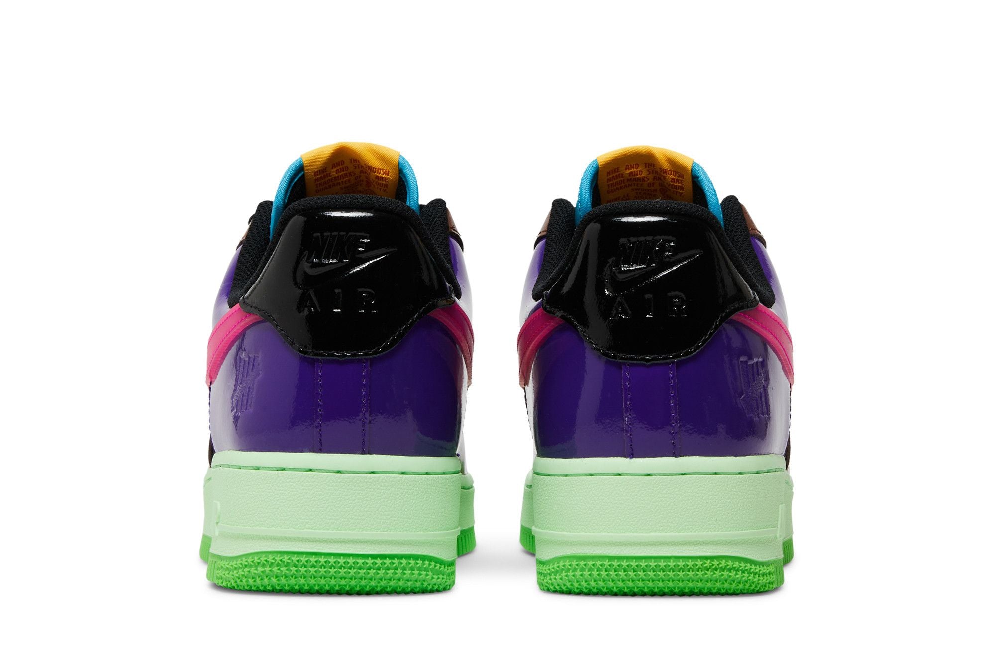 The Nike Air Force 1 Low SP Undefeated Multi Patent Pink Prime is the result of an exclusive collaboration with UNDEFEATED. The upper of this Low SP Air Force 1 is constructed with multi-colored patent leather, while the light blue tongue, black and white insole and purple heel feature the 5-Stripes logo and black laces with a hot pink "UNDFTD" design that matches the Swoosh symbol. A sea foam mid-strap, sitting atop a kelly green outsole, features Air branding. The Nike Air Force 1 Low SP Undefeated Multi Patent Pink Prime boasts a unique and bold design.
