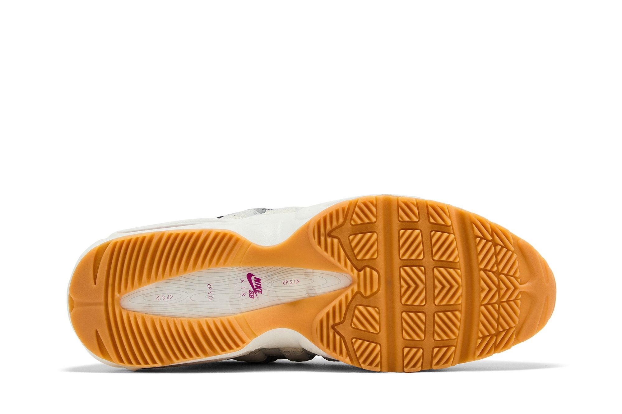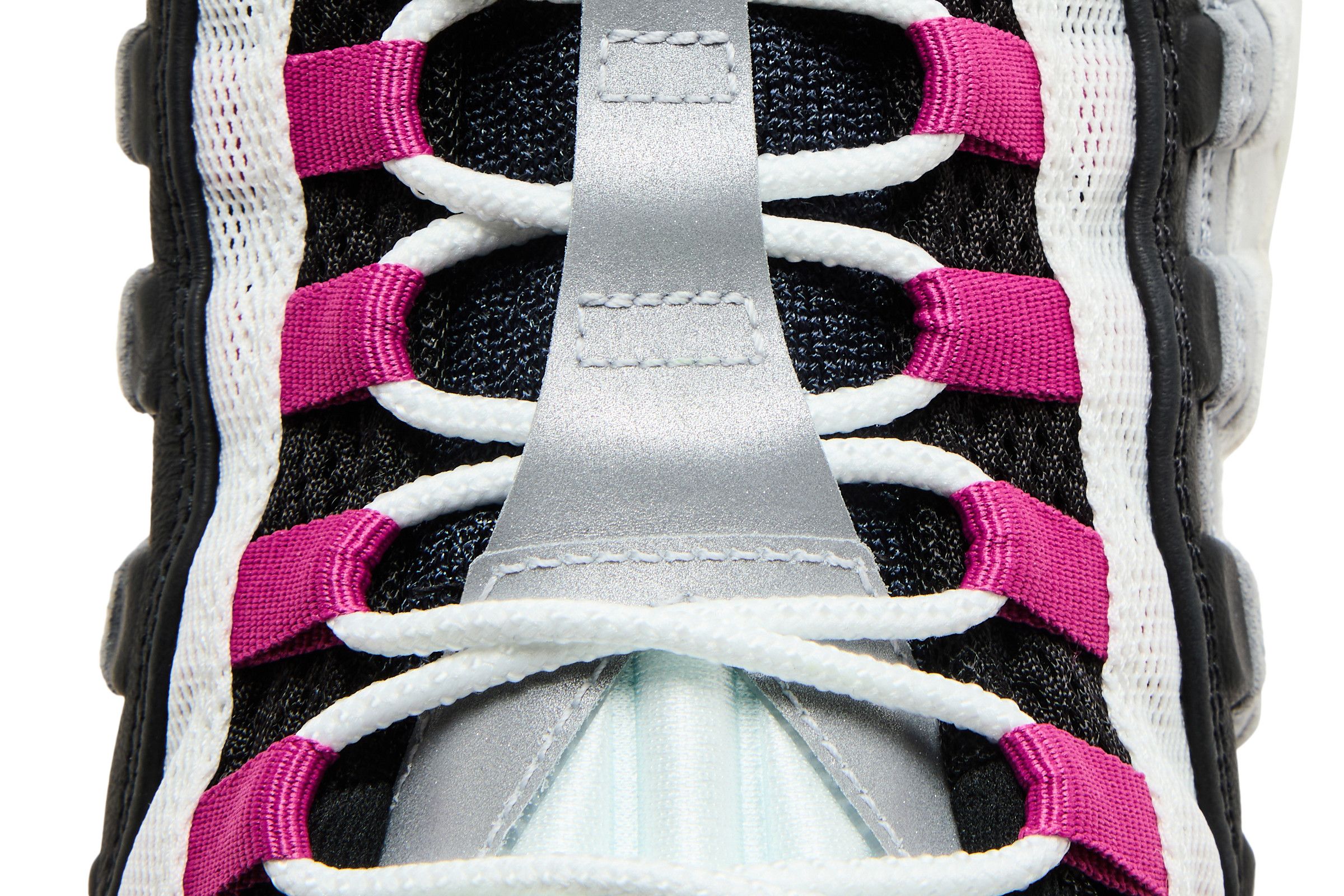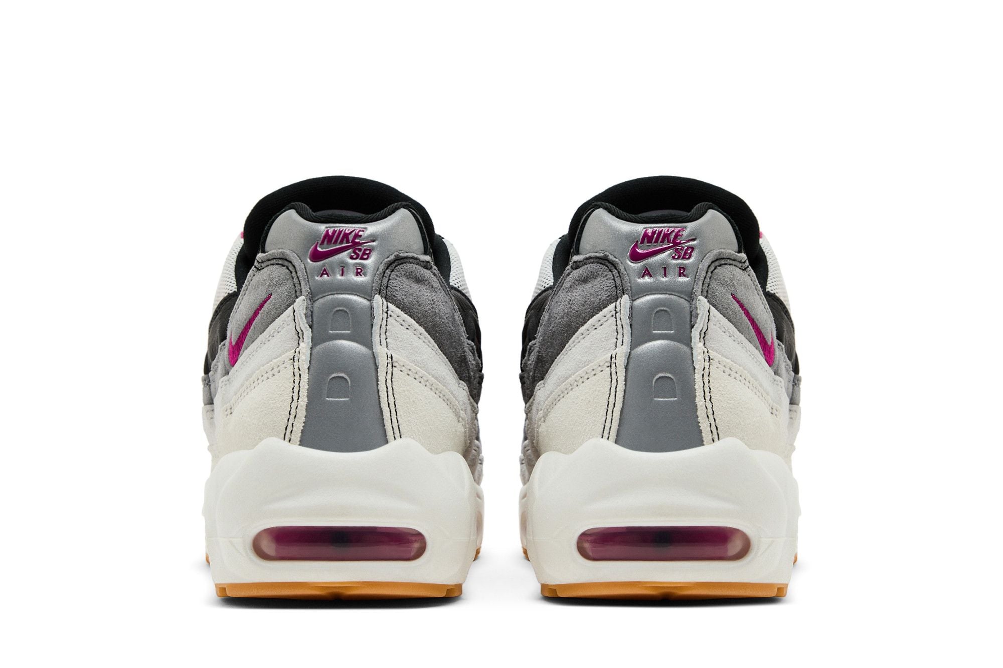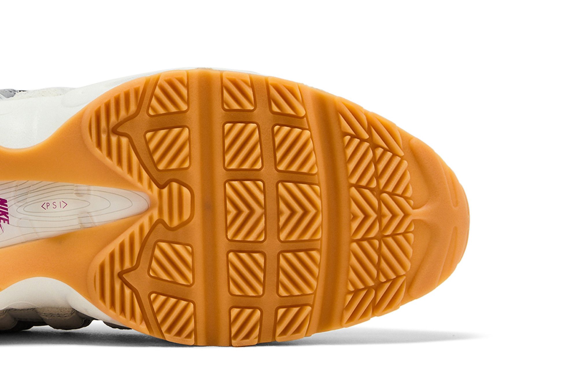 The Nike Air Max 95 features a grey, black, and pink color scheme. The upper is made of materials such as mesh, leather, and suede, offering a modern and sporty look. The sole is white with a yellow underside and features red and white inserts, typical of Air Max technology. The laces are white and pink, while the Nike logo is visible on the side.
