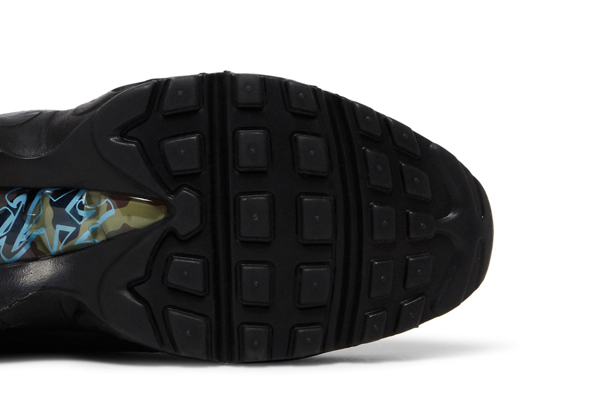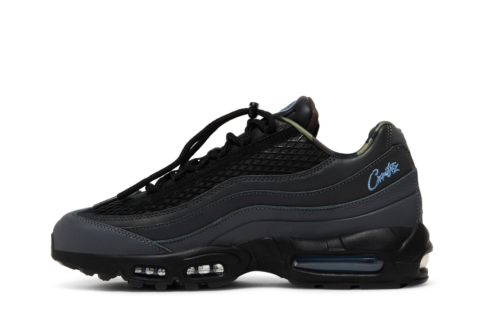 The Nike Air Max 95 SP Corteiz Aegean Storm is a special edition collaborative sneaker between Nike Sportswear and Corteiz. It features a leather and mesh upper with a "Gridiron" finish on the wavy panels and black mesh around the throat. The mudguard features a light grey hue. The left shoe features different versions of the Corteiz branding embroidered on the front lateral side and heel. The lateral heel of the right shoe features a small Swoosh embroidered in light blue to contrast the upper. Other details include camouflage details on the lining and sockliner, branding on the tongue and heel, and drawcord laces. The black sole unit features a visible Max Air window on the heel and forefoot, completing the design.