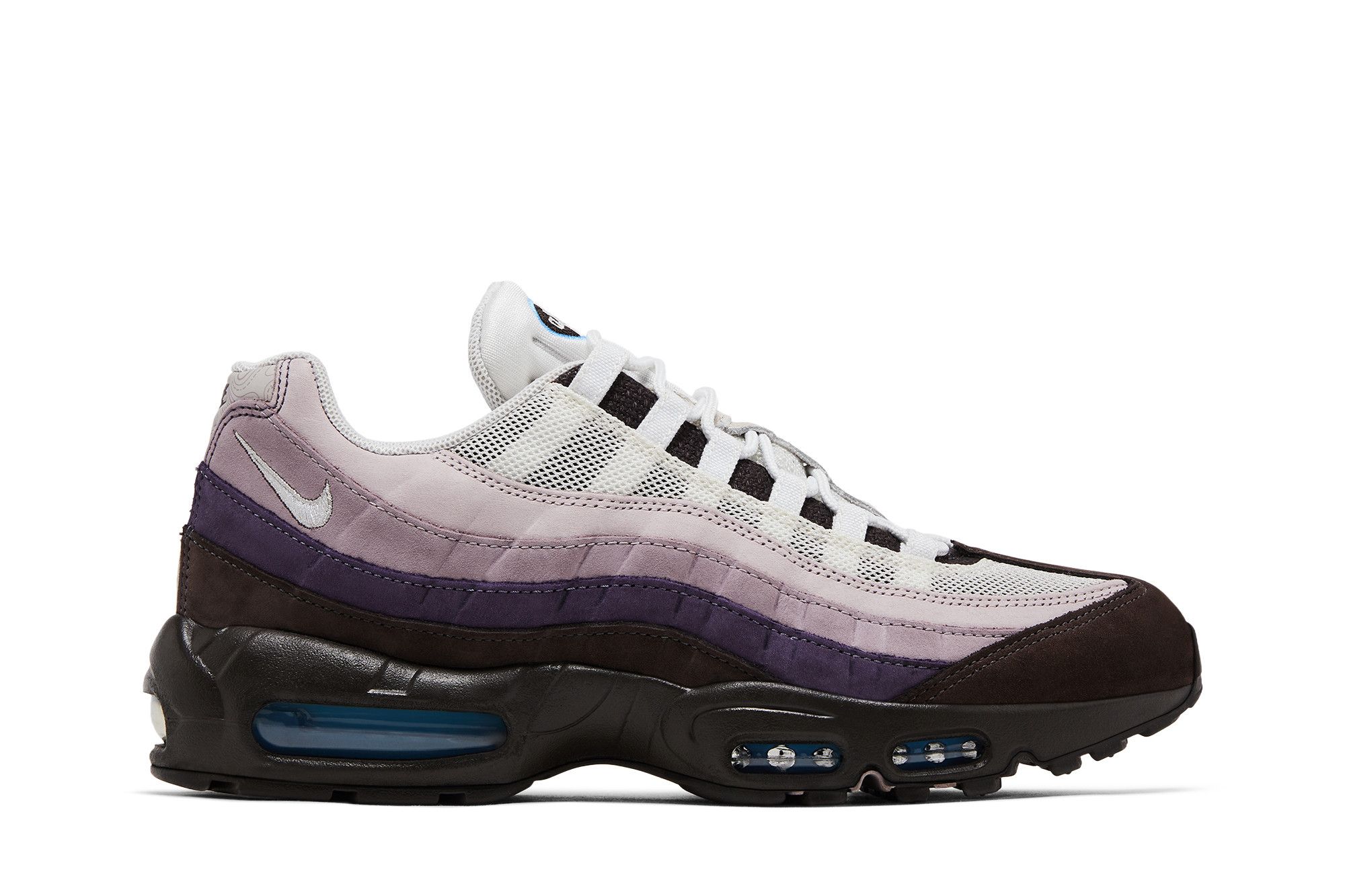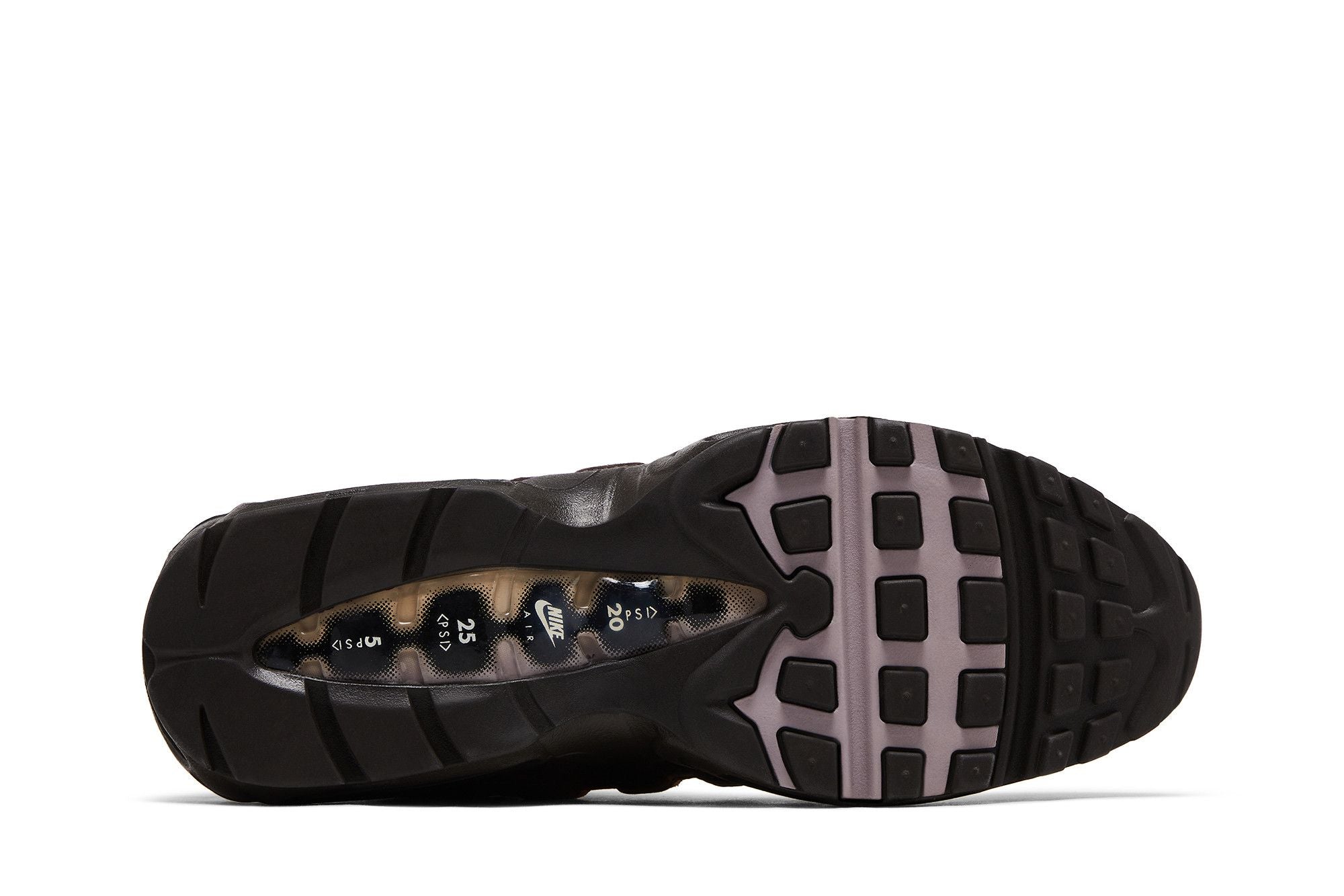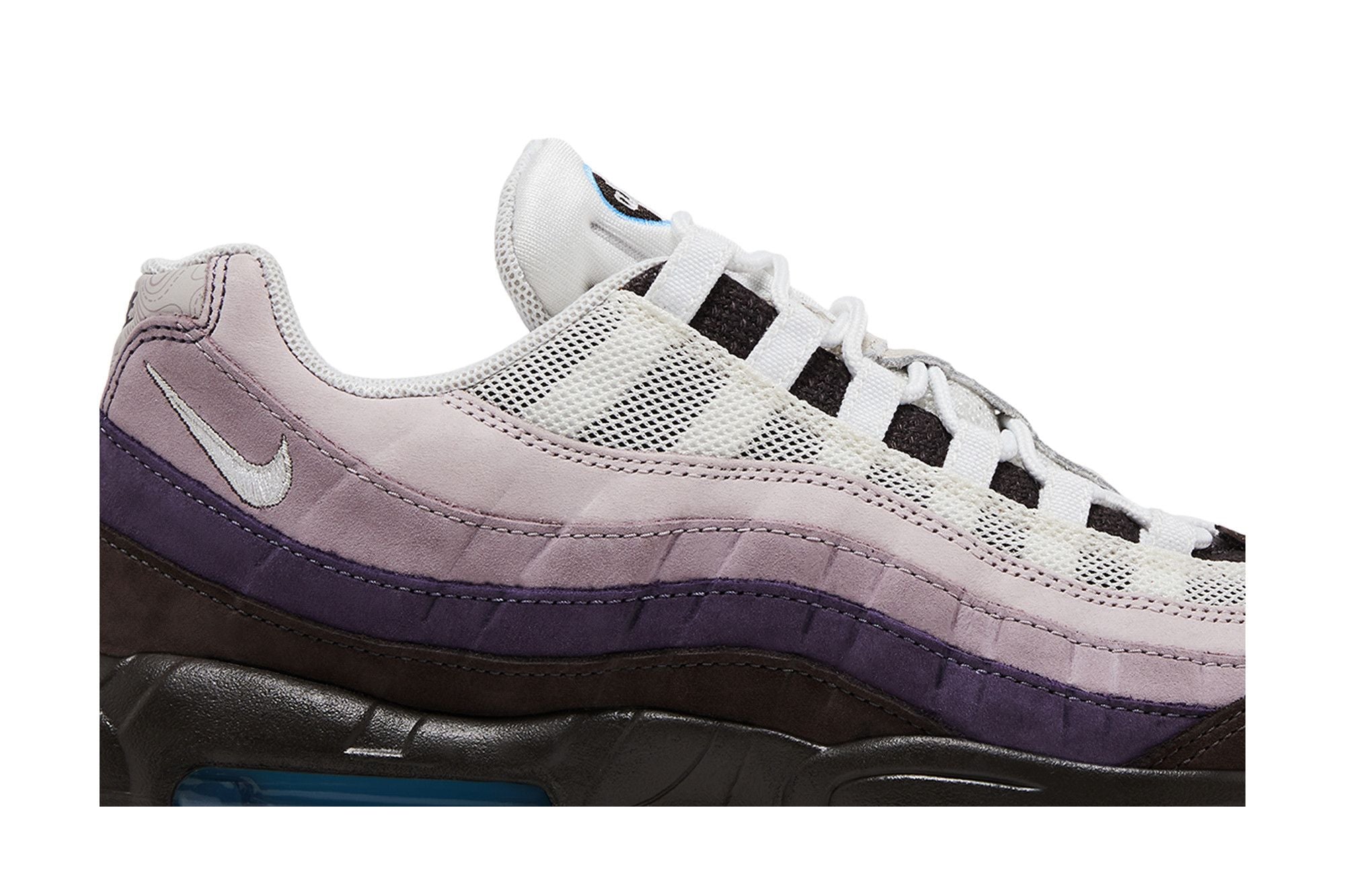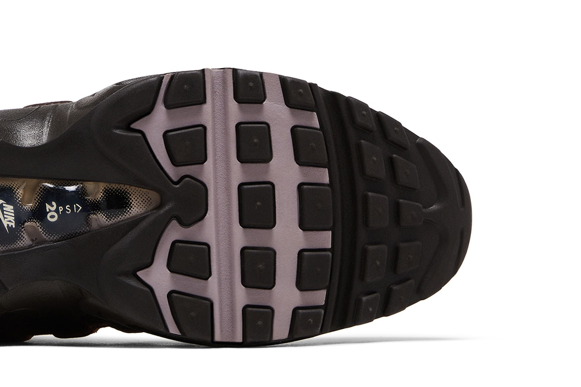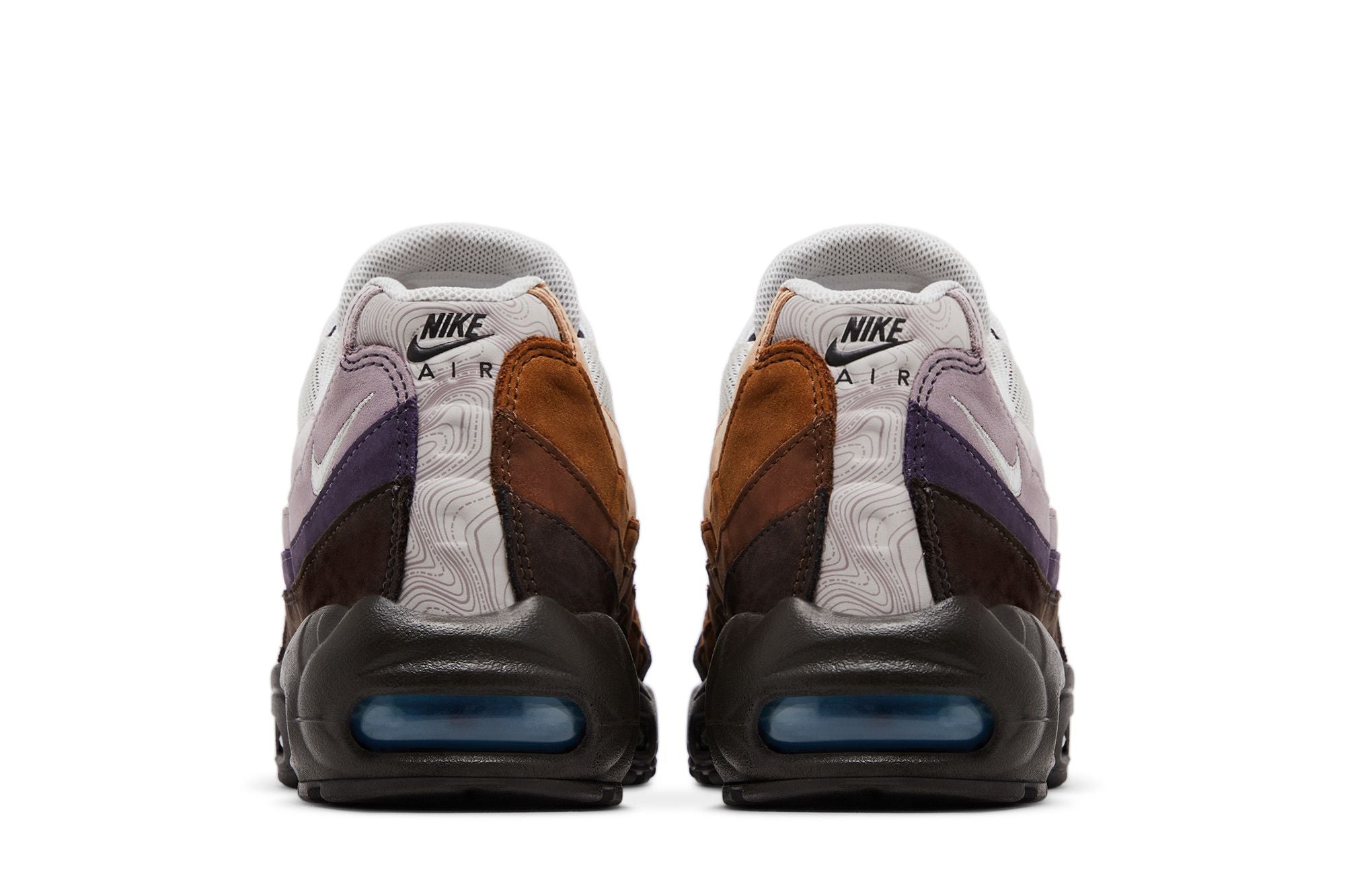 The Nike Air Max 95 Unearthed features a design inspired by the earth's layers, with overlays in colors like Summit White, Cocoa Wow, Light British Tan, and Velvet Brown. The wave-inspired upper combines synthetic and mesh materials, with white laces and speed lacing eyelets. Air Max branding is present with an embroidered logo on the tongue and a Swoosh on the outer side of the ankle. Air units are visible under the heel and forefoot in a blue color, reminiscent of water. The graduated overlays feature different earthy tones on the two sides, creating an Unearthed effect. The lateral and medial sides feature different color palettes, inspired by rocks and minerals and terrain respectively, enriching the colorway.