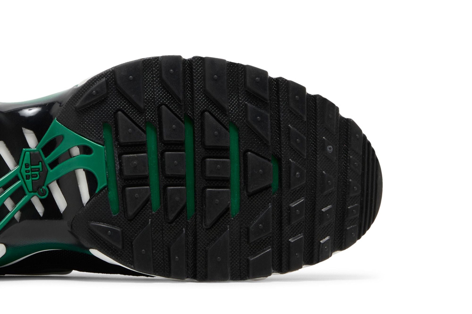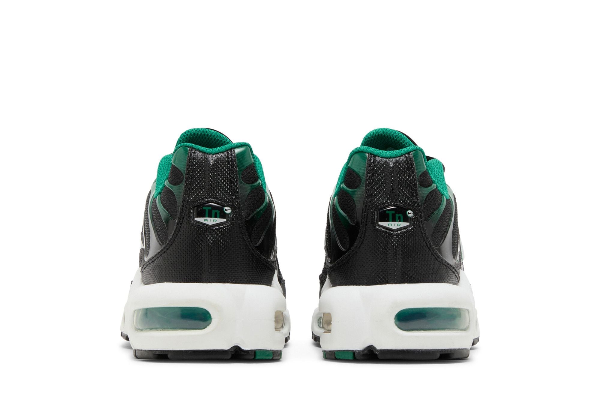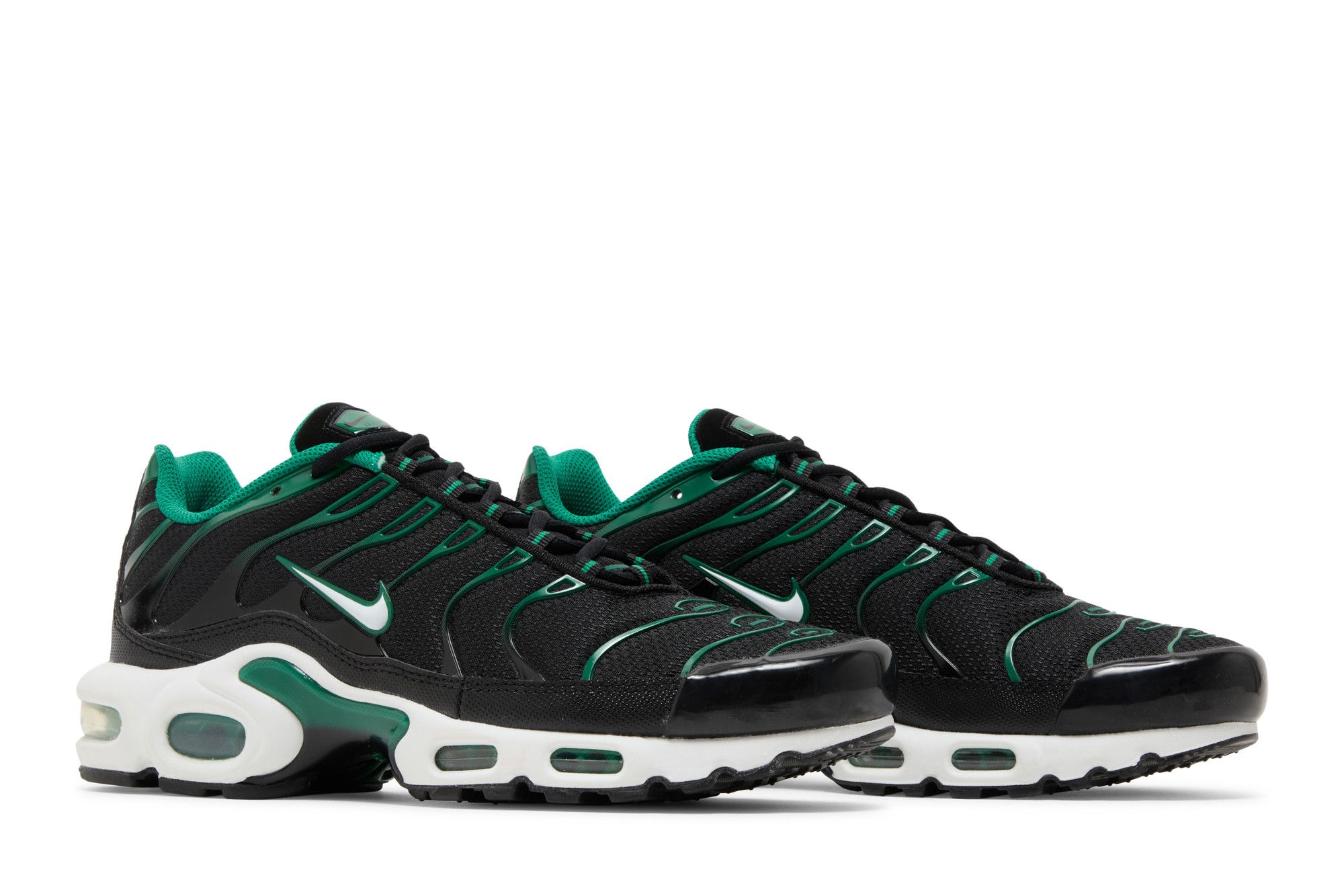 The Nike Air Max Plus Black Malachite features Sean McDowell's iconic design in an eye-catching colorway. This take on the Florida beach-inspired silhouette stands out with its glossy contrast. The upper of the Nike Air Max Plus Black Malachite is made of black knitted fabric, adorned with the signature wavy TPU cage in glossy emerald green. The upper and tongue overlays are also emerald green, as is the branding on the tongue and heel tab. The Nike Swoosh on the side panel is white with a green outline. This white is echoed on the foam sockliner, which houses visible pockets of Tuned Air. The black rubber outsole features green pods and green Tuned Air branding. The most distinctive element is the glossy whale tail plate in the center of the foot.