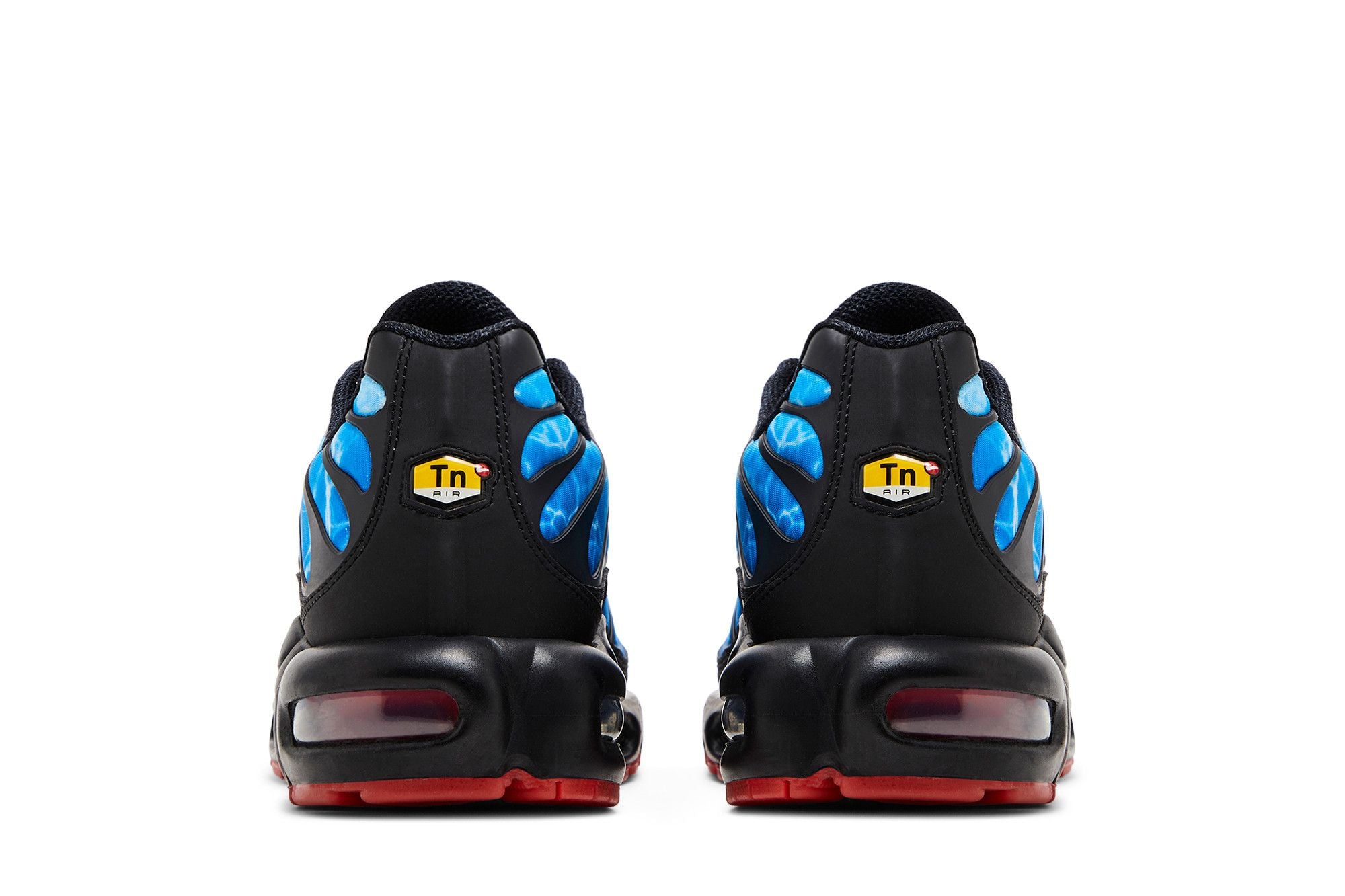 The Nike Air Max Plus Shark Attack is a bold and eye-catching addition to the iconic Air Max line. It features a sleek black upper with Baltic Blue accents that evoke the image of a shark cutting through dark waters, drawing inspiration from the ocean's most feared predator. Its silhouette incorporates classic Air Max Plus elements, known for their wavy TPU overlays, which in this version resemble shark fins, reinforcing the aquatic theme. Nike's Air cushioning technology provides exceptional support and responsiveness. The upper combines breathable mesh and durable synthetic materials for ventilation and durability. The Shark Attack colorway pays homage to the Air Max Plus' legacy of sneaker design innovation.