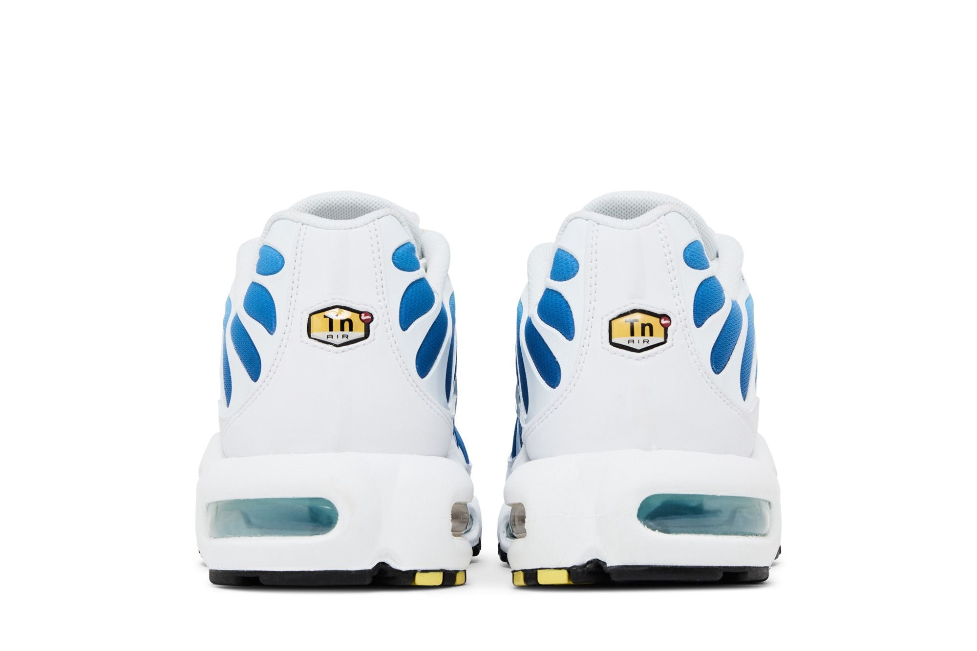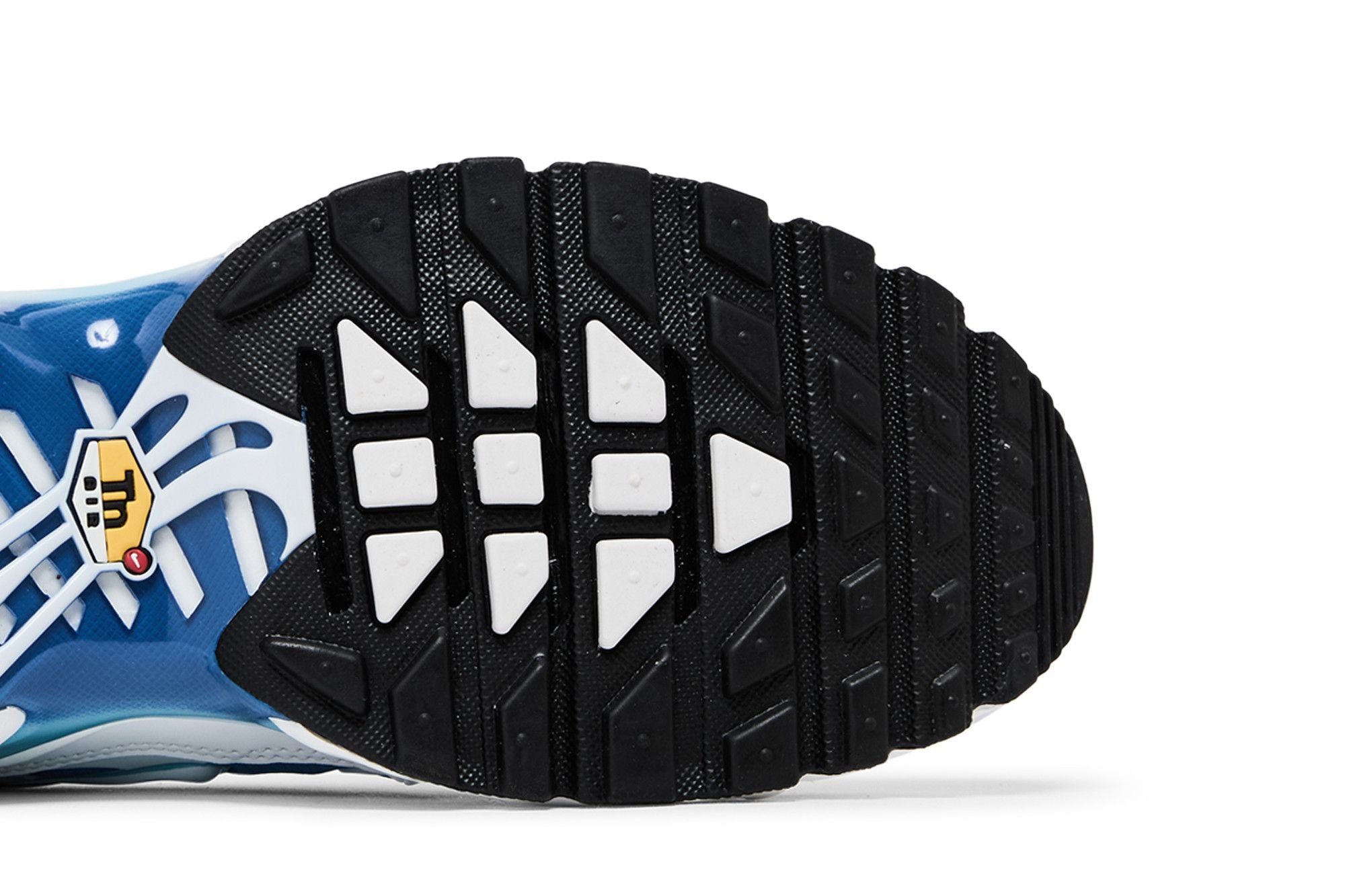 The Nike Air Max Plus Sky Blue is a sneaker featuring Tuned Air technology and staying true to the original 1998 design. This version features a Sky Blue fabric upper for flexibility and breathability. The blue color fades from the laces at the top to a darker shade toward the base. Energetic white lines run from the laces to the base of the upper in a very eye-catching wavy pattern. The Nike Swoosh appears on the midsole in white with a blue outline. White leather completes the base and heel, where a yellow Tuned Air logo is featured. Air Max units are visible under the heel and forefoot.