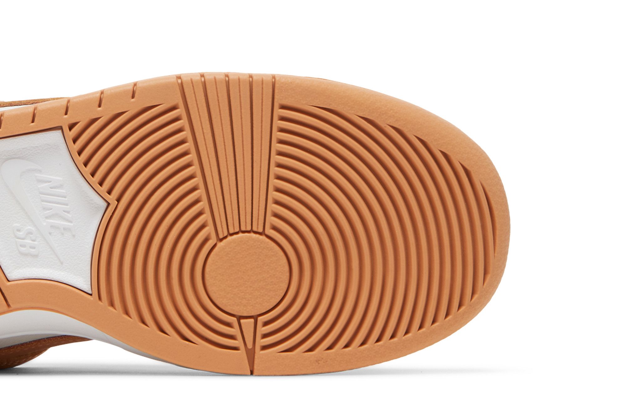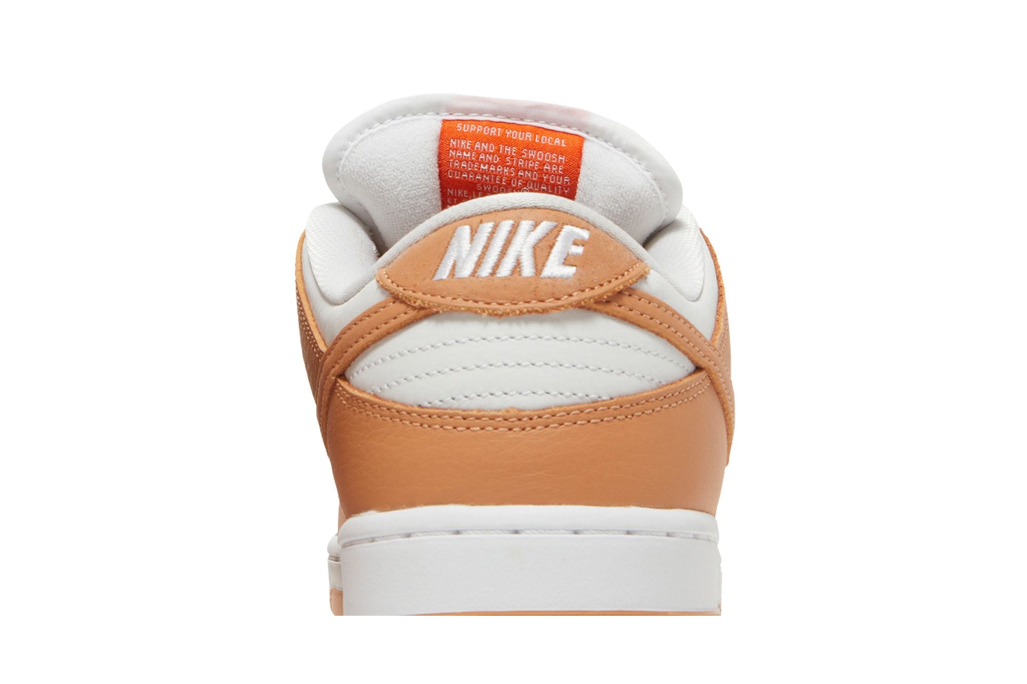 Part of Nike's "Orange Label" series, the SB Dunk Low Pro ISO Light Cognac features an orange-pink and white color scheme. The outsole of the shoe is white, while the rest of the piece features leather patches in both colors. The tongue is a mix of pink-orange and white while the laces are purely white.