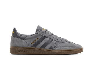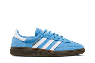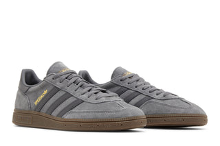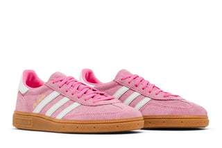 L'adidas Handball Spezial « Semi Green Spark » présente une silhouette basse avec une tige en daim vert qui enveloppe la base, la languette, le talon et les empiècements. Des détails rose vif, comme les 3 bandes dentelées, les lacets, la languette griffée et le talon en cuir, créent un contraste saisissant. La semelle extérieure en caoutchouc foncé complète le design avec une touche rétro et une adhérence optimale.