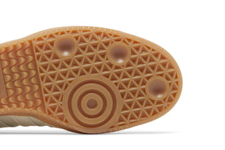 La Adidas Samba OG Aluminium Gum affiche une base en cuir grainé beige, accompagnée d'un daim ton sur ton. Les trois bandes emblématiques en cuir blanc sont présentées sur le panneau latéral et associées à la languette du talon. L'inscription dorée « Samba » sur le panneau latéral rehausse la tige tandis qu'une semelle en caoutchouc termine le modèle. Vérifiez les spécifications du produit sur Adidas