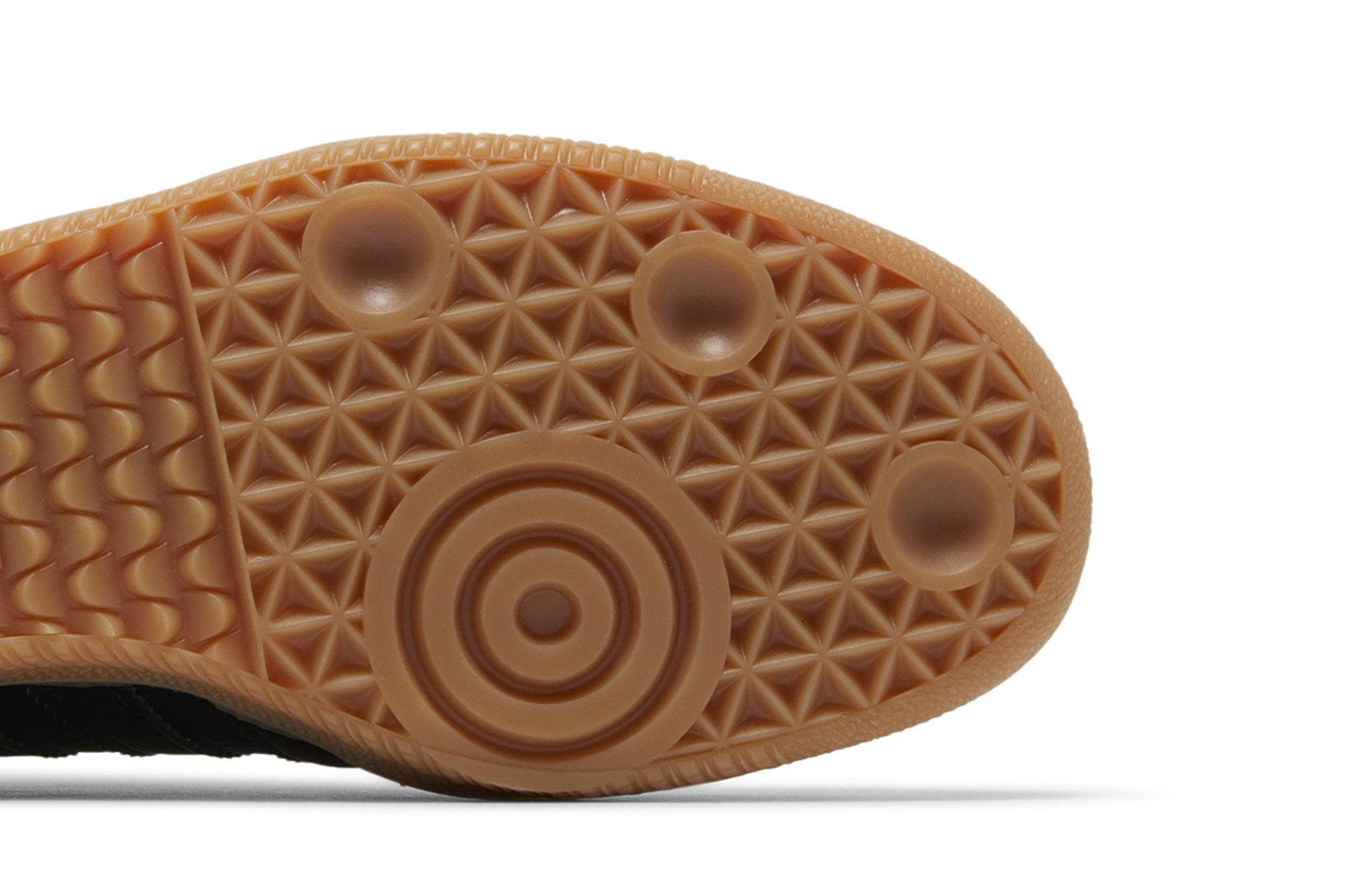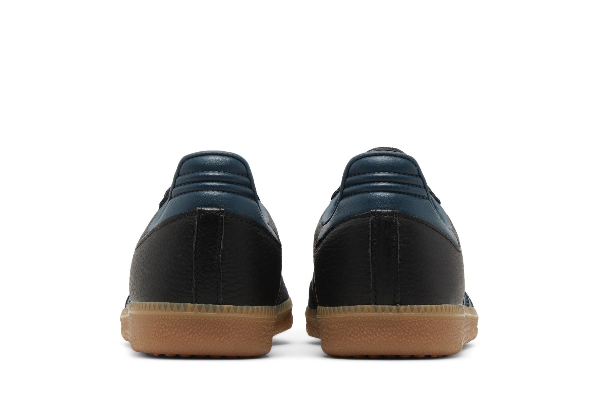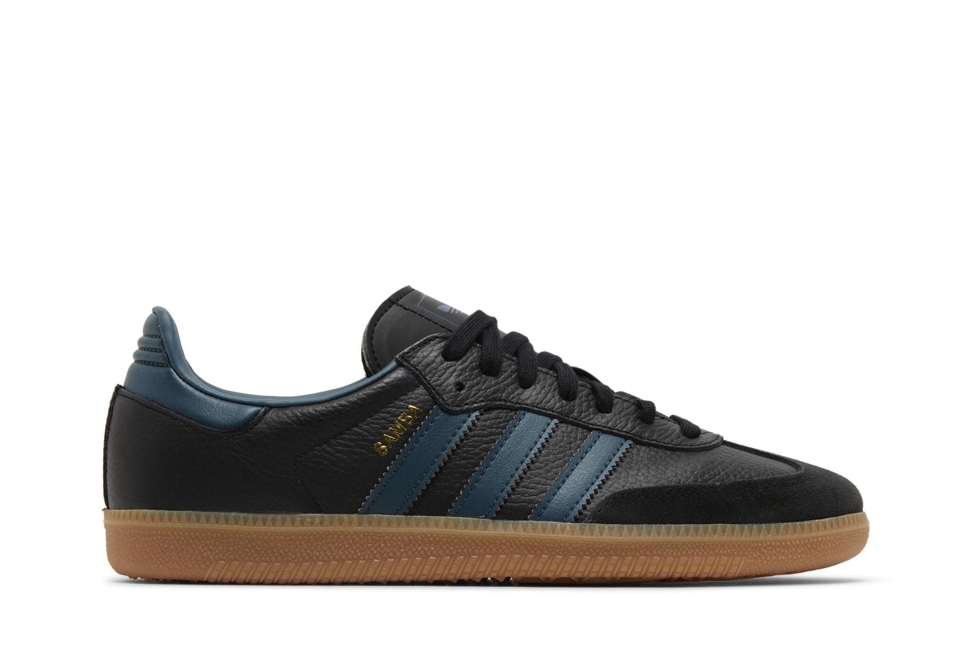 La Samba arbore un coloris noir et bleu, avec une semelle en caoutchouc marron clair. Confectionnée en cuir, elle arbore des détails bleus sur le flanc et un logo « Samba » doré. Les bandes latérales classiques et la tige en cuir contribuent à son design emblématique.