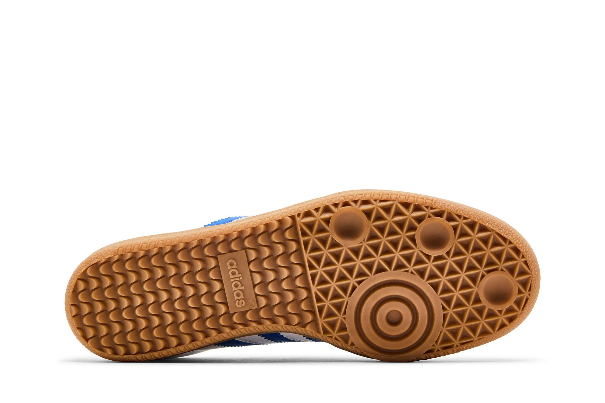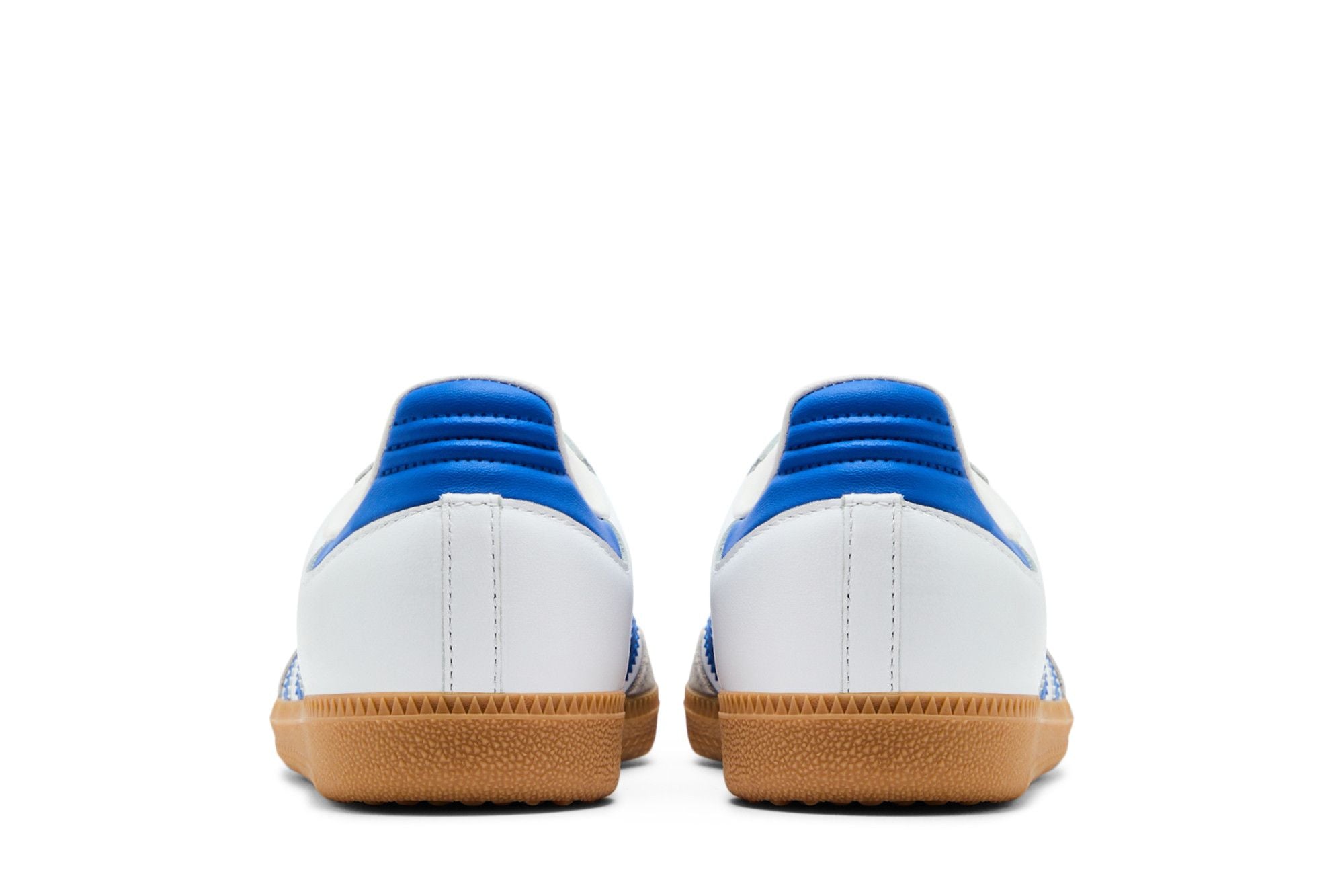 La Samba est une sneaker élégante et polyvalente, confectionnée en matière synthétique blanche avec des détails bleus. Sa semelle en caoutchouc marron clair arbore un design classique à trois bandes, avec des bandes horizontales bleues sur le côté. L'arrière de la chaussure est orné d'un empiècement bleu, tandis que le logo « Samba » est imprimé en doré sur le côté. La sneaker est complétée par un lacet blanc et le lettrage classique de la marque sur la languette.