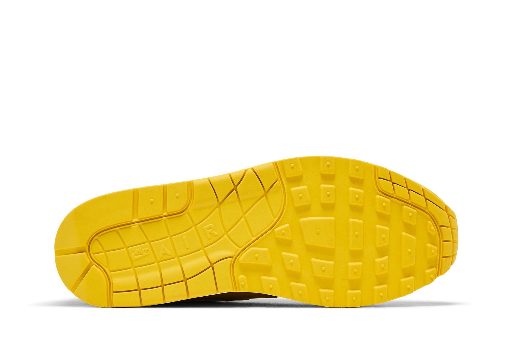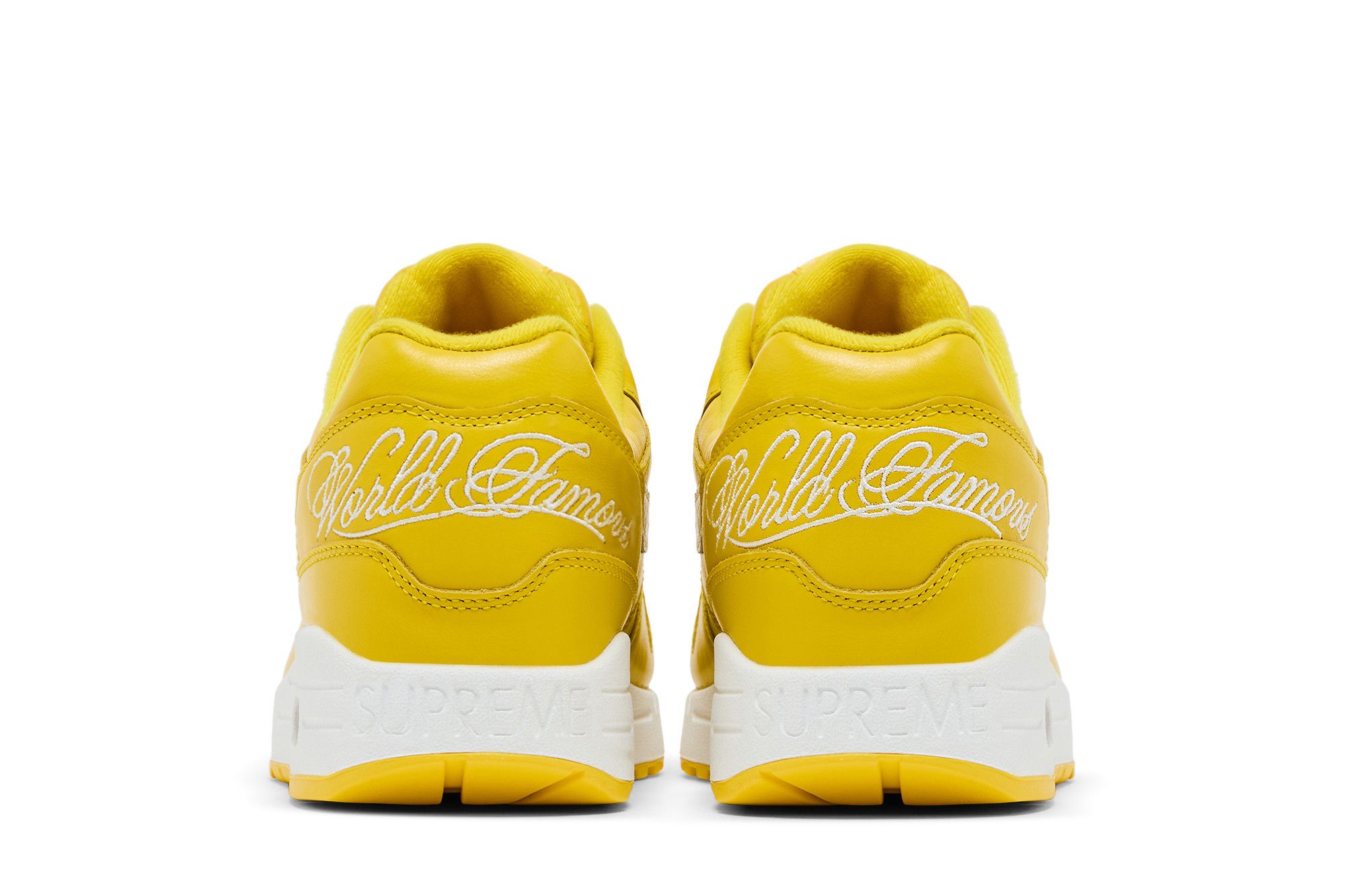 La Supreme x Nike Air Max 1 '87 SP « Speed Yellow » fait partie d'un pack exclusif de quatre coloris, avec une tige en cuir jaune superposée et un Swoosh en cuir blanc effet peau de serpent . Un mini-Swoosh brodé orne le côté avant, tandis que les détails signature Supreme incluent des passants de lacets personnalisés , une étiquette co-marquée sur la languette et la broderie « World Famous » au talon. Une semelle intermédiaire en polyuréthane blanc avec unité Air visible au talon offre un amorti léger à chaque pas.