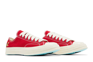 La Converse Chuck 70 Low GOLF le FLEUR* Darryl Salsa est une sneaker issue de la collaboration entre Converse et GOLF le FLEUR*, la marque de Tyler, The Creator. Cette édition limitée présente un design minimaliste avec une tige en toile de 12 onces en vert, enrichie d'un subtil motif graphique de « Darryl », la mascotte de la marque, sur le panneau latéral. L'intérieur est doublé de coton 8 onces pour plus de confort. La semelle extérieure personnalisée présente un motif porteur audacieux, ajoutant une touche distinctive à la conception globale. Les œillets sont argentés et les lacets plats de 18 mm sont blancs hivernaux.