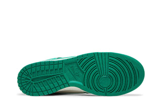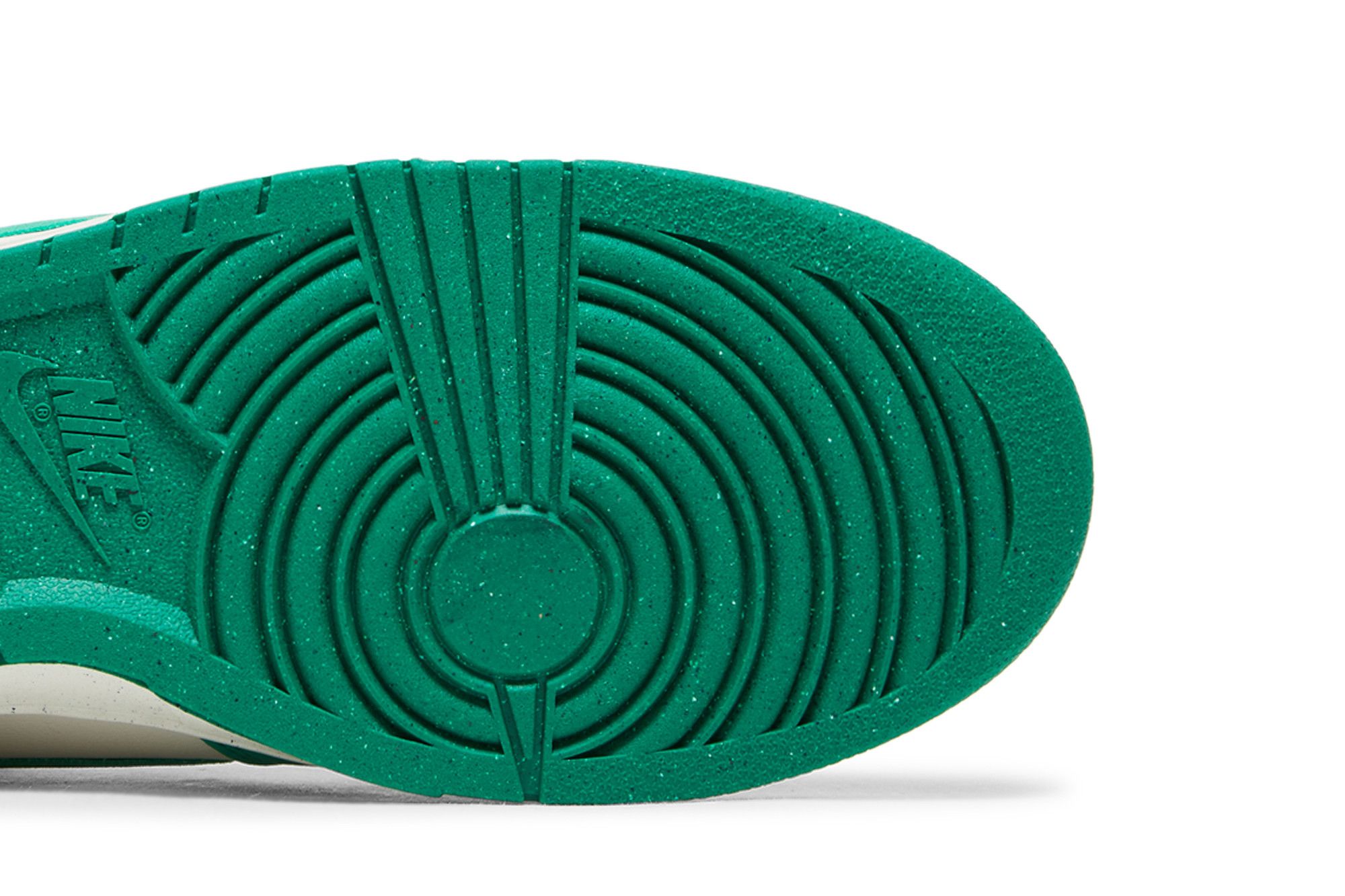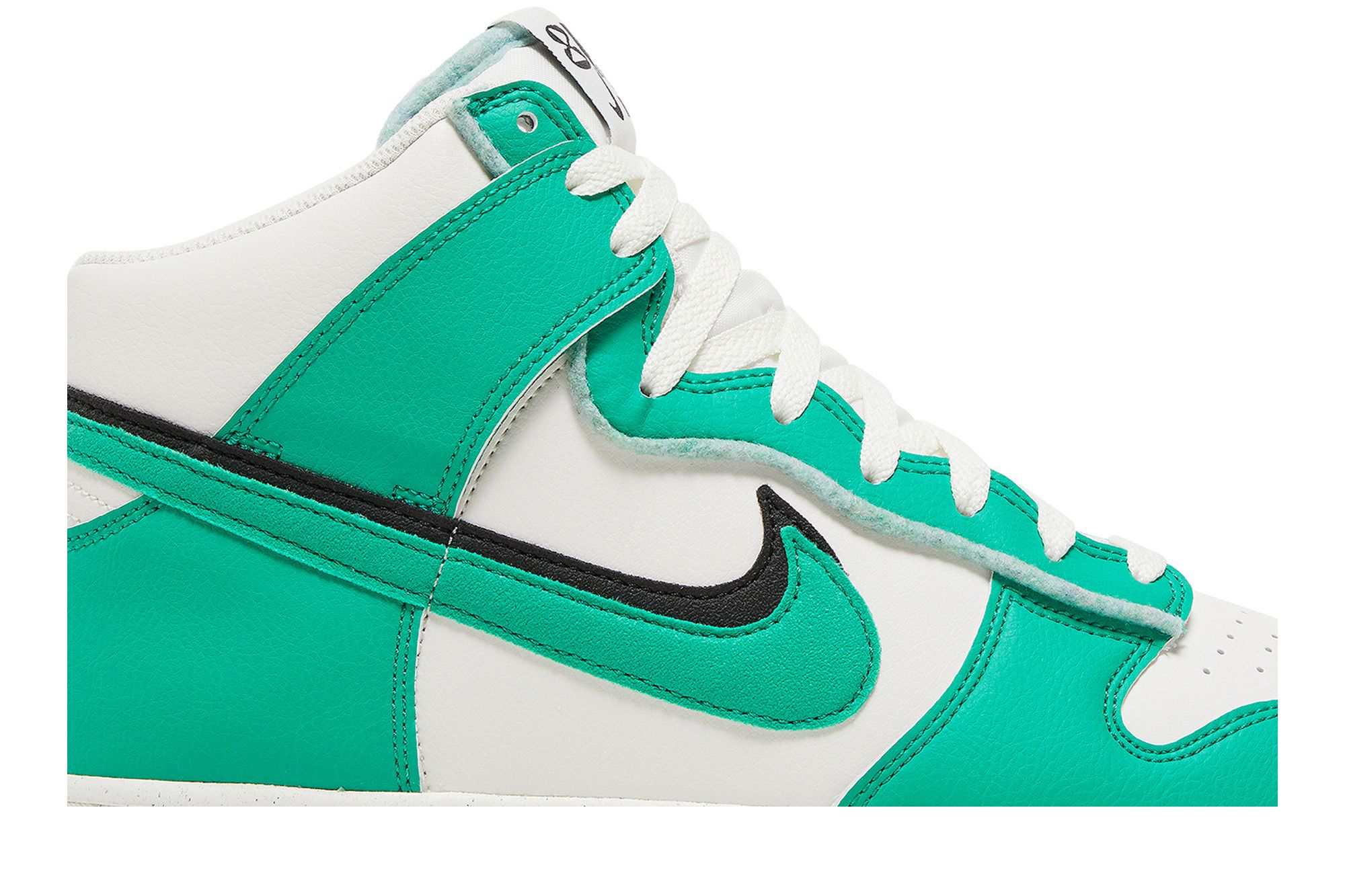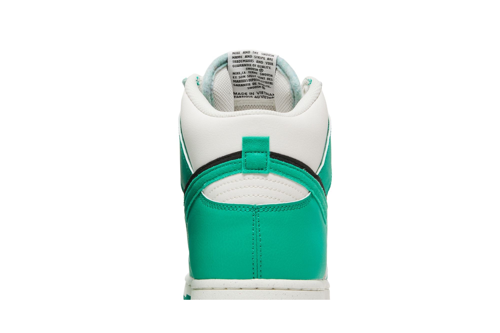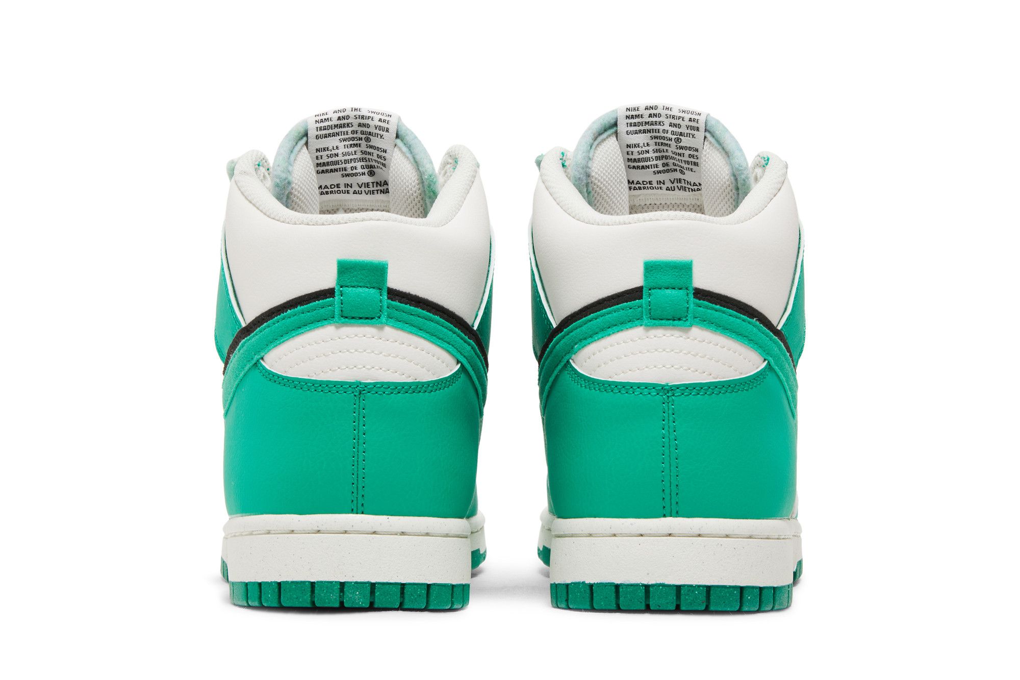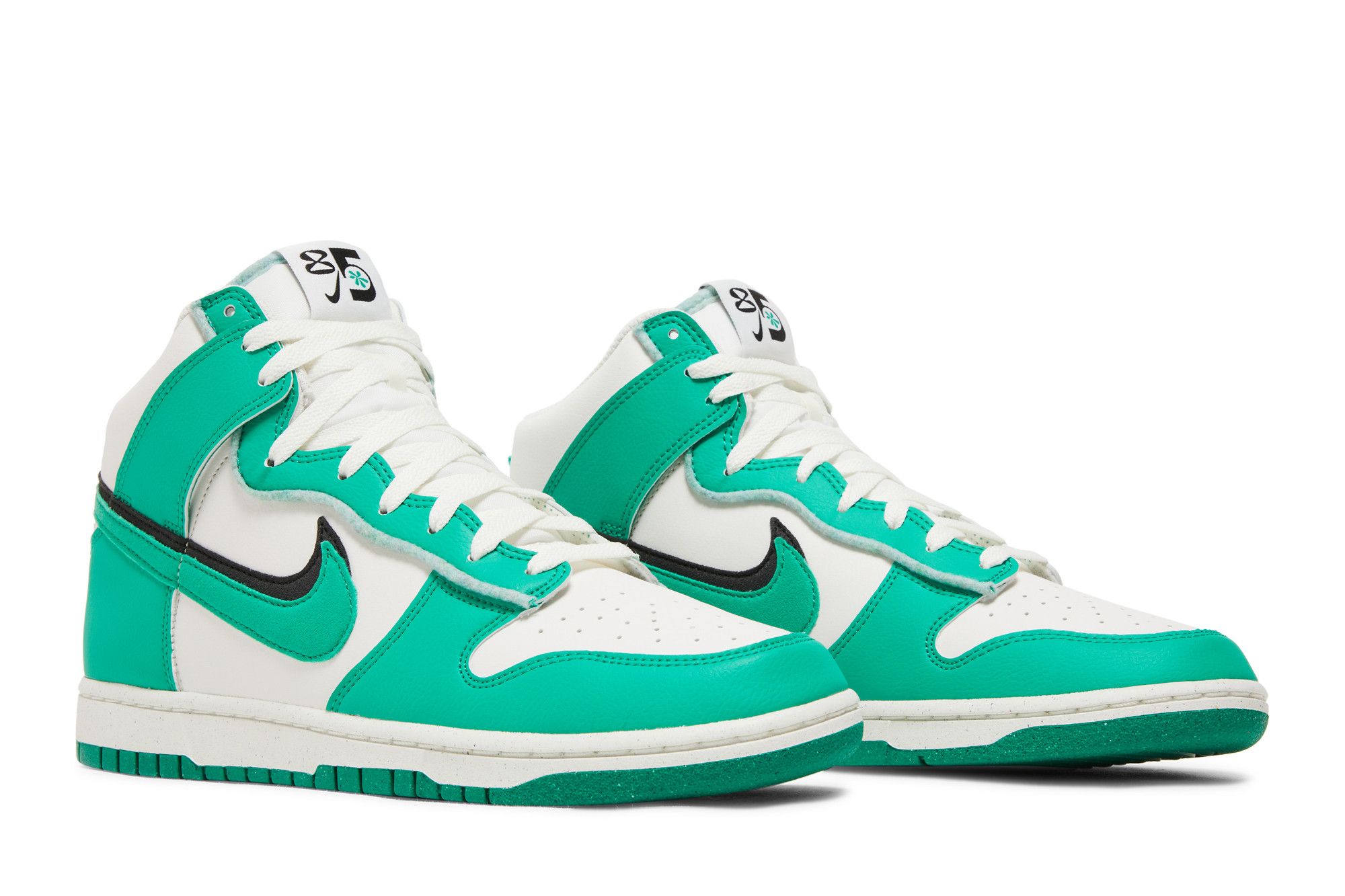 La Nike Dunk High Stadium Green présente une tige en cuir blanc avec des empiècements en cuir vert. Le double Swoosh en daim vert et noir ajoute une touche de fantaisie au design, tandis que les finitions en tissu se retrouvent le long des œillets et sur la languette. La langue comporte également l'écriture « 85 », qui fait référence à 1985, année de naissance de Dunk High. Voir toutes les spécifications sur Nike .