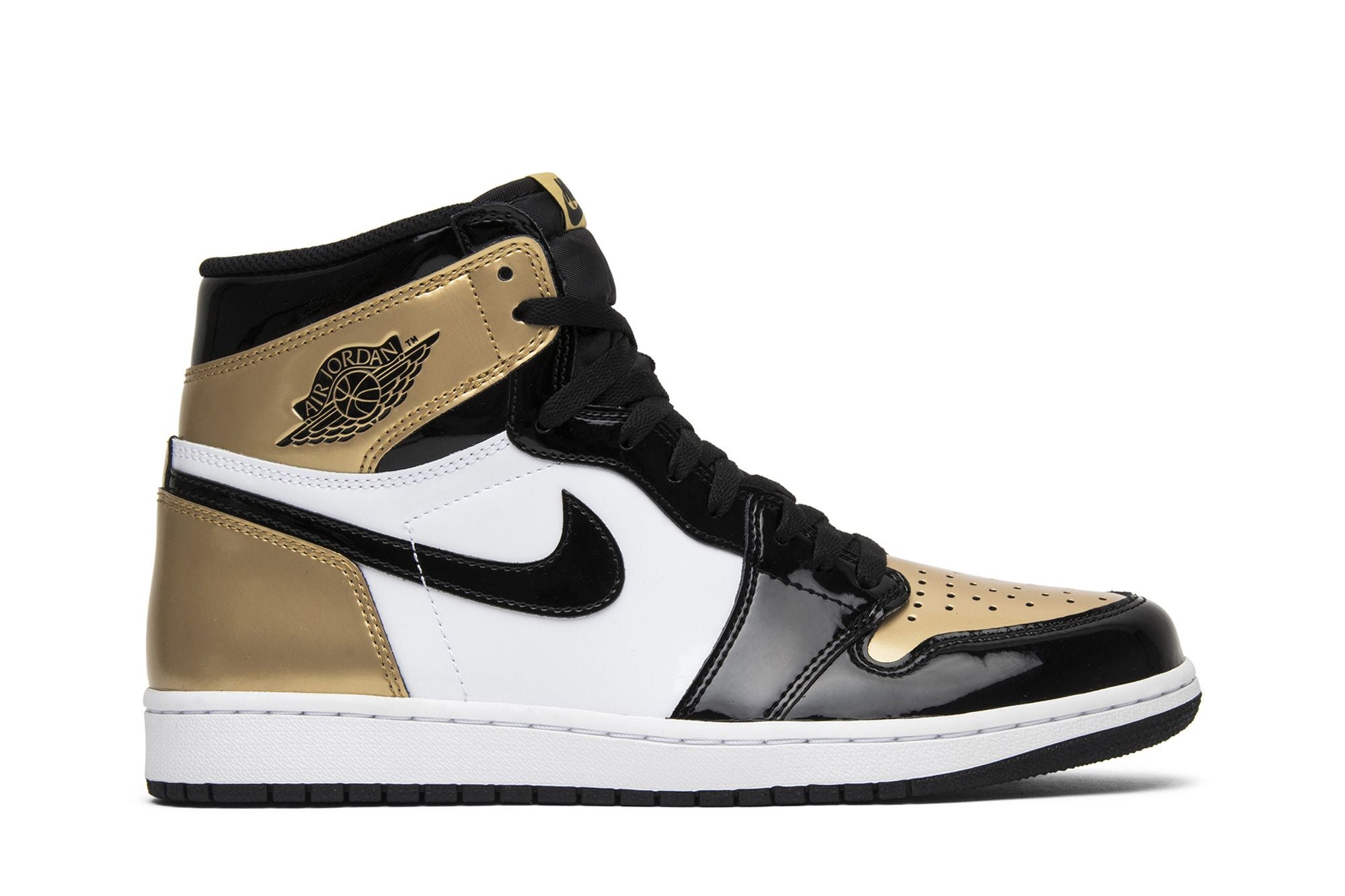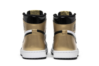 Le Jordan 1 Retro High NRG Patent Gold Toe présente un coloris noir, or métallisé et blanc sommet. La partie médiale de la sneaker est en noir/or tandis que la partie latérale est en blanc, noir et or. Voir toutes les spécifications sur Nike .