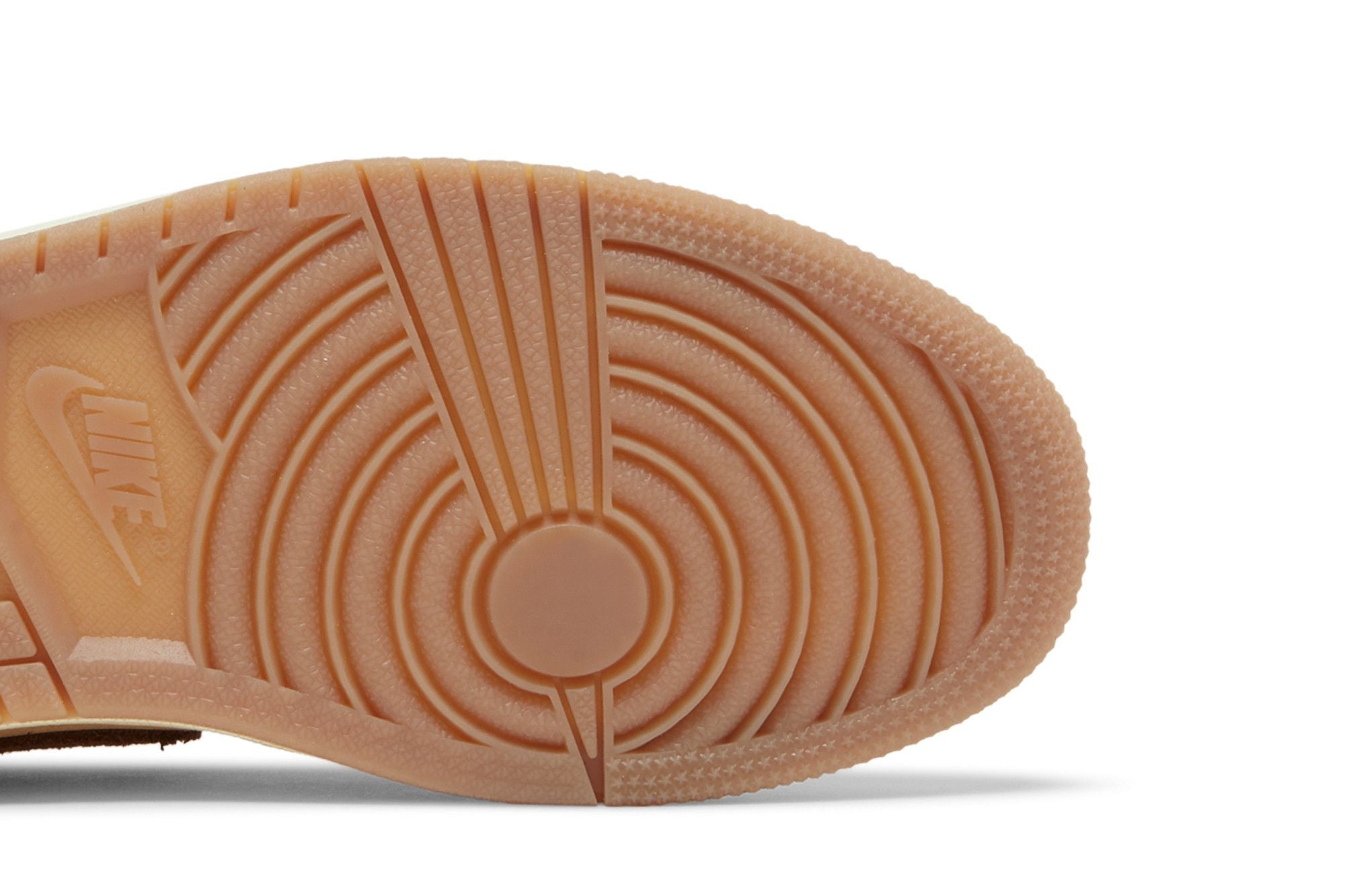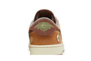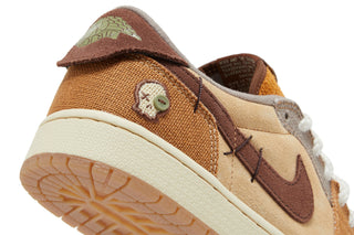 La Jordan 1 Retro Low OG Zion Williamson Voodoo affiche un design très élaboré à l'esprit poupée vaudou. On retrouve un mélange de matières à base de tissu dans des tons de marron, beige, vert, lilas et orange. Un crâne est positionné sur le talon qui renforce cette association avec la religion vaudou tandis que le branding est inversé comme le logo Wings sur le talon et l'étiquette sur la languette.