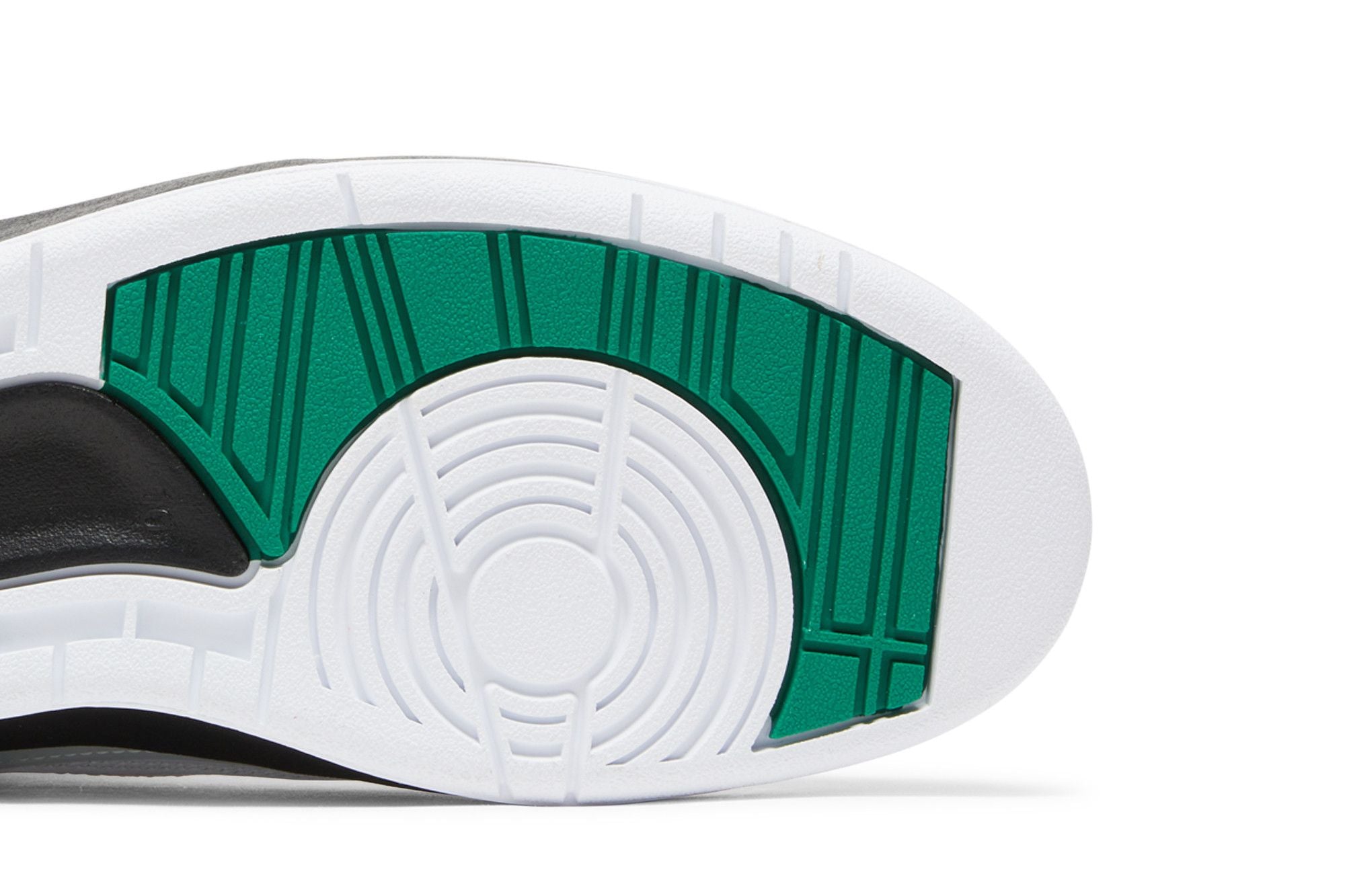 La Jordan 2 Retro Wings est une chaussure montante au design épuré, ornée d'un motif unique sur la partie arrière. Cette version a été créée en hommage à Howard White et à son influence sur le basketball. Elle présente une base en cuir blanc perforé en forme de fer à cheval autour de l'avant-pied, tandis qu'une couche supplémentaire de cuir blanc forme le garde-boue. Des empiècements en cuir texturé s'étendent du talon jusqu'à l'un des œillets, mettant en valeur un motif d'ailes complexe. Le contour de cet empiècement et du talon est d'un vert malachite métallisé, orné d'un grand logo Nike. Un logo doré apparaît sous le talon, tandis qu'un logo Air Jordan vert orne la languette. La chaussure est fabriquée en caoutchouc noir. Le motif d'ailes sur le côté est l'élément signature qui rend hommage à la contribution d'Howard White au sport et à la marque.