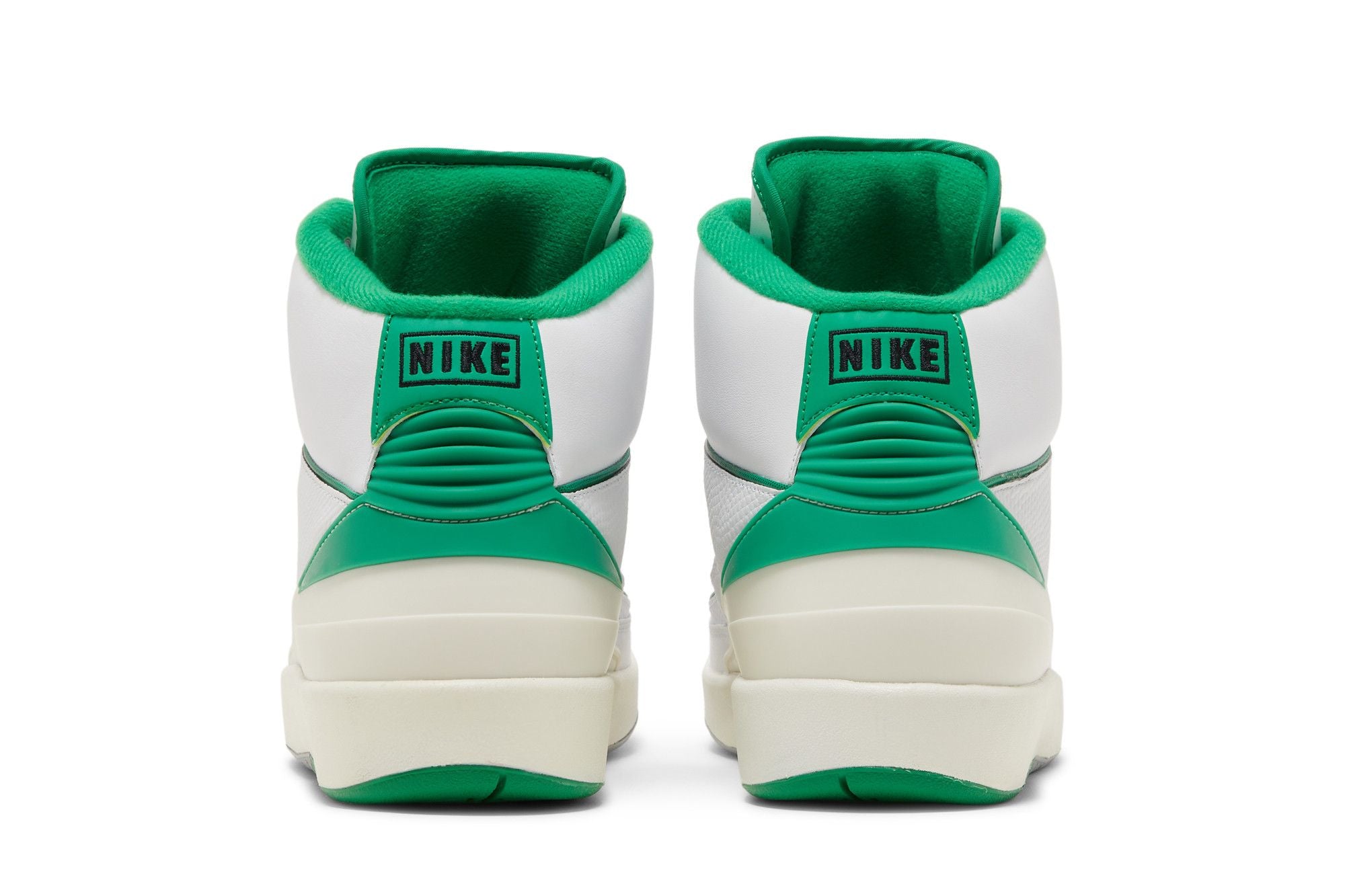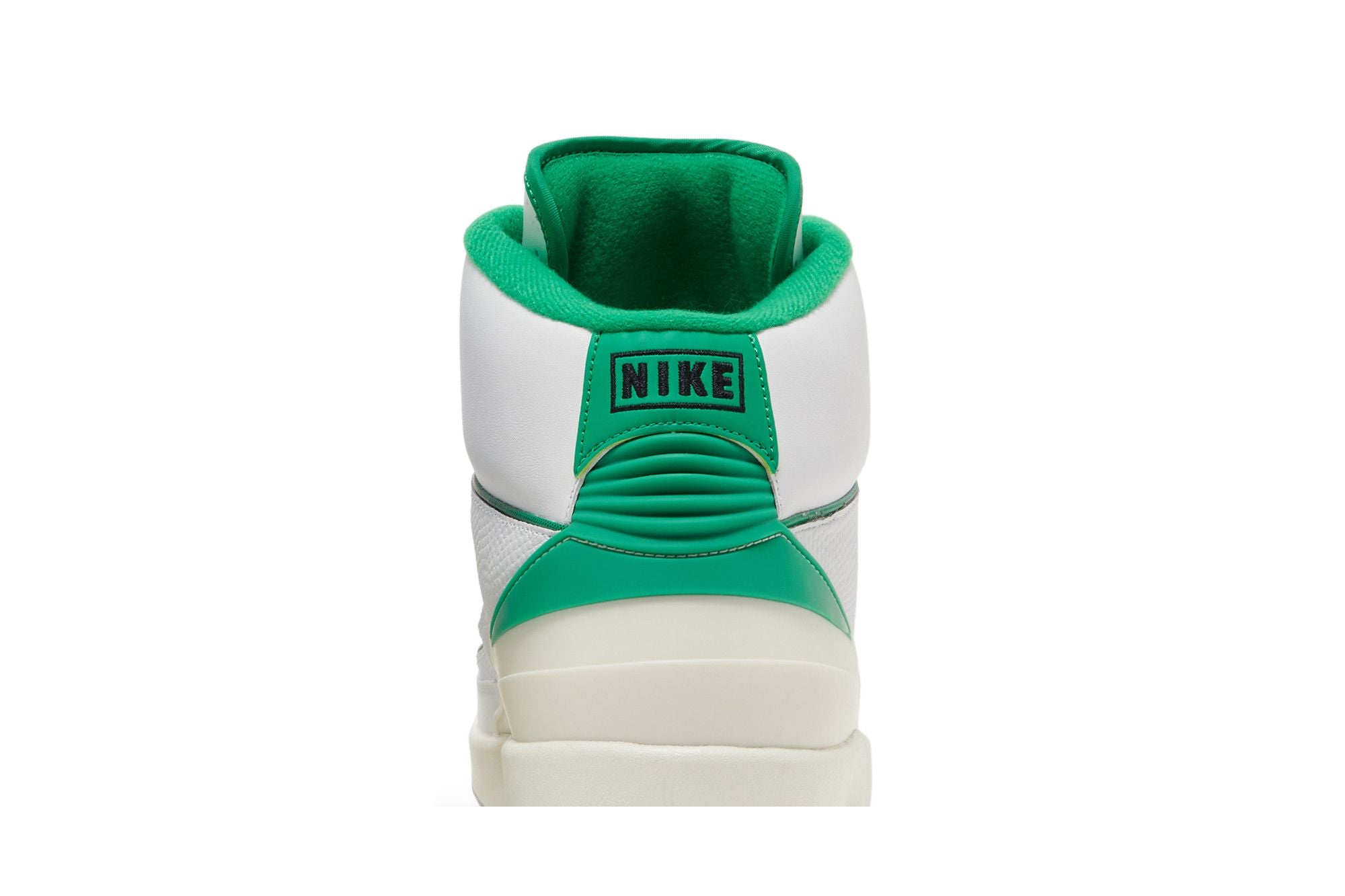 La Air Jordan 2 Retro Lucky Green arbore une tige en cuir blanc et des touches de Lucky Green sur les côtés, le talon, la semelle extérieure et la doublure. Des éléments tels que la semelle intermédiaire, la protection en plastique et les trous de lacets arborent une couleur crème inspirée des modèles vintage.