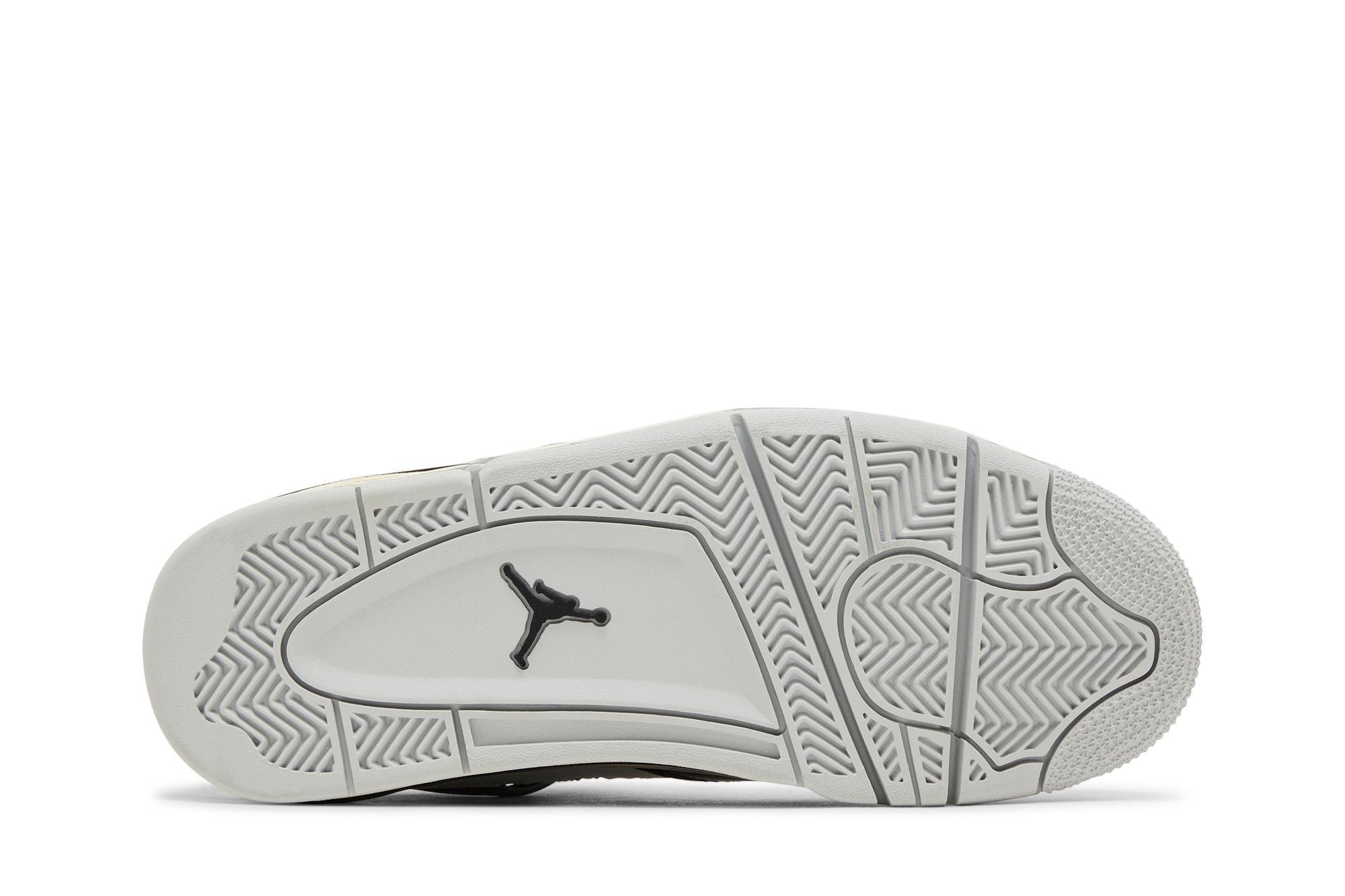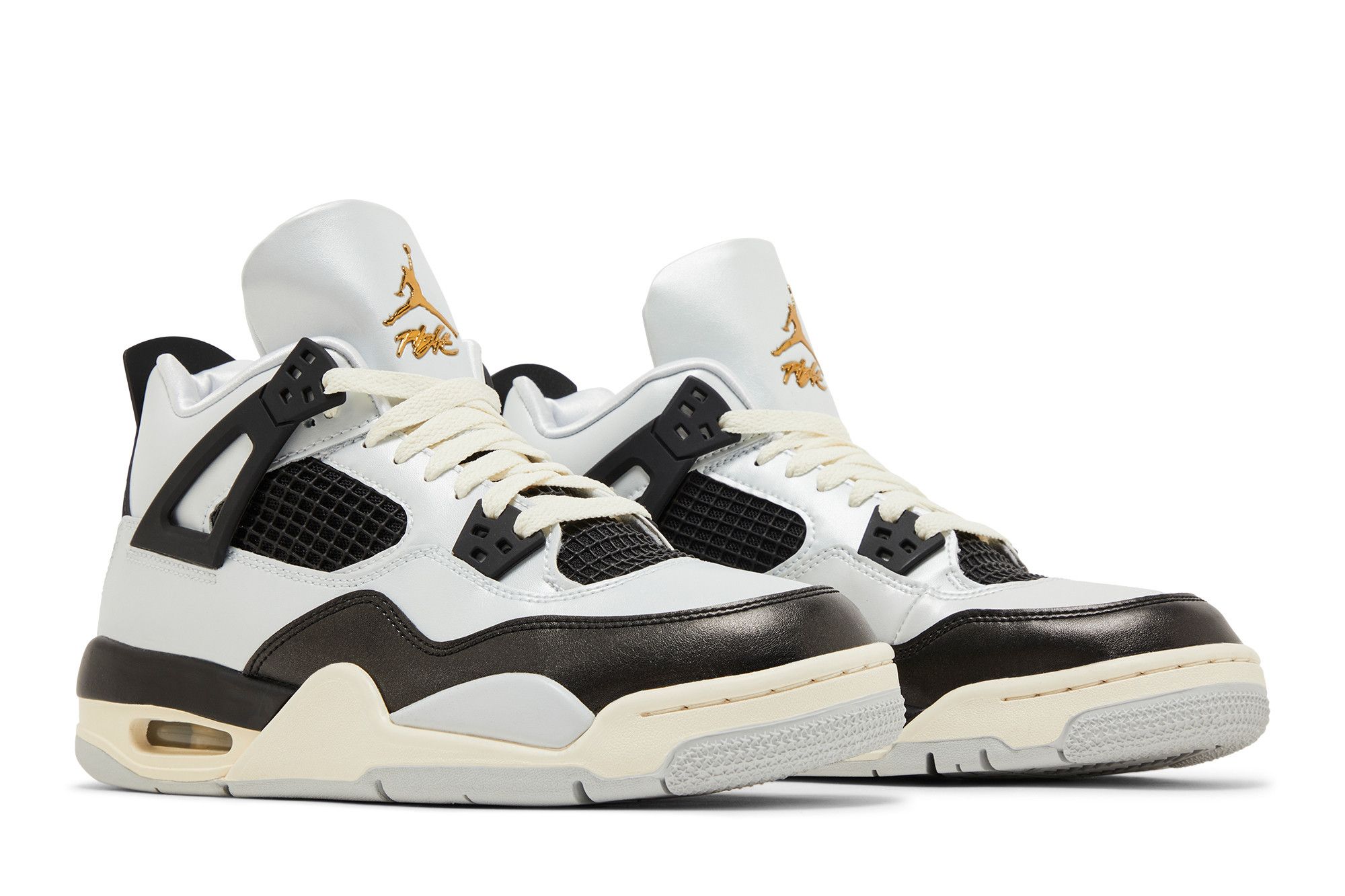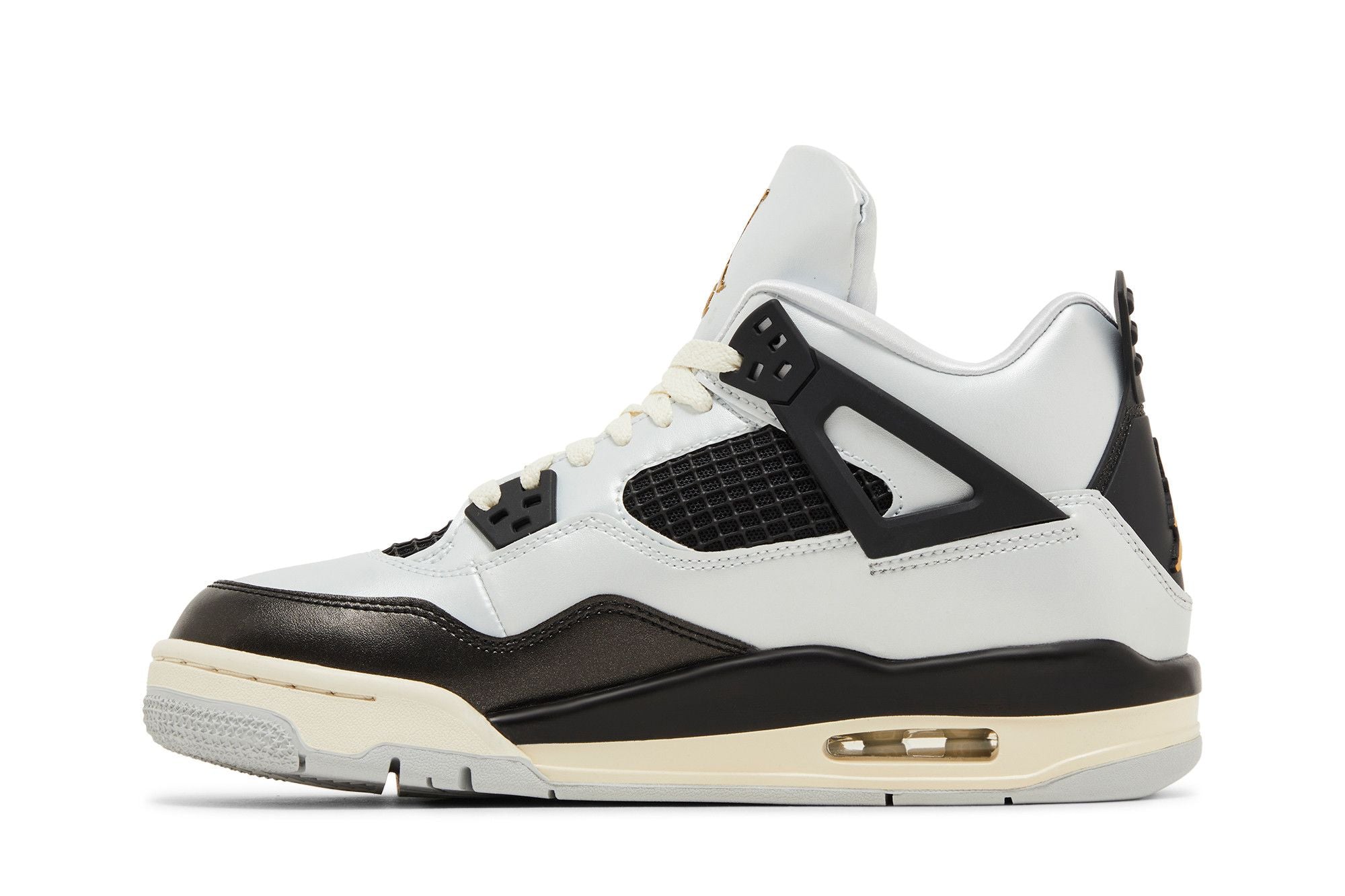Cette Jordan 4 Retro Platinum Gold présente une base en cuir Platinum White qui sert de toile de fond aux accents noirs. Pour donner plus de contraste, les éléments dorés tels que le symbole jumpman sur la langue.
