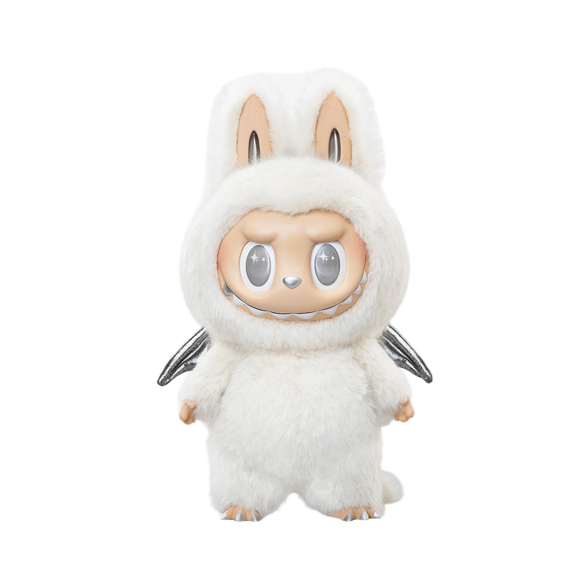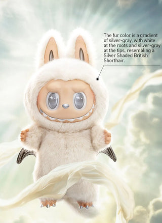 Sa douce robe blanche, aux reflets gris argenté rappelant celle d'un British Shorthair Silver Shaded, enveloppe un corps orné de détails argentés : dents, truffe, griffes, yeux et même sa queue articulée, parfaite pour maintenir la posture. Son expression espiègle et ses yeux mobiles confèrent à Labubu une vivacité irrésistible.