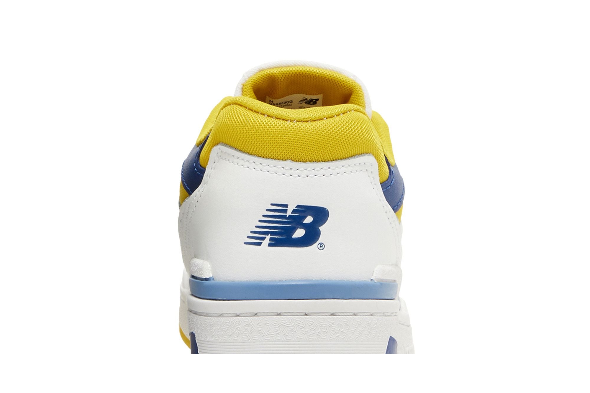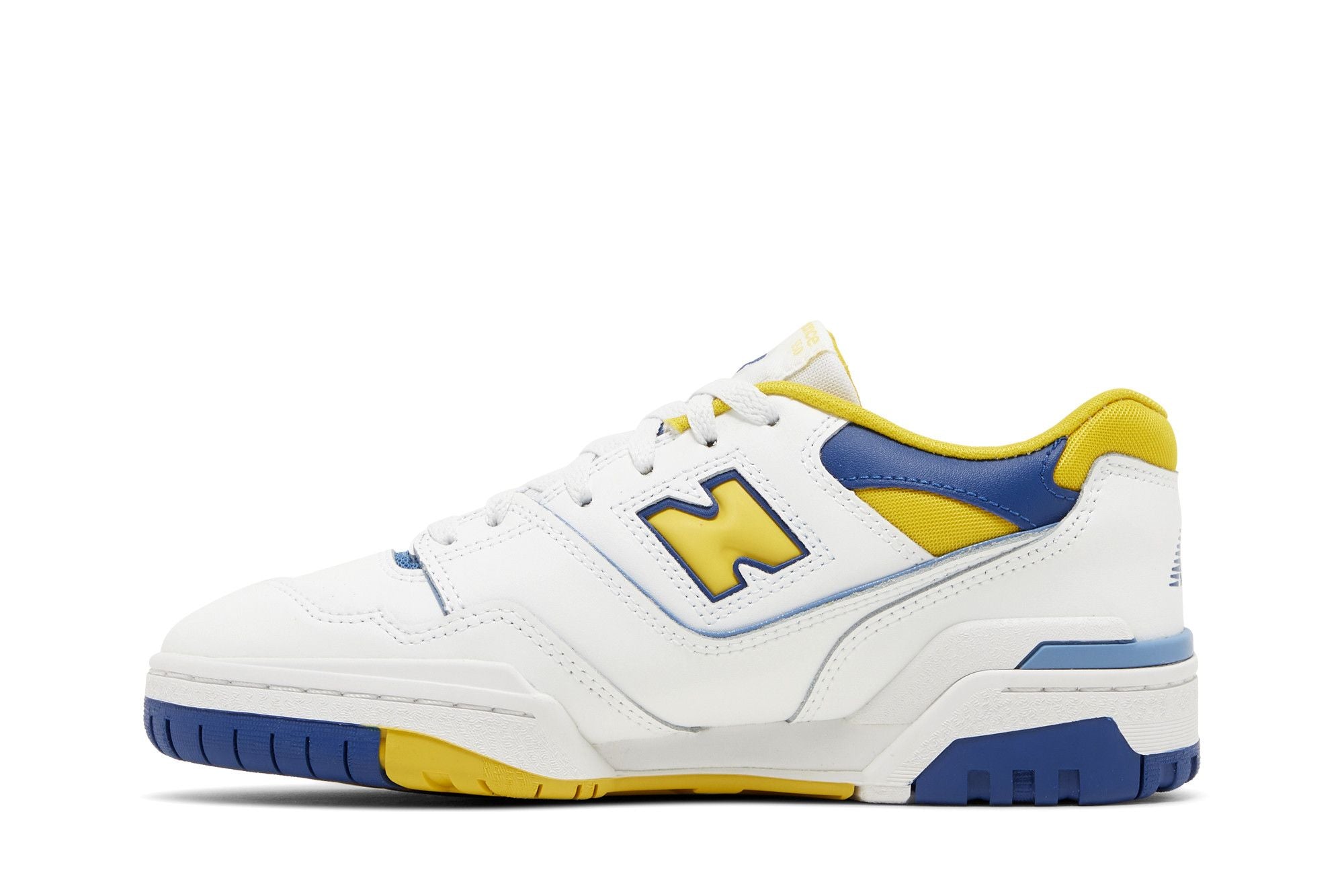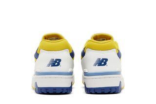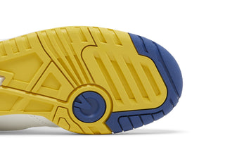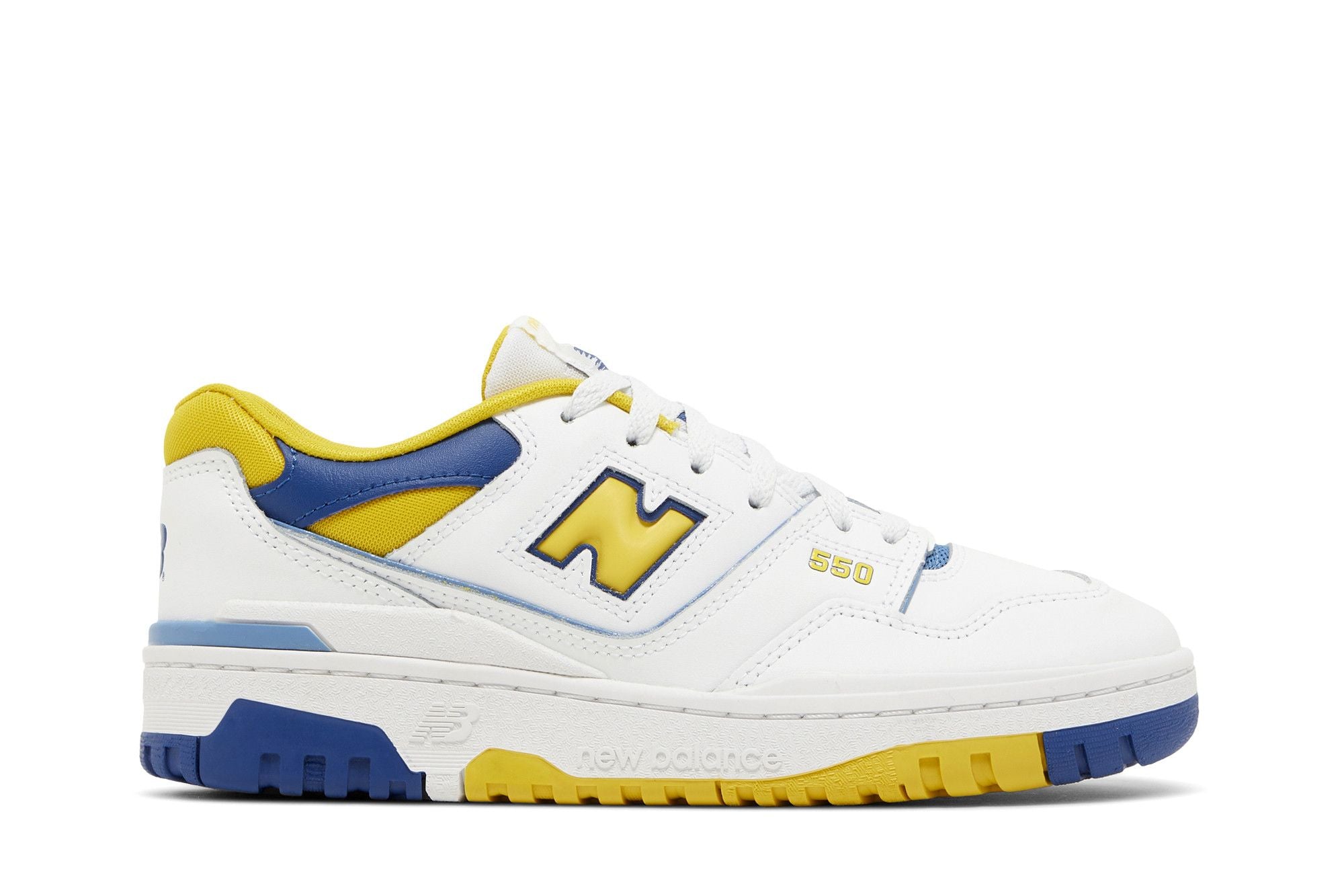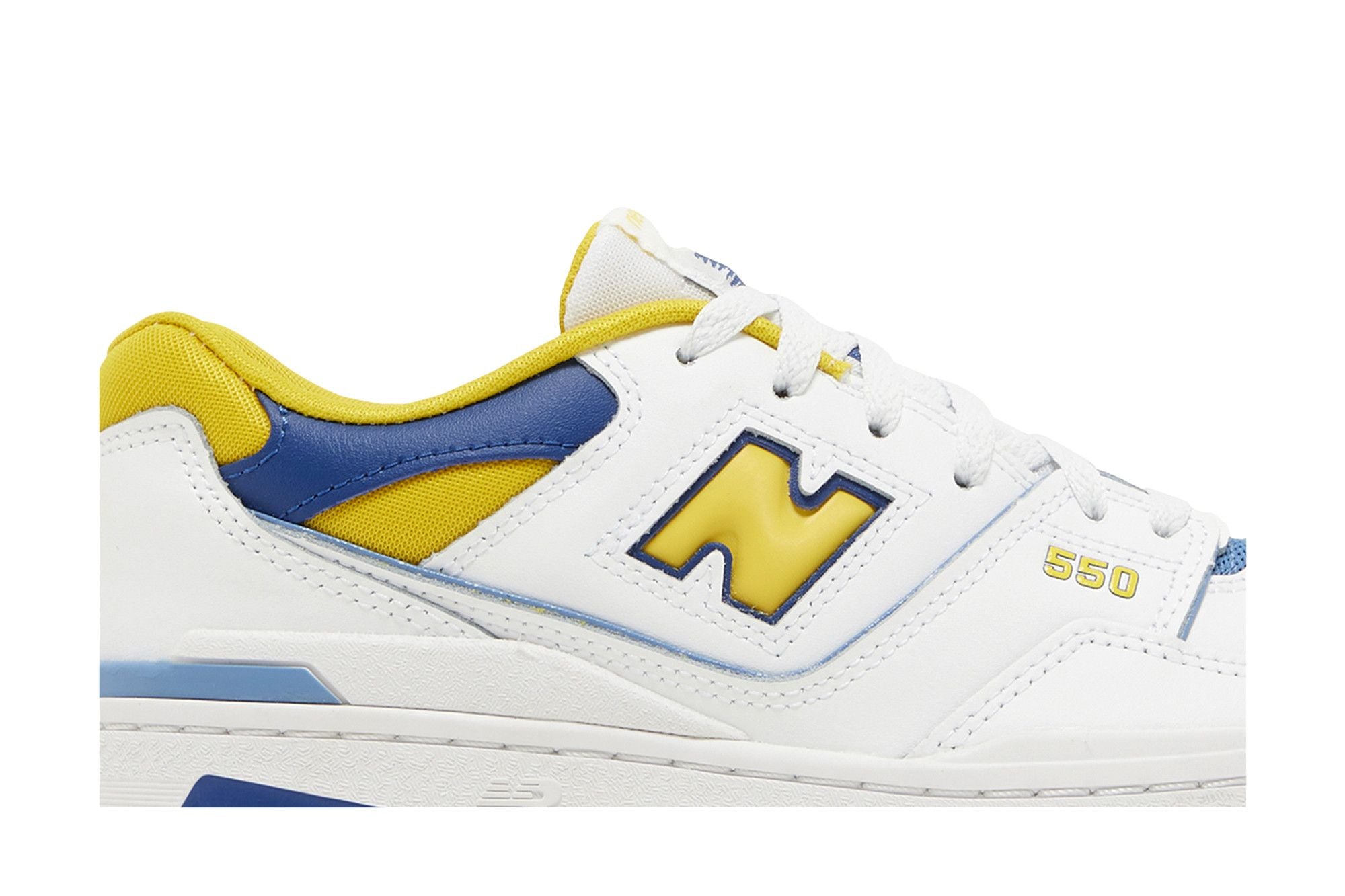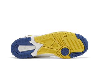 La New Balance 550 White Honeycomb présente une structure mixte de cuir blanc, jaune et bleu. Le « N » signature du logo est orné de jaune et complète la silhouette avec la semelle extérieure bicolore.