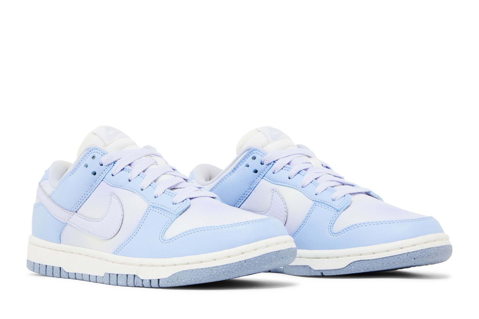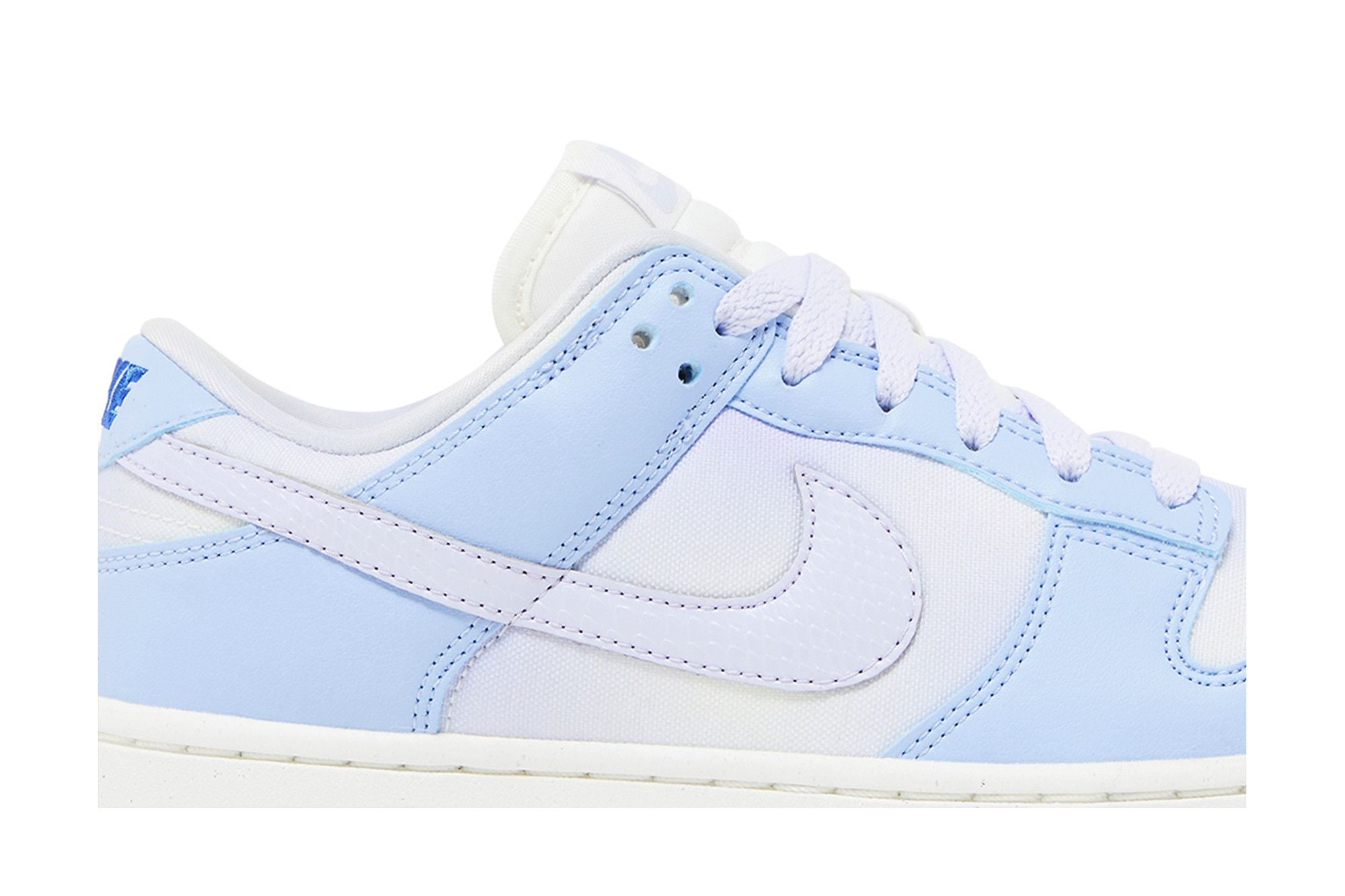 La Nike Dunk Low White Blue Airbrush propose une base en tissu brillant qui alterne entre le bleu et le blanc. Divers éléments en cuir bleu clair ornent l'ensemble de la chaussure. Un logo swoosh violet clair avec un motif « peau de serpent » ajoute une touche finale au design. Voir toutes les specs sur Nike