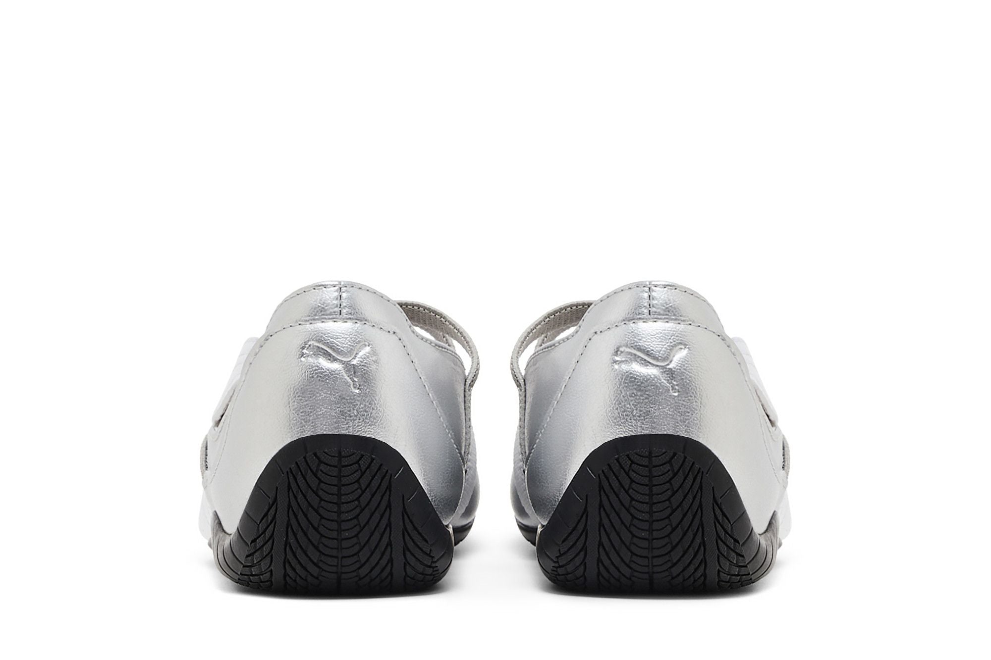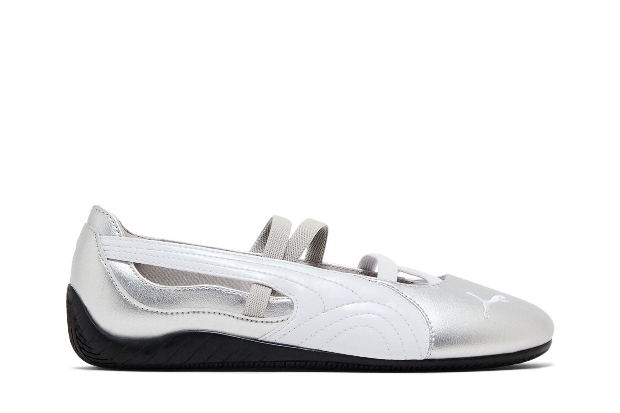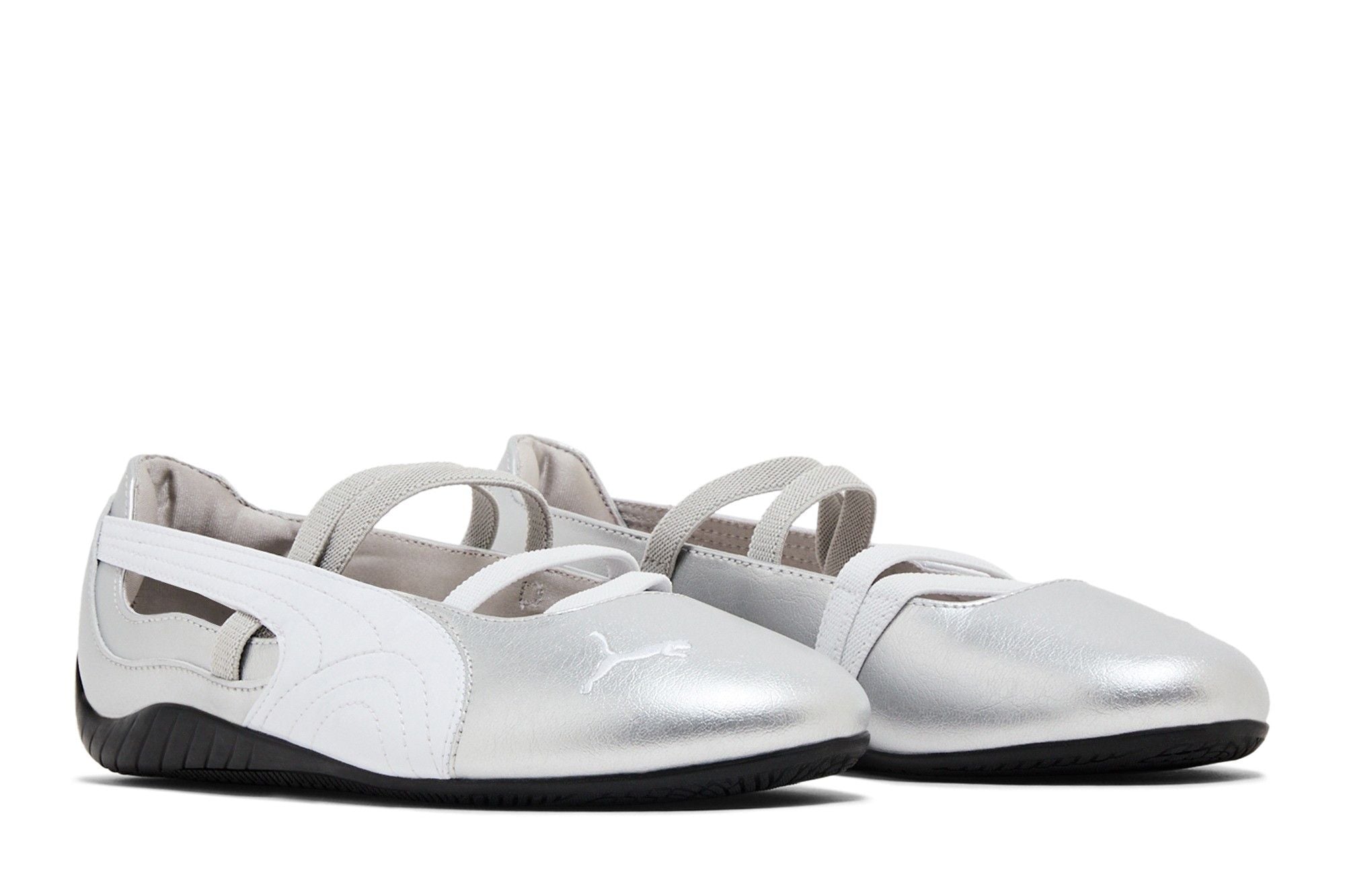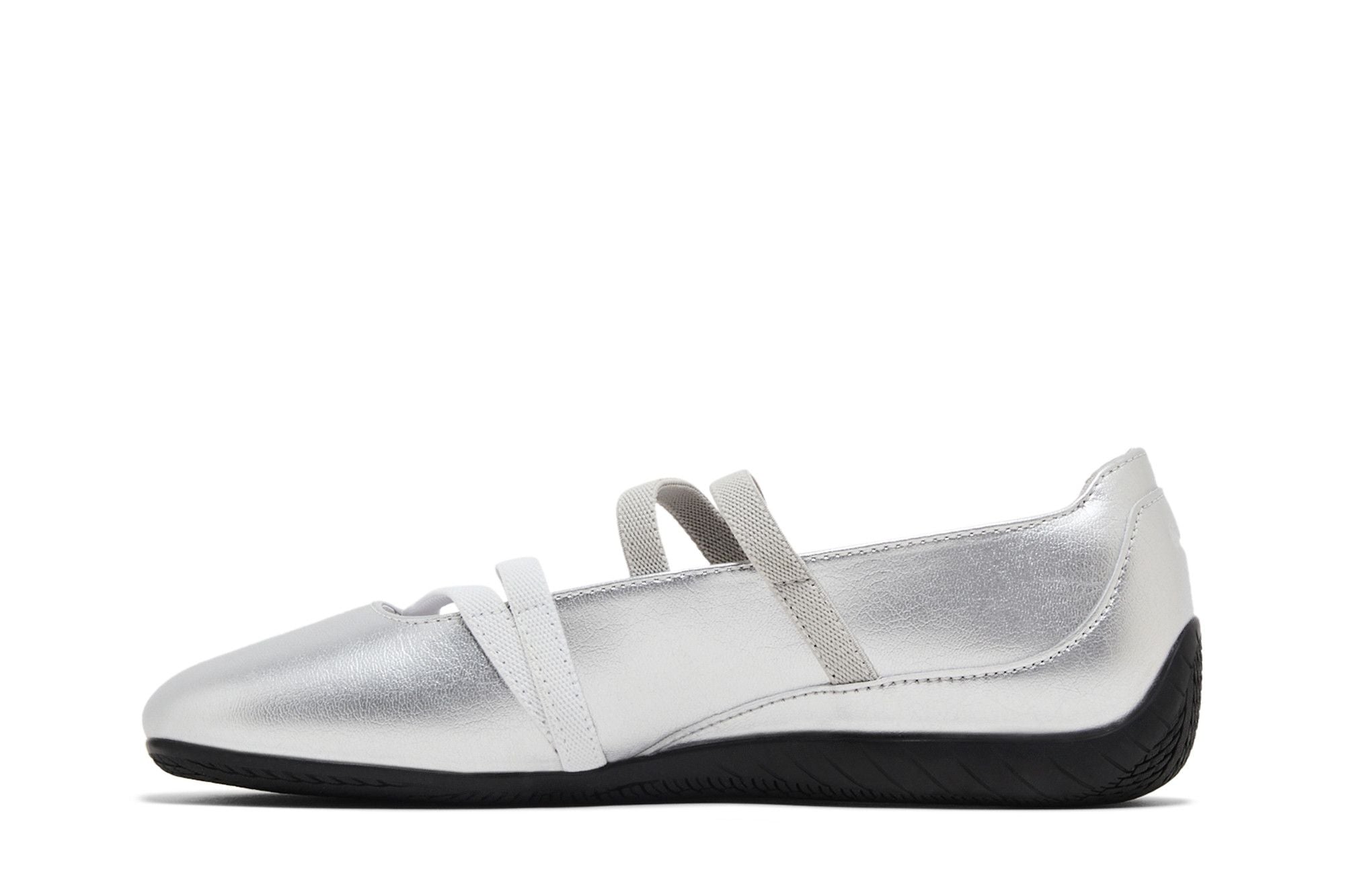 La Puma Speedcat Ballet Silver présente un design élégant et une finition de haute qualité. Elle est dotée d'une tige métallique argentée ornée de la bande emblématique, de bandes élastiques sur le cou-de-pied et du logo PUMA Cat brodé. L'association de détails blancs et d'une semelle extérieure en caoutchouc léger assure un ajustement confortable et une excellente adhérence. La Puma Speedcat Ballet Silver allie style et technologie, avec une touche d'inspiration Formule 1 et un design évoquant le ballet.