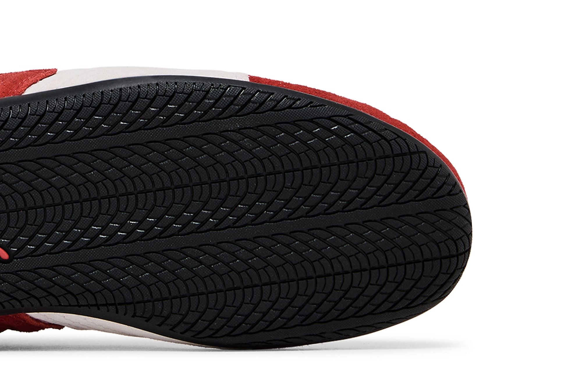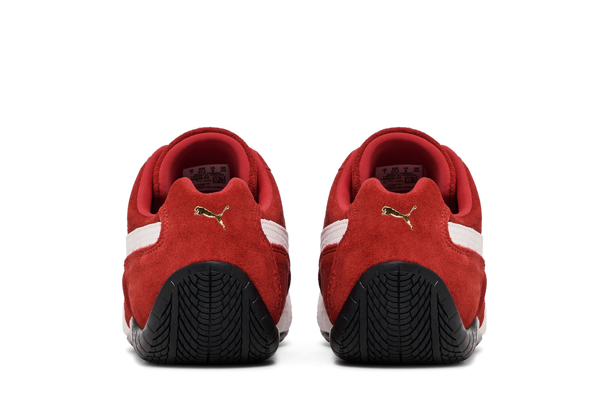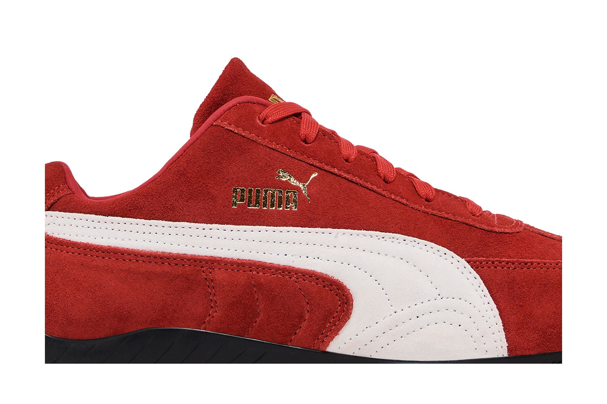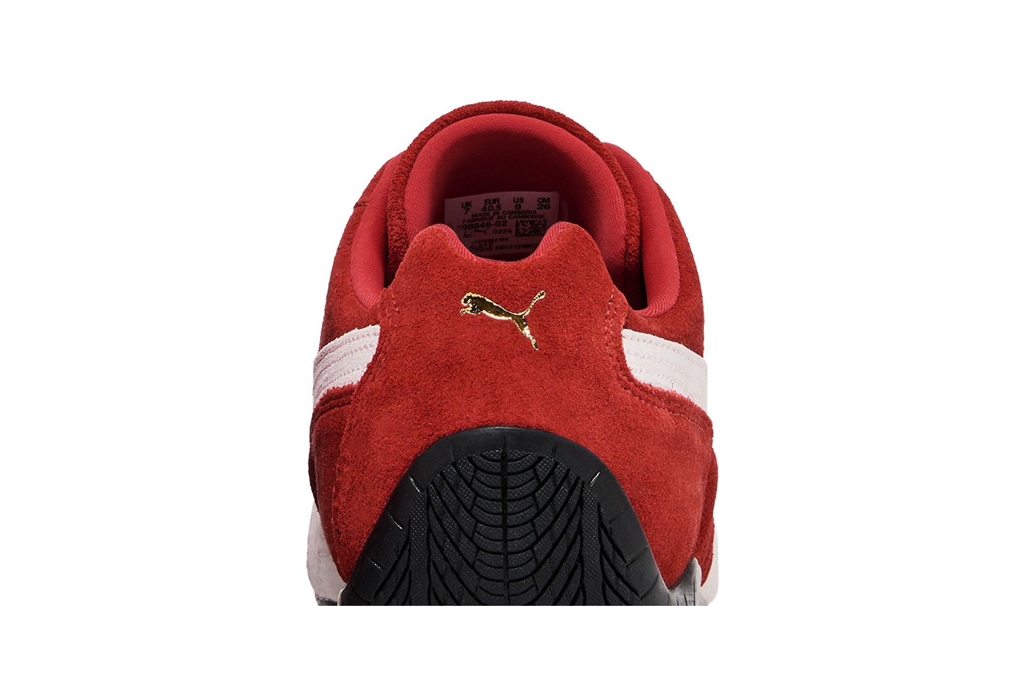 La Puma Speedcat OG Red White présente une tige en cuir léger avec des panneaux dans le coloris audacieux For All Time Red de Puma. Une superposition de cuir rouge forme l'orteil, qui présente également un logo Puma blanc sur le côté extérieur. Des bandes de course Puma Formstrip en daim blanc apparaissent de chaque côté de la chaussure au-dessus du panneau de talon rouge, tandis que le nom de la marque et le logo de Puma apparaissent en lettres dorées métalliques sur le côté extérieur juste au-dessus. La languette et le talon présentent également la marque Puma en or métallisé. La semelle extérieure en caoutchouc est noire et à motifs pour la traction.