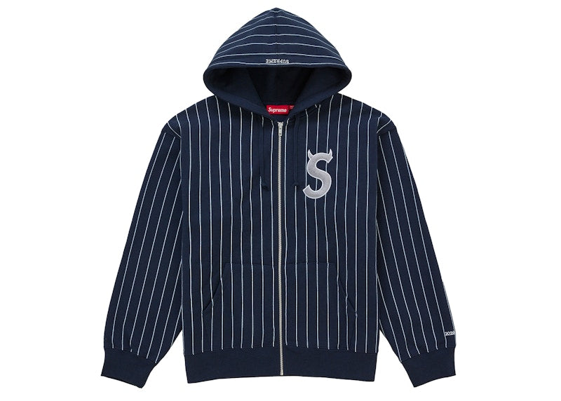 La Supreme Devil S Logo Zip Up Hooded Sweatshirt Stripe è una felpa con cappuccio a righe, parte della collezione di streetwear del marchio Supreme. Questo modello, rilasciato il 26 marzo 2026, presenta un design a righe con un logo "S" con corna di diavolo e una zip centrale. La felpa è realizzata con un tessuto comfortevole e presenta un cappuccio e polsini in tinta unita. La colorazione principale è blu scuro con righe bianche.