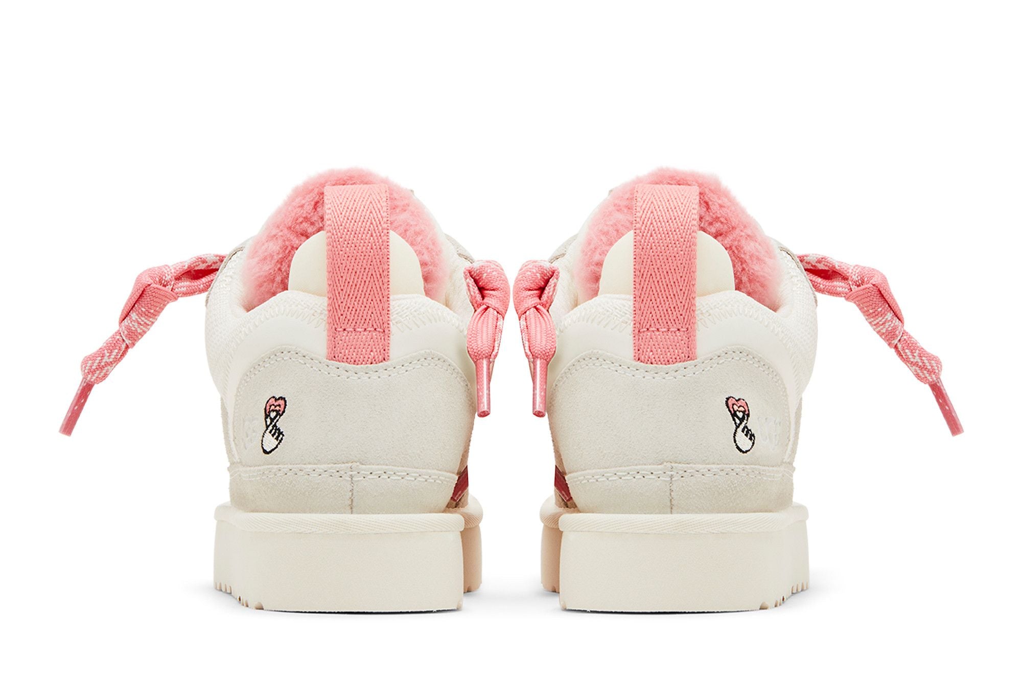 La UGG Lowmel Love '25 Jasmine Tropical Pink è una calzatura casual caratterizzata da un upper in suede stratificato e tessuto intrecciato nei toni di Jasmine e Tropical Pink. La parte superiore e il cuff della caviglia sono realizzati in tessuto, con un rivestimento in finta pelliccia Tropical Pink sotto la linguetta. I lacci, gli occhielli e le linguette posteriori in Tropical Pink creano un look coordinato, mentre il marchio Ugg è visibile sulla parte esterna della caviglia. La suola spessa e bianca completa il design.