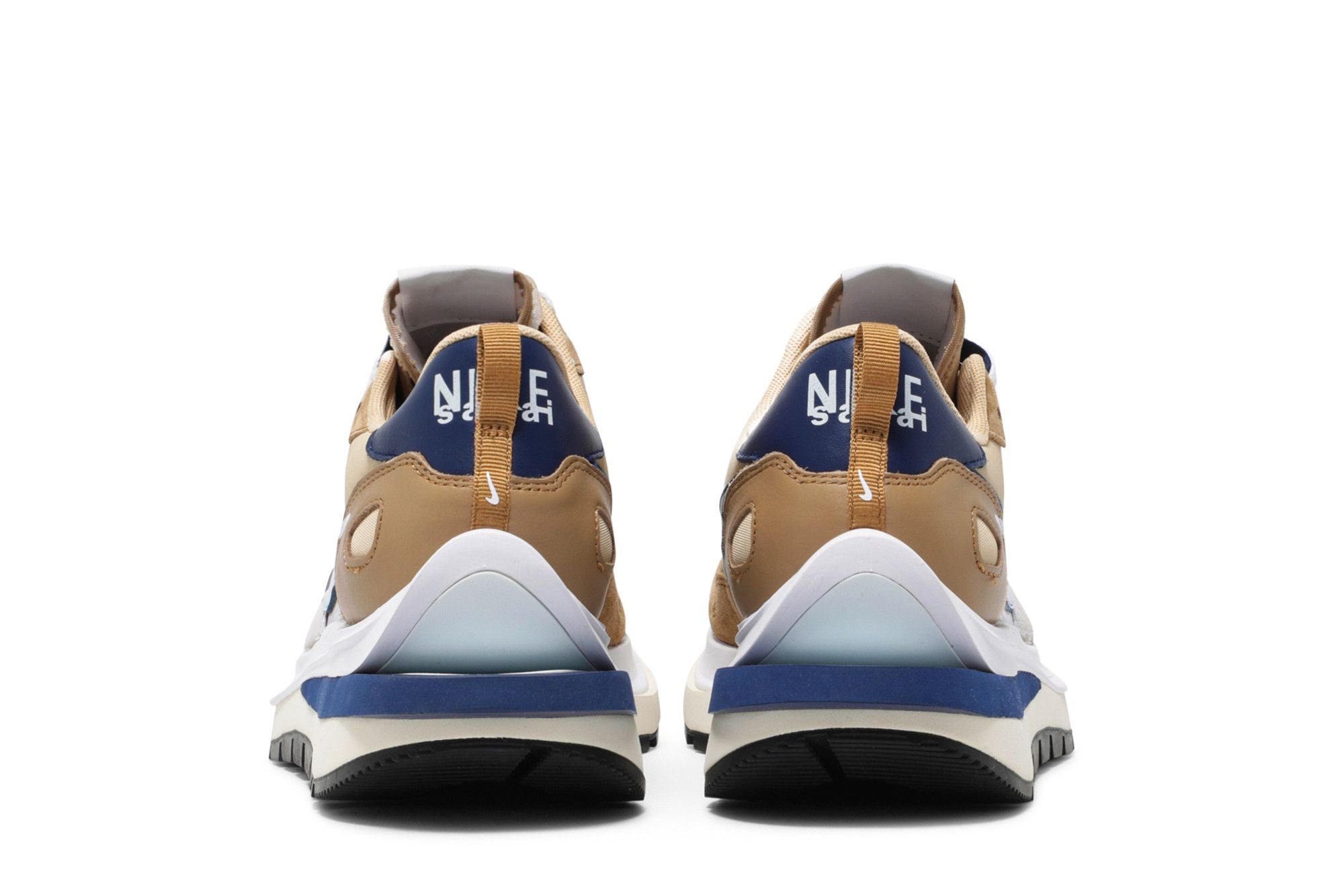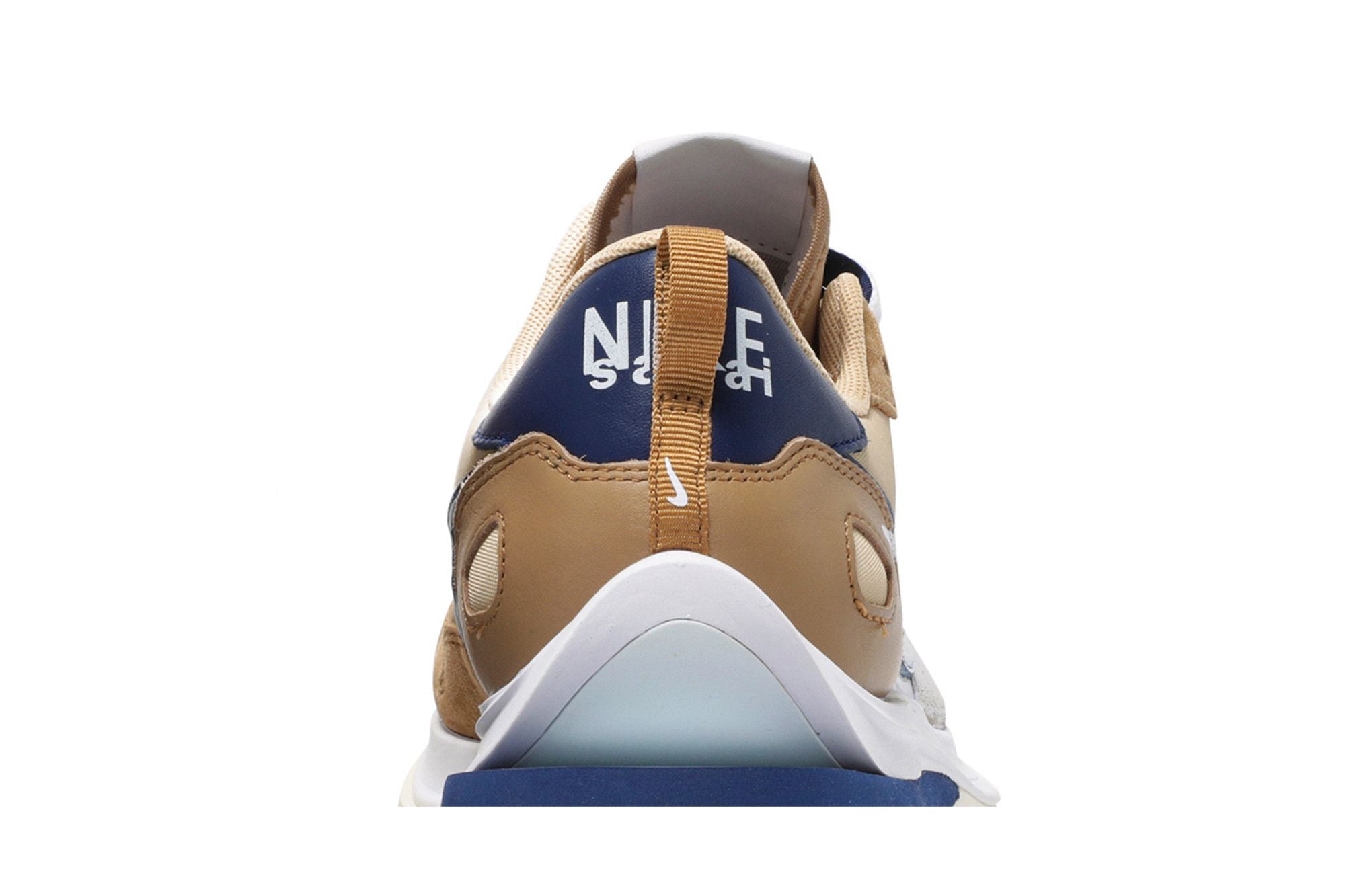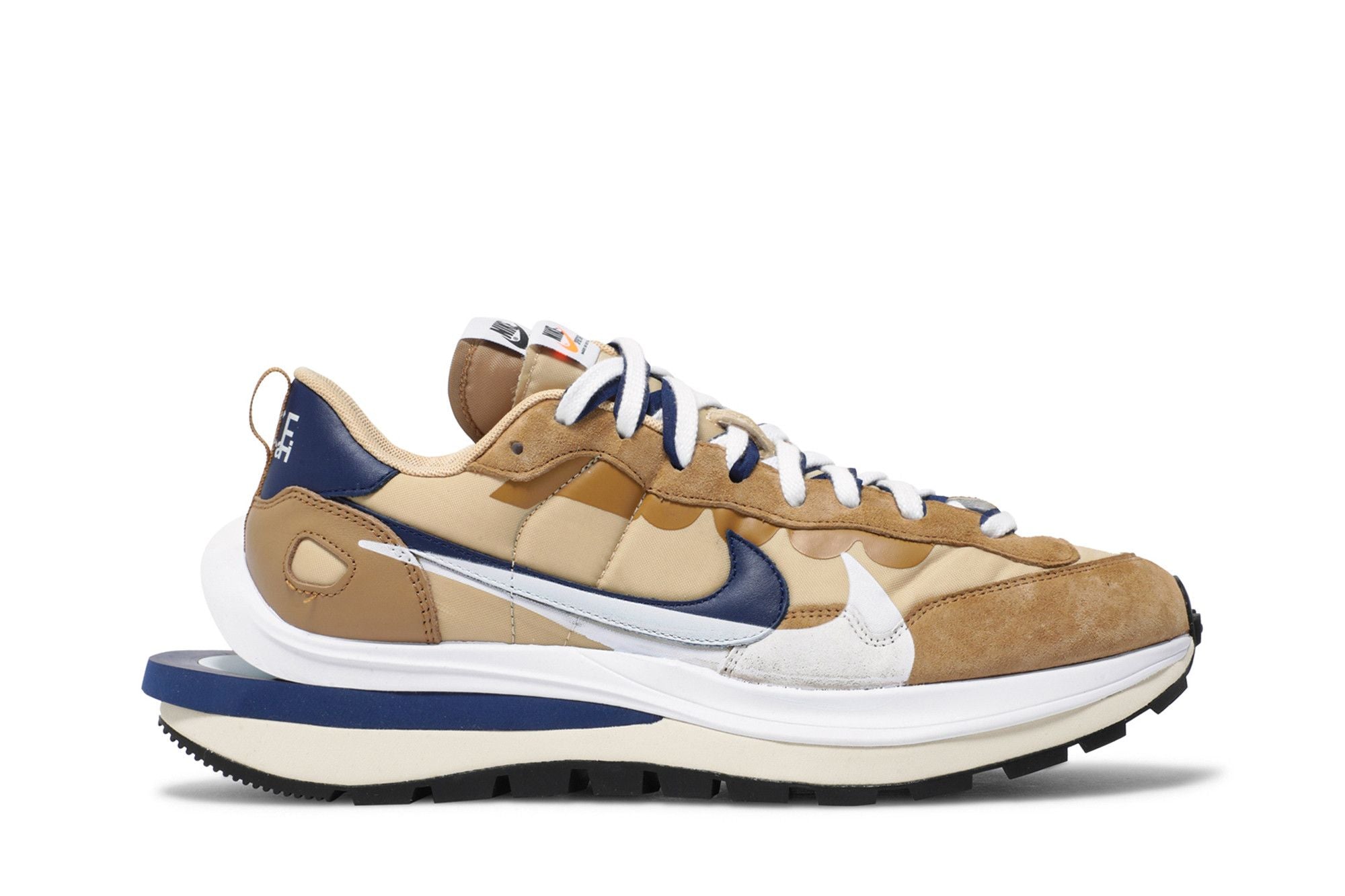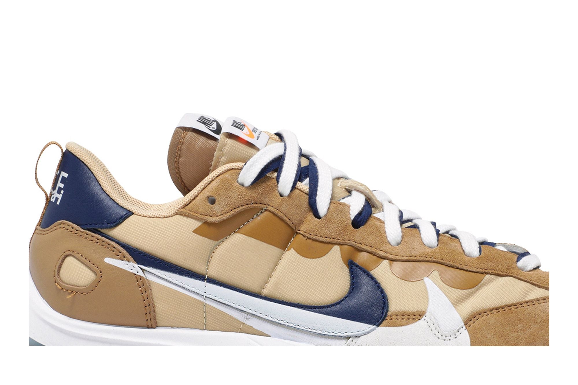 La Nike Vaporwaffle Sacai Seasame Blue Void présente une base en nylon qui combine des nuances de beige et de marron foncé. Le design présente plusieurs accents bleu marine sur le logo « Swoosh », les lacets et le renfort arrière, créant un contraste visuel avec l'aspect général de la chaussure. L'influence déconstruite de Sacai ajoute une touche plus avant-gardiste au look général de la sneaker. Voir toutes les spécifications sur Nike .