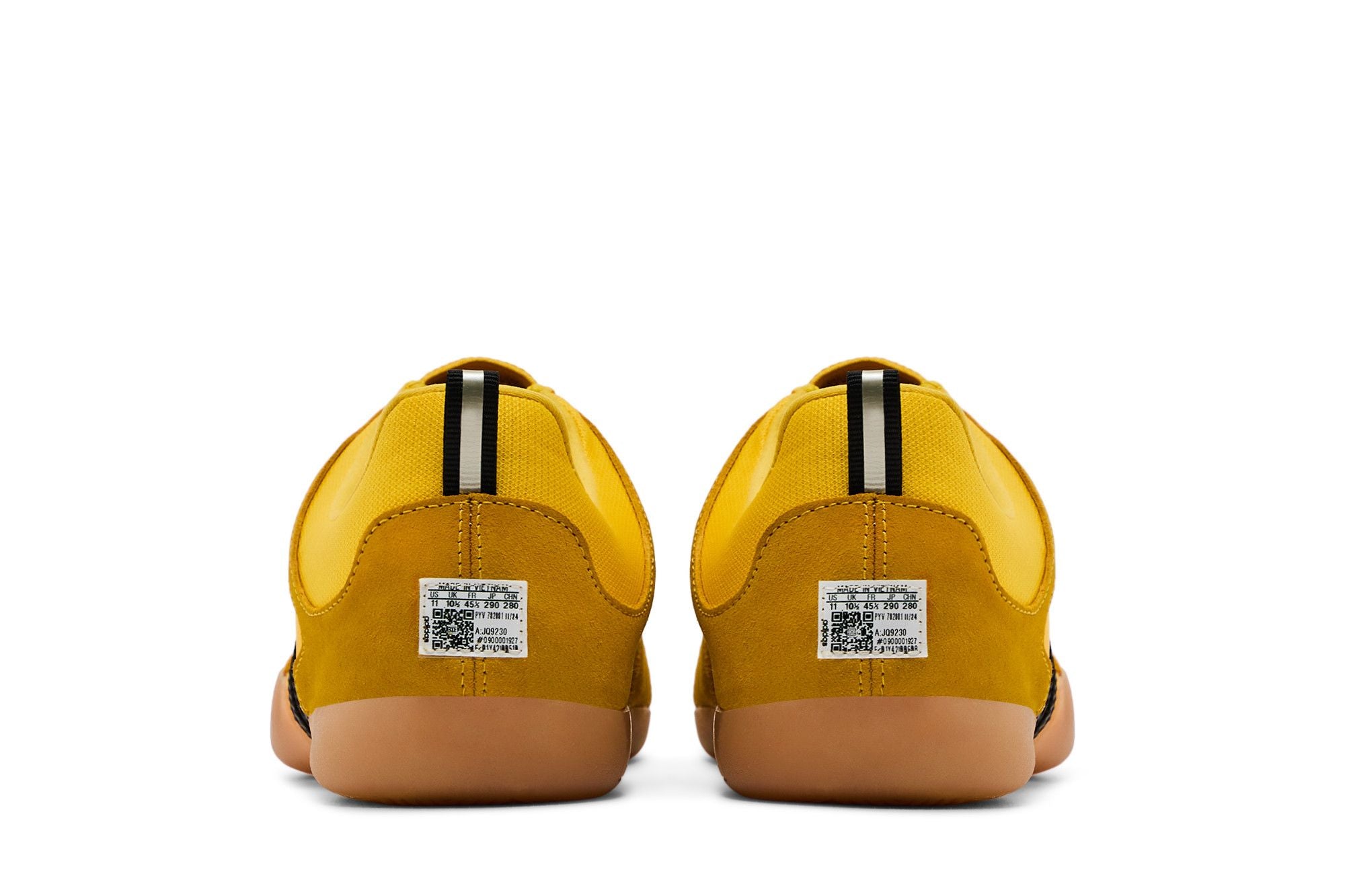 La Adidas Ballerina Bad Bunny Bold Gold è una sneaker dal design audace e minimalista, ispirata al modello adidas Taekwondo. La tomaia in nylon giallo con rivestimenti in suede tono su tono è arricchita da iconiche tre-strisce in pelle nera e un sistema di chiusura con cordino elastico.