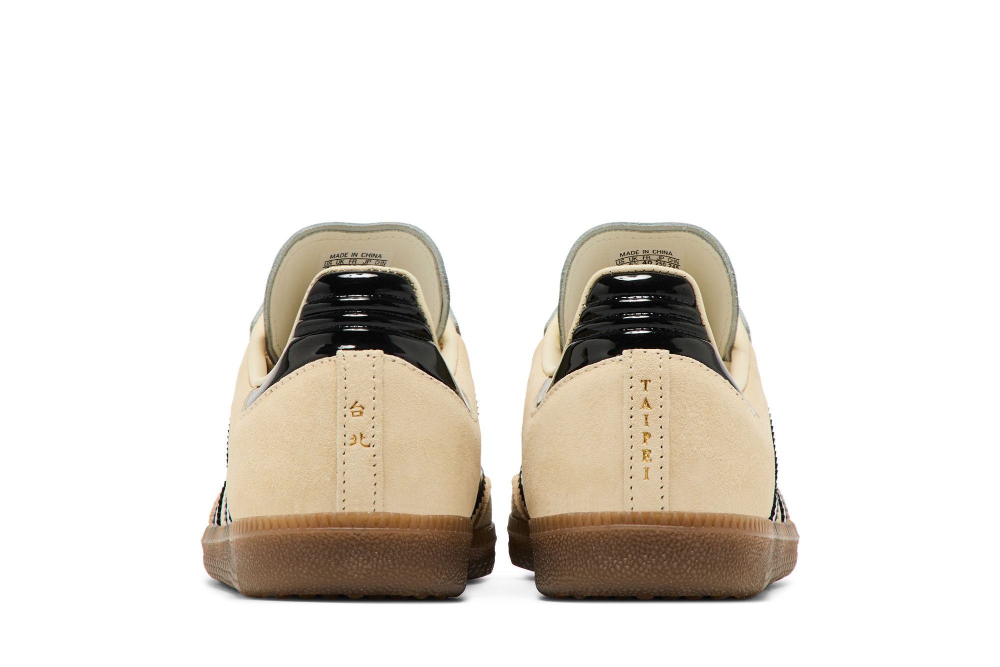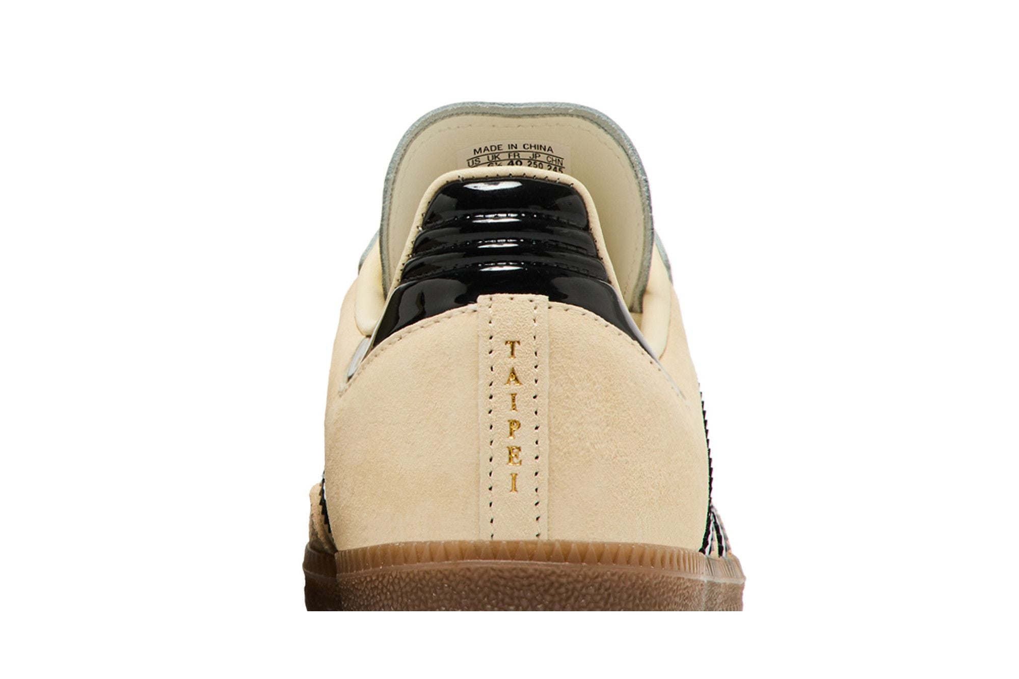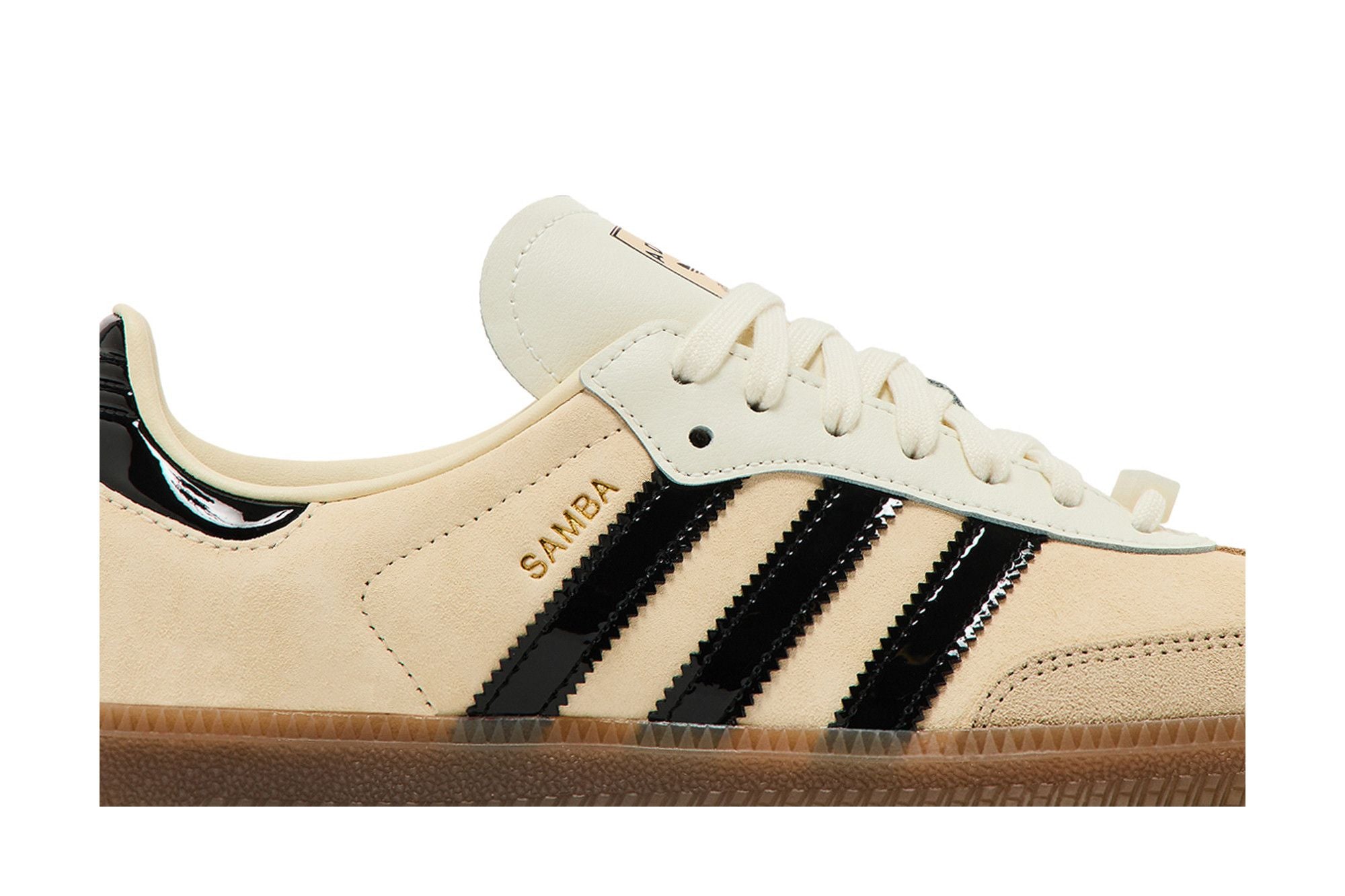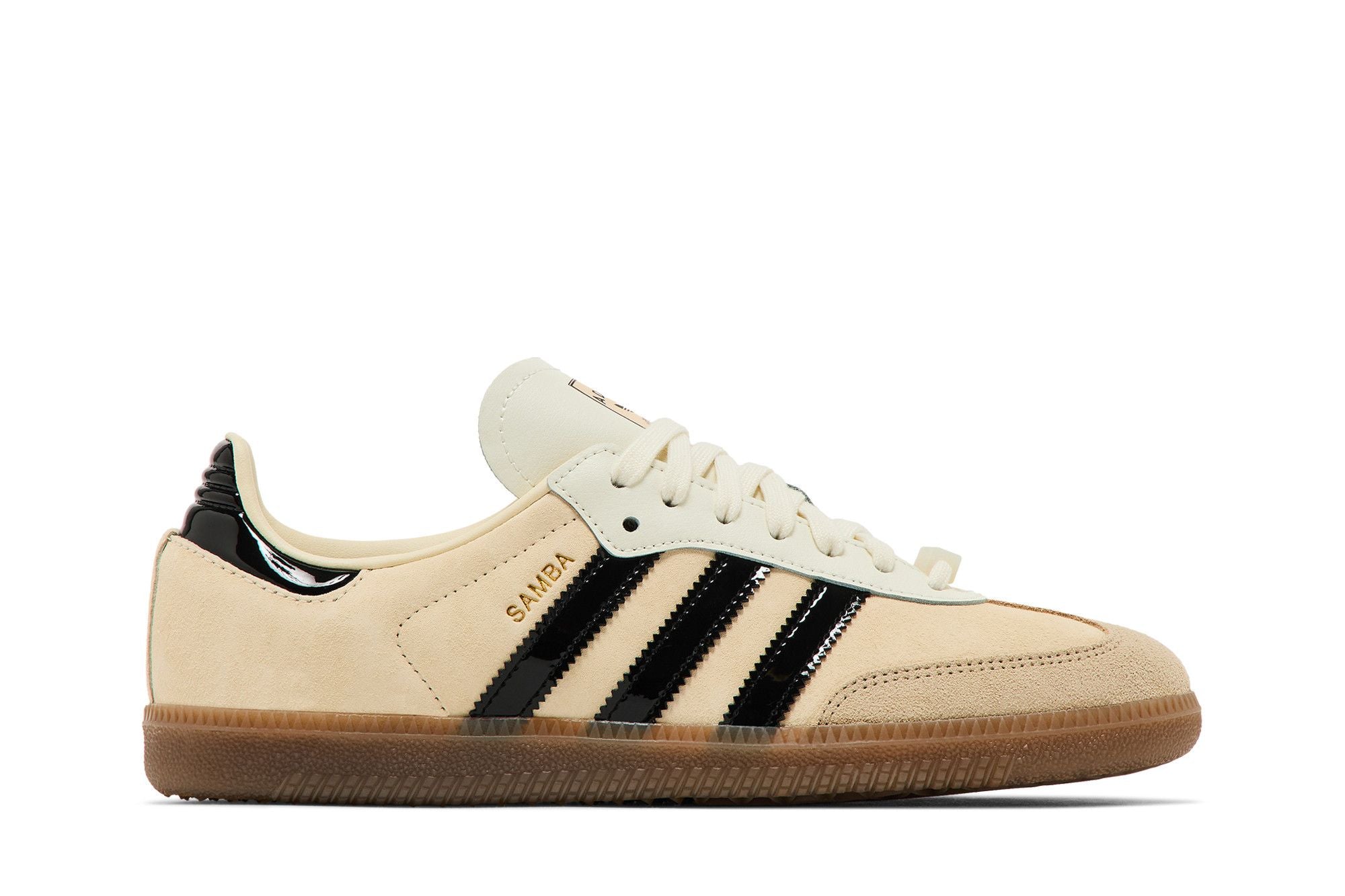 La adidas Samba OG Bubble Tea è una sneaker dalle linee eleganti e minimali, realizzata in suede beige con inserti in pelle nera. La tomaia presenta tre strisce nere sulla fiancata e la scritta "SAMBA" in oro. La suola è in gomma marrone e le stringhe sono bianche. Gli elementi di design si completano con il logo sulla linguetta e sulla parte posteriore.