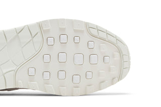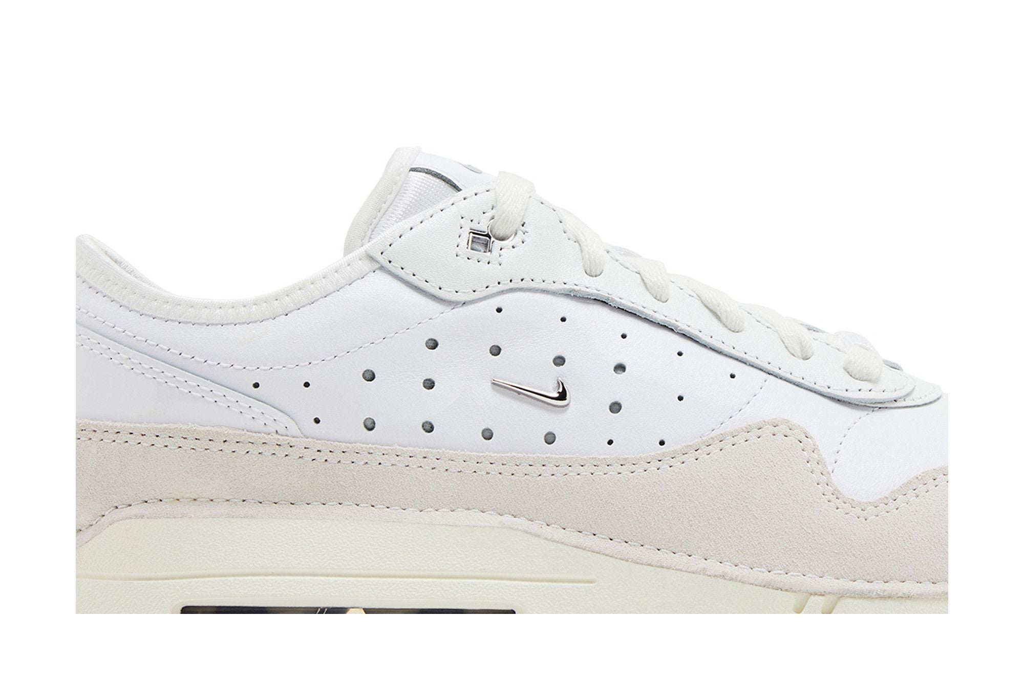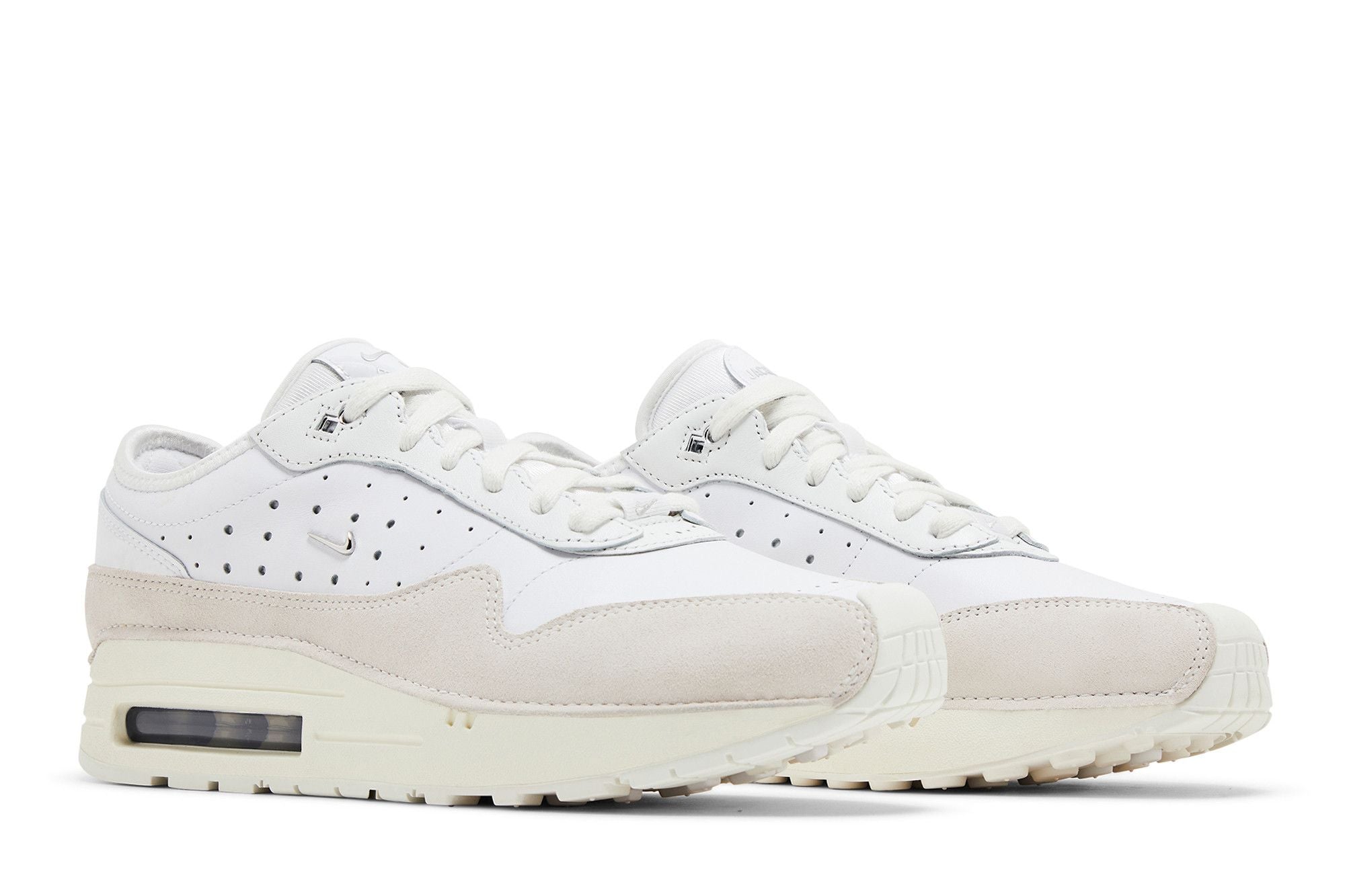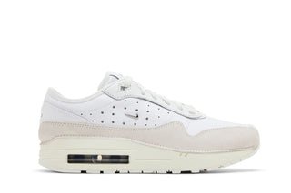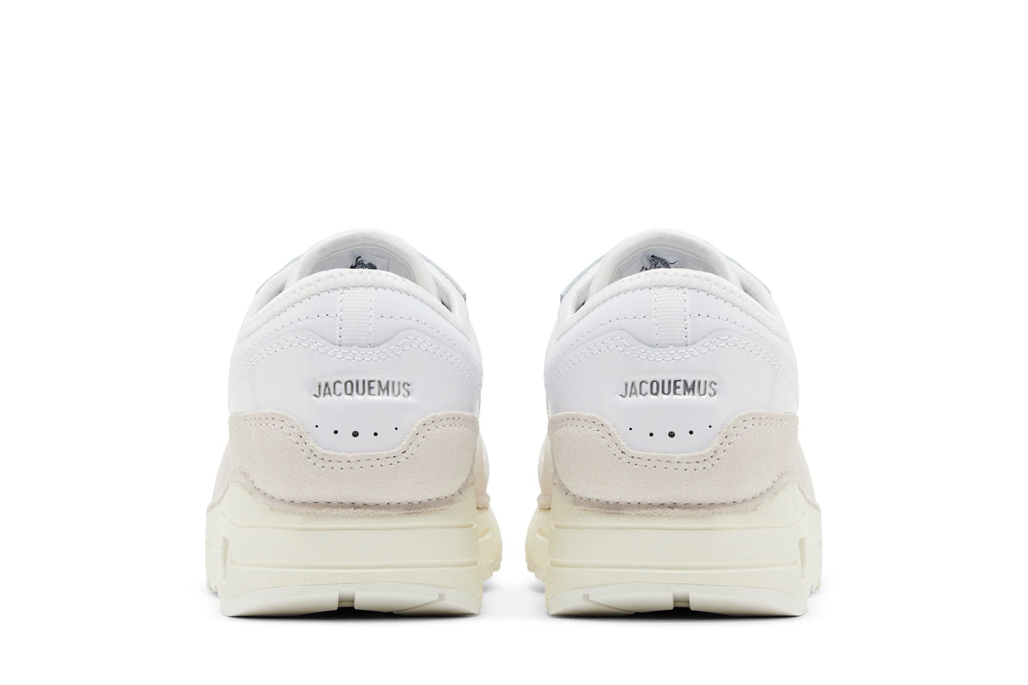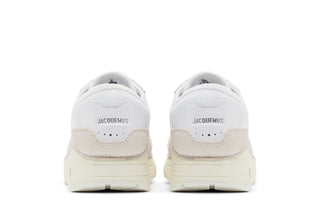 La Air Max 1 '86 Jacquemus White presenta una base in pelle bianca con strati esterni in pelle scamosciata grigio chiaro. L'interusola bianca presenta la celebre unità Air tipica di questo modello. Sul pannello laterale, il classico swoosh Nike è sostituito da un mini-swoosh argentato.