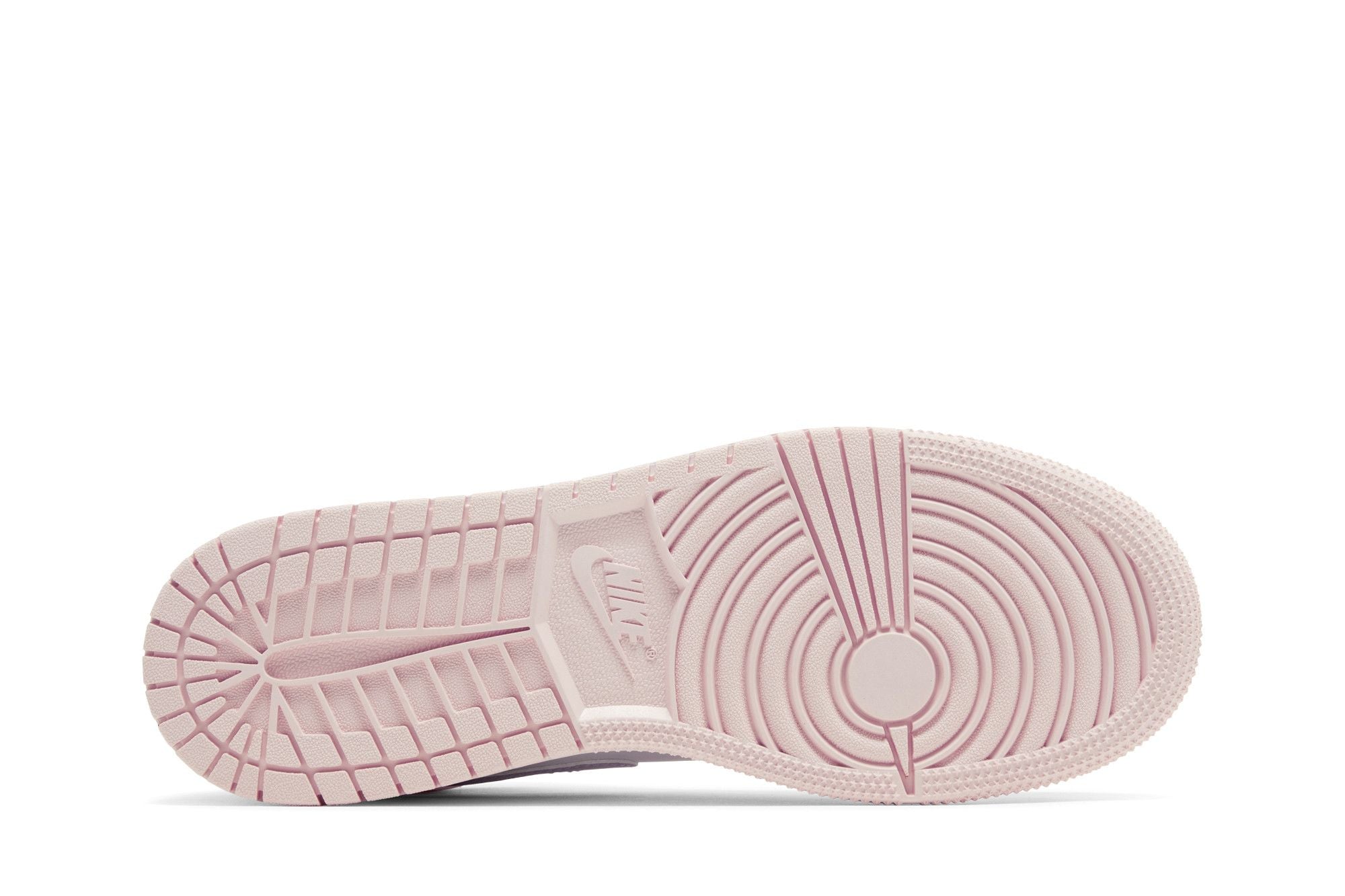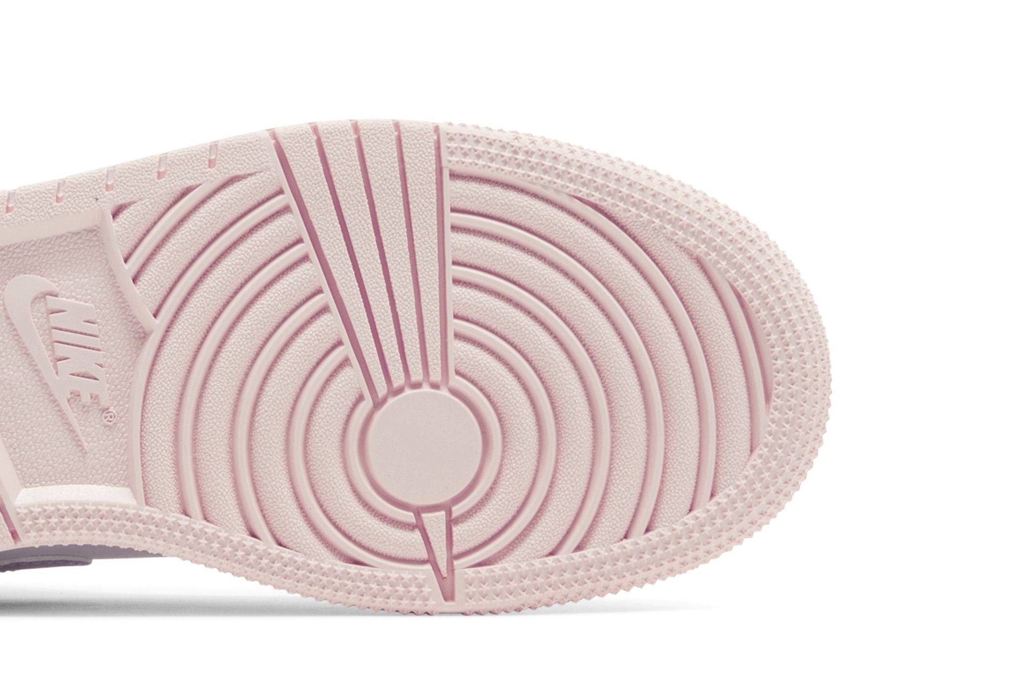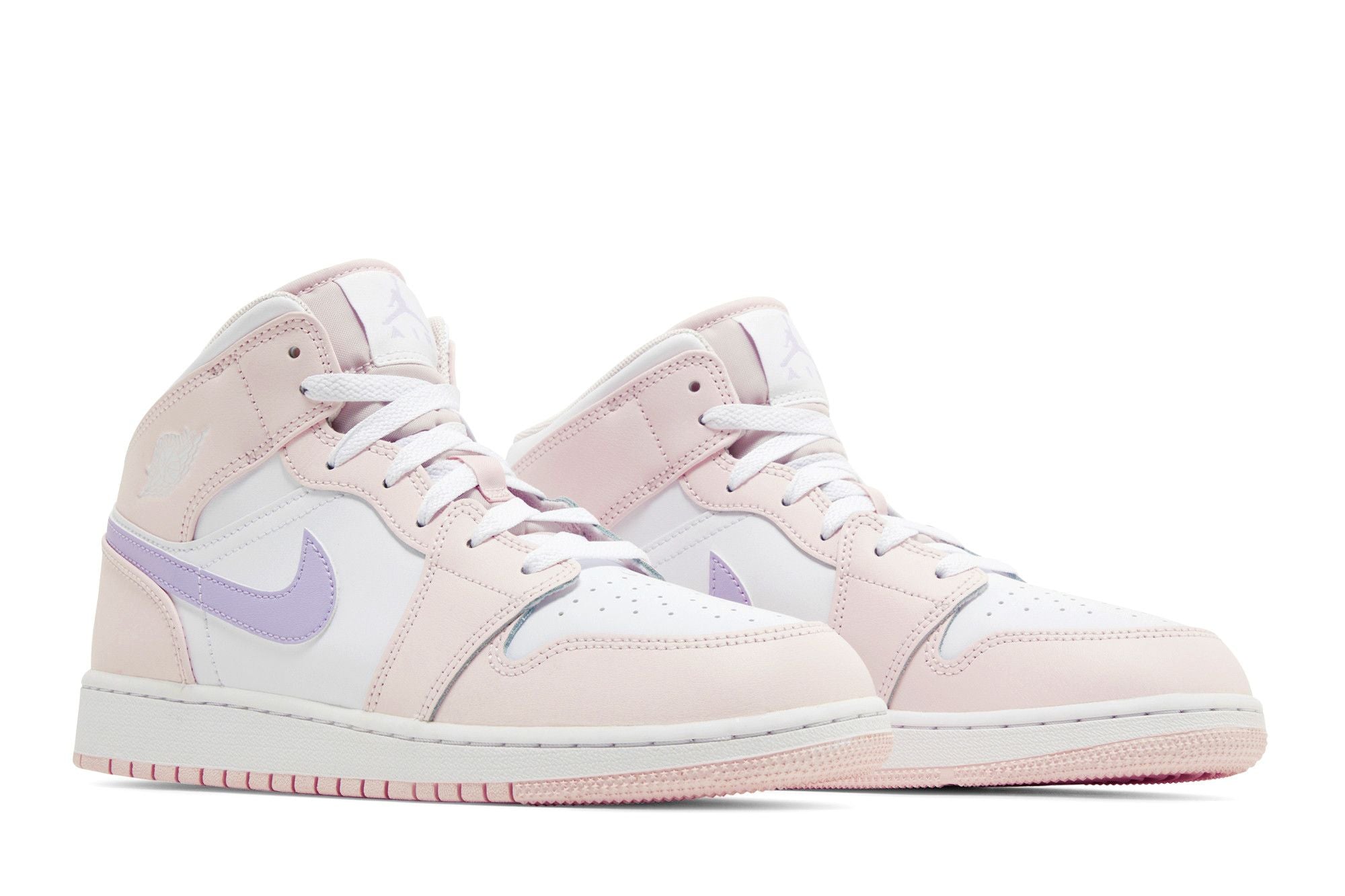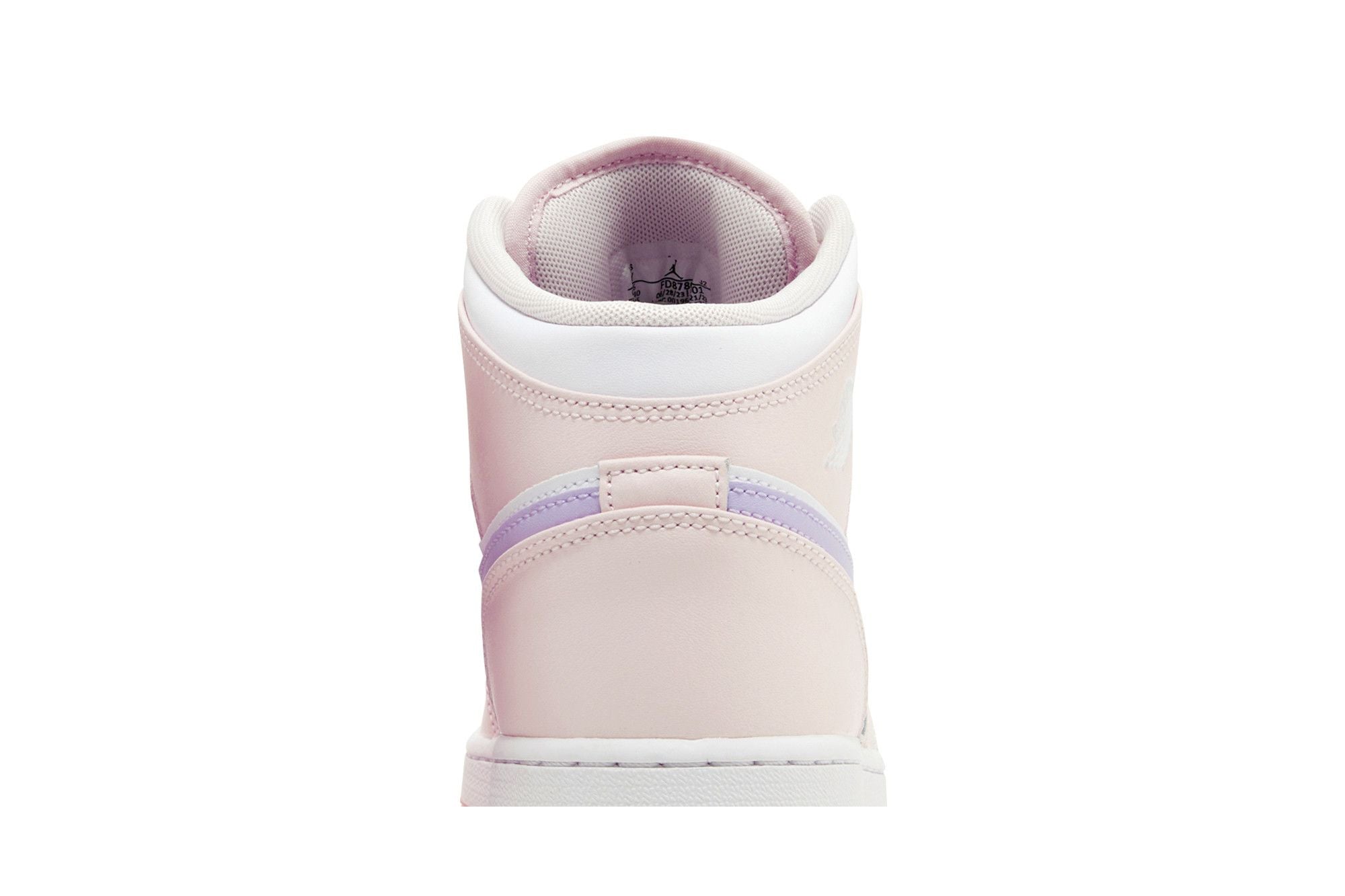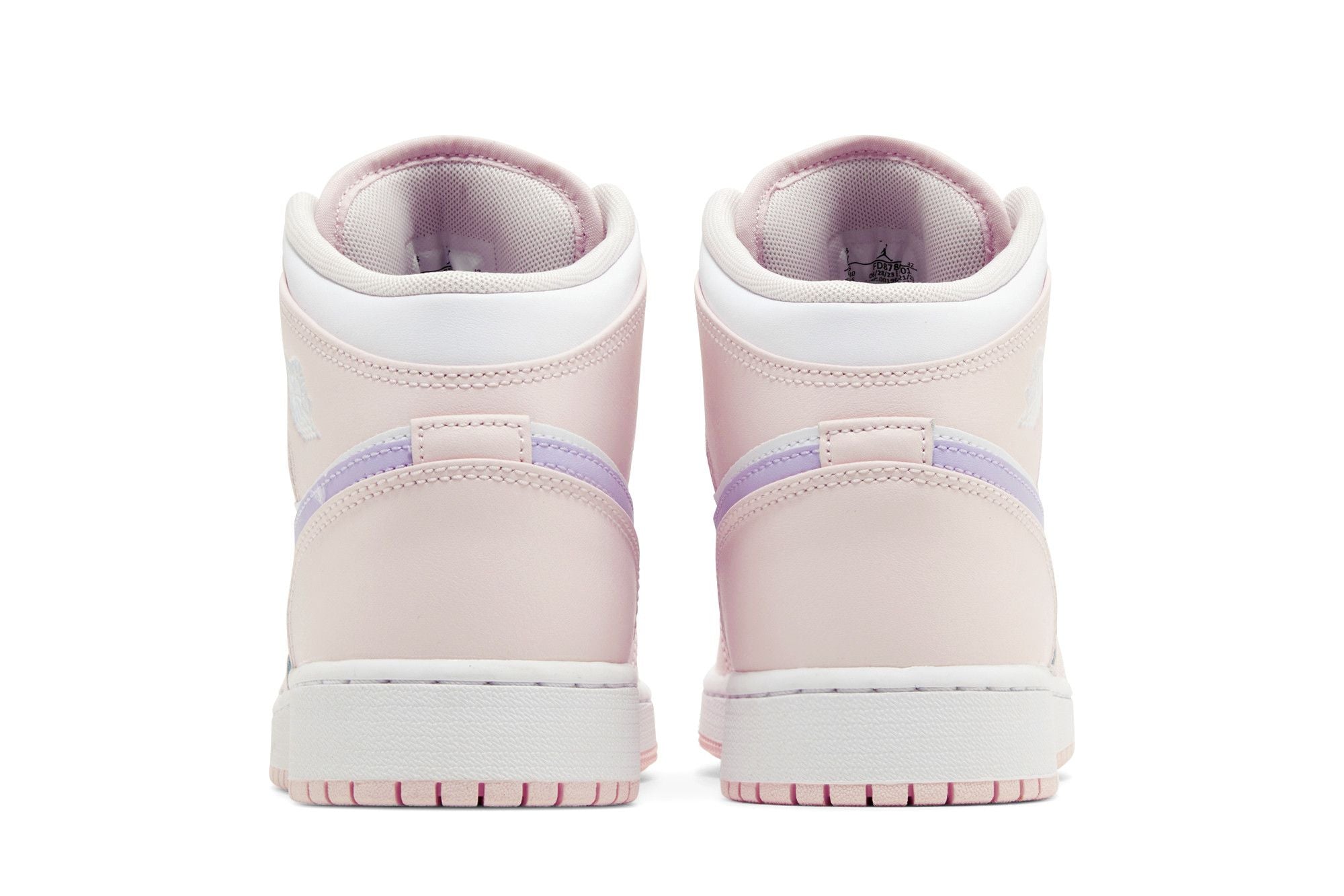 La Jordan 1 Mid Pink Wash presenta una base bianca in pelle con sovrapposizioni in pelle nei toni del rosa chiaro. Per contrasto, il logo Swoosh sui lati è di colore viola pastello.