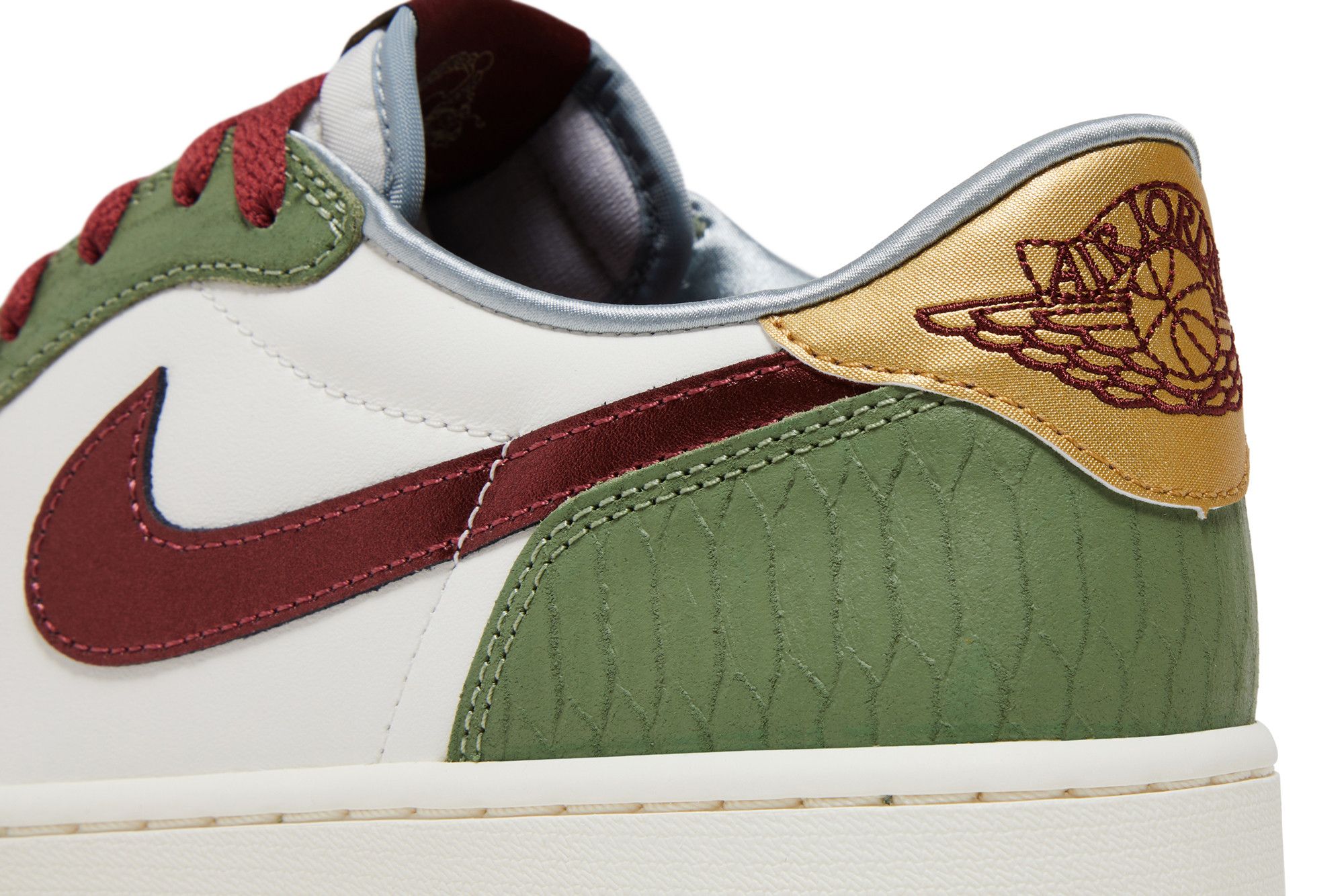 Questa Air Jordan 1 Low OG Year of the Dragon presenta una base in pelle bianca, accompagnata da rivestimenti in pelle testurizzata verde nello stile di una pelle di drago. Lo Swoosh è decorato con un colore bordeaux abbinato ai lacci e al marchio, mentre la linguetta dorata sul tallone e la fodera in raso grigio conferiscono un aspetto premium a questa silhouette. Per finire, questo modello è accompagnato da un cartellino argentato e da una scatola speciale con i colori della coppia. Guarda tutte le specifiche su Nike.