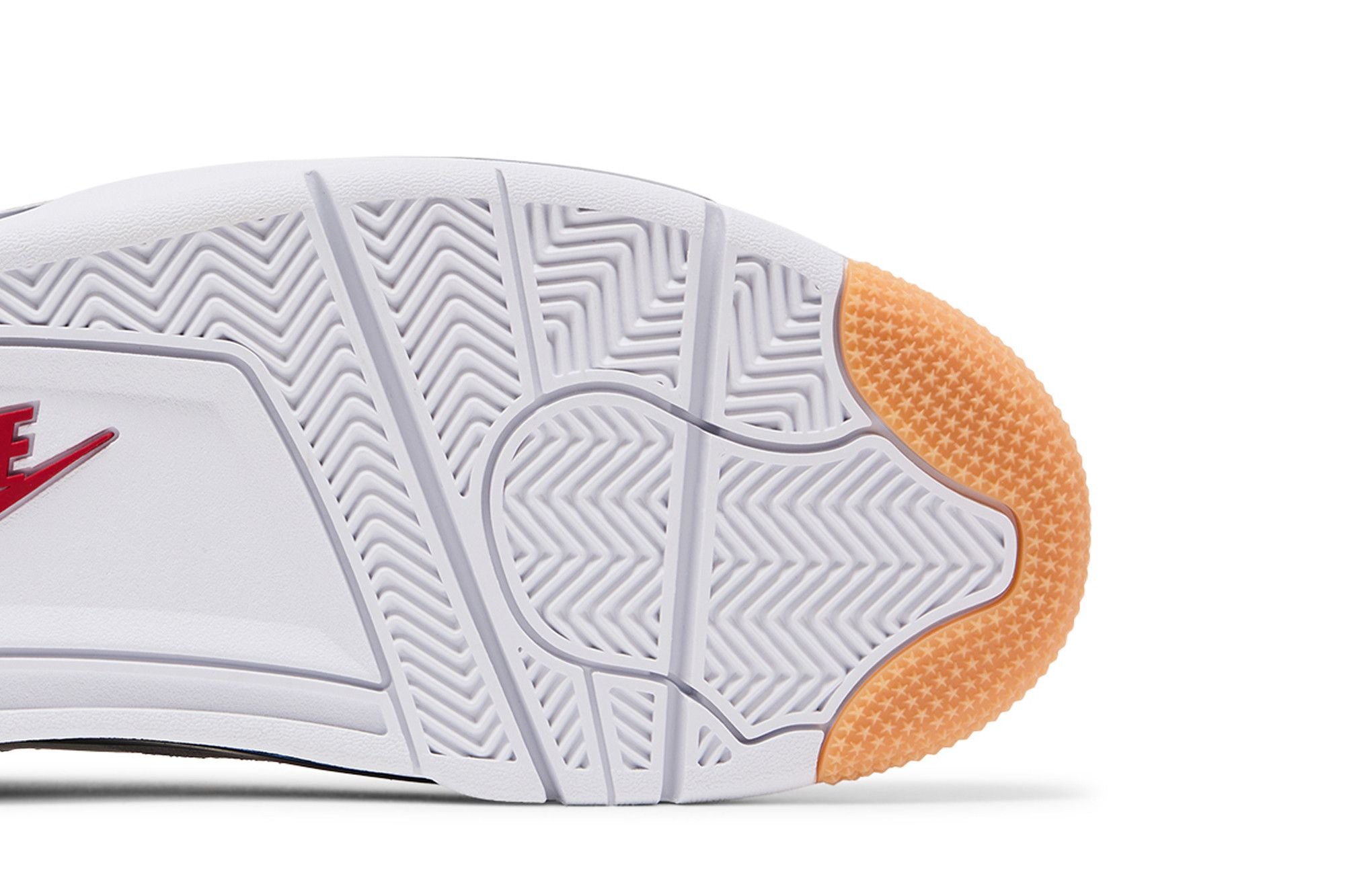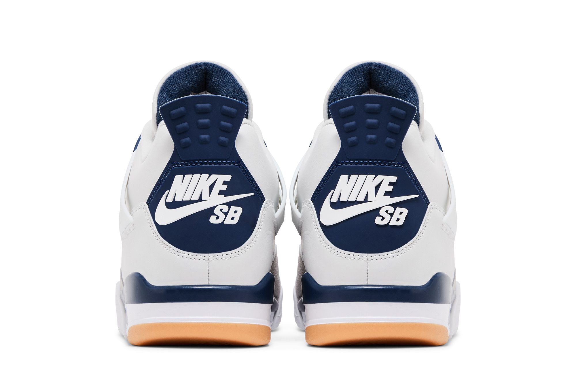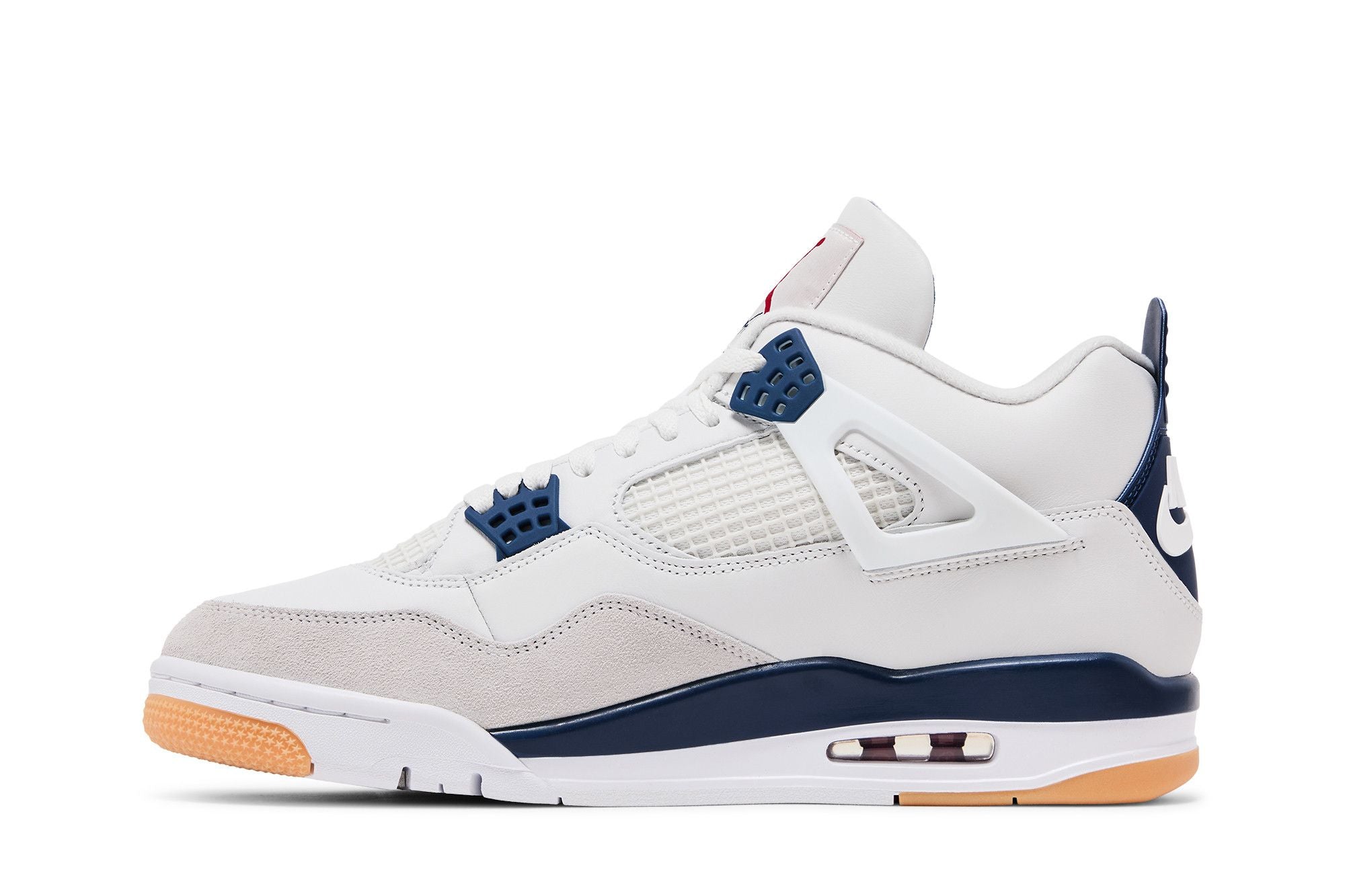 La Nike SB x Air Jordan 4 Retro SP 'Navy' reinterpreta la storica silhouette di Michael Jordan in chiave skate. La tomaia combina pelle bianca con una sovrapposizione in camoscio grigio sulla punta e pannelli laterali in mesh. Il classico Jumpman rosso è ricamato sulla linguetta, mentre il tallone sfoggia il logo Nike SB in rilievo su un inserto navy. Gli occhielli sagomati e la suola in poliuretano, anch’essi navy, completano il design. L’intersuola mantiene l’unità Air visibile nel tallone, eliminando però l’ammortizzazione anteriore per una maggiore stabilità. La suola in gomma con motivo a spina di pesce assicura grip ottimale, con rinforzi in gum rubber nelle zone più soggette a usura.