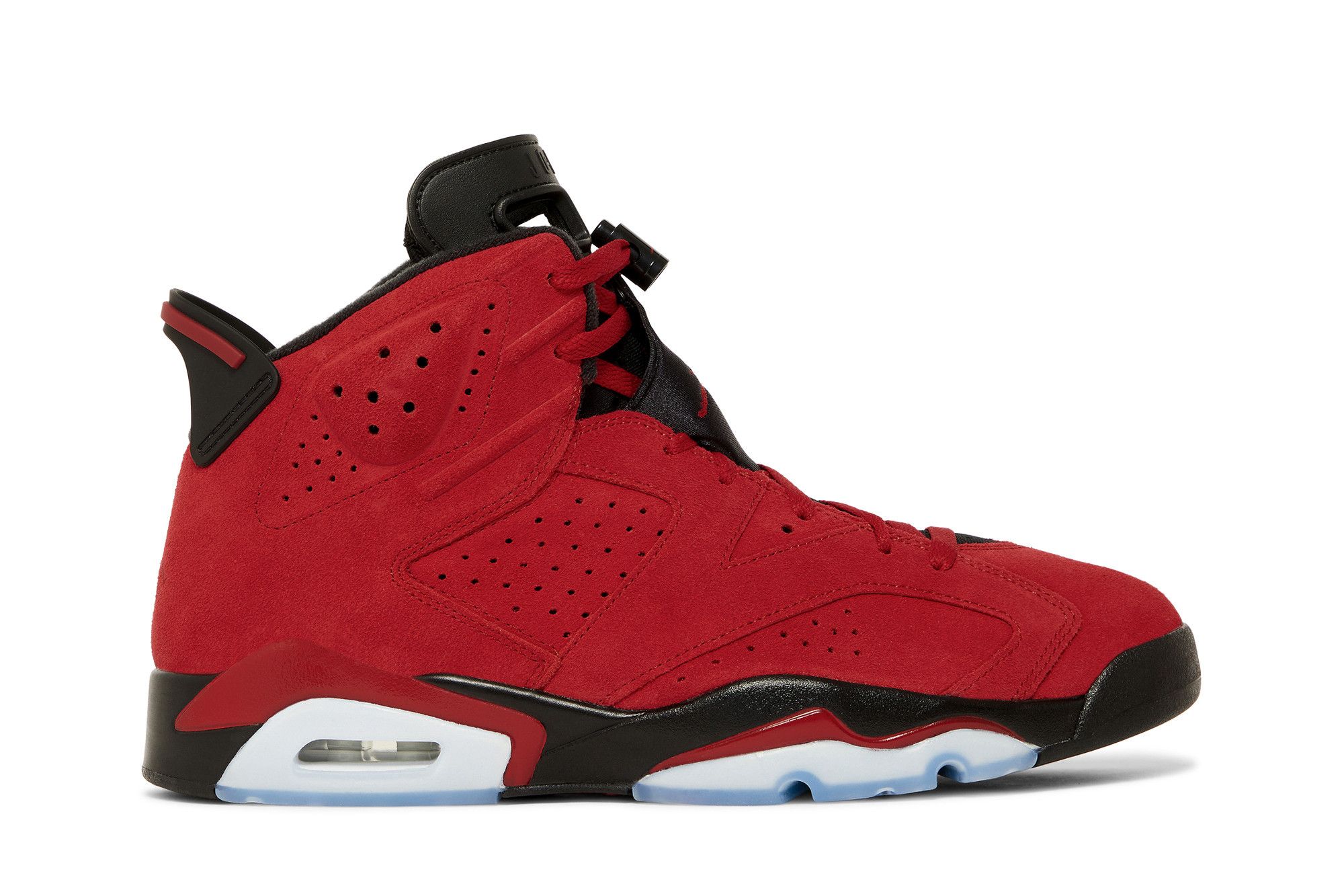 La Jordan 6 Retro Toro Bravo presenta una base in pelle scamosciata rossa che copre l'intera tomaia. Alcuni dettagli neri appaiono sulla suola, sulla linguetta e sul tallone. Una suola traslucida completa il design iconico di Tinker Hatfield. Guarda tutte le specifiche su Nike.