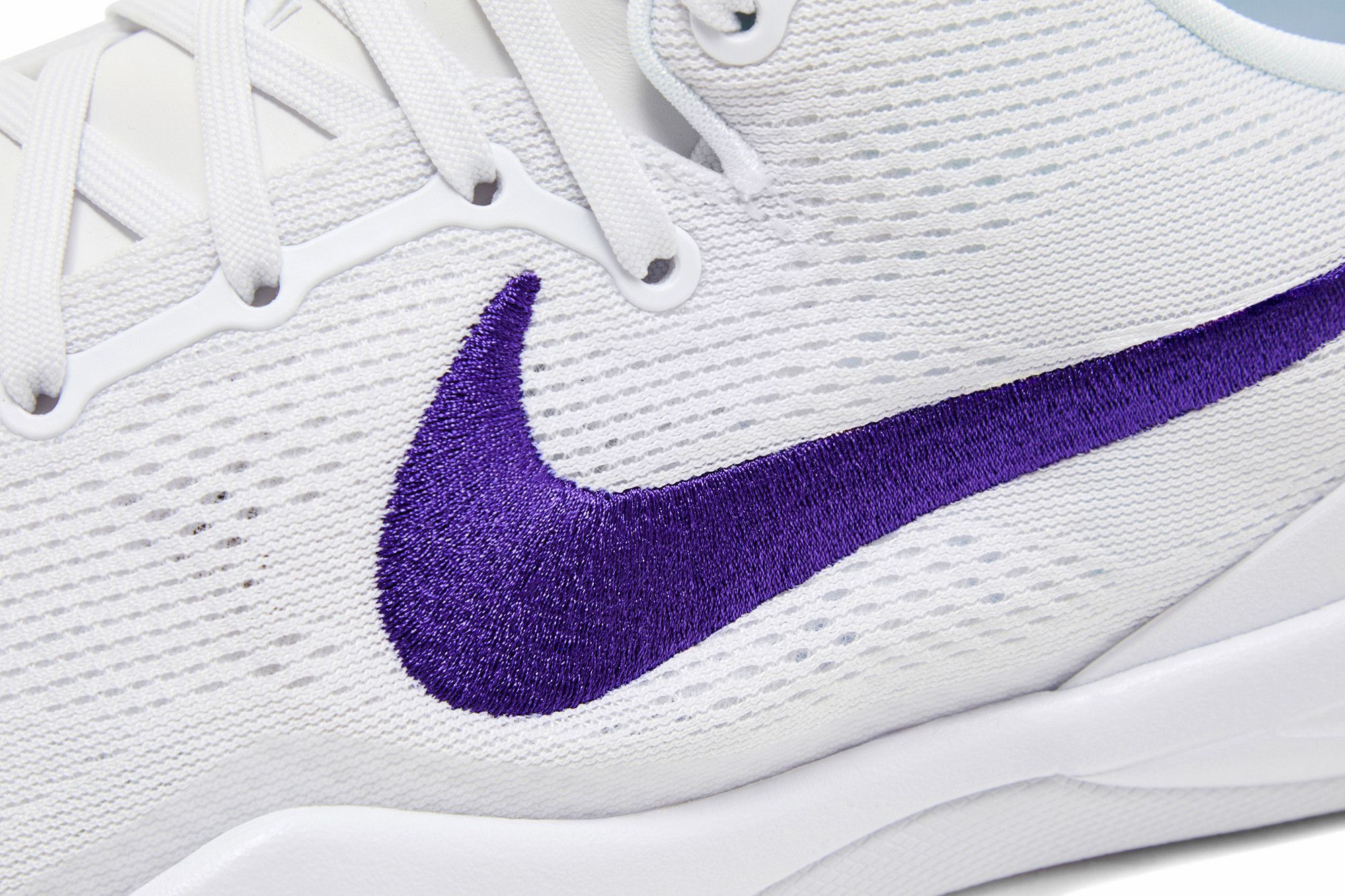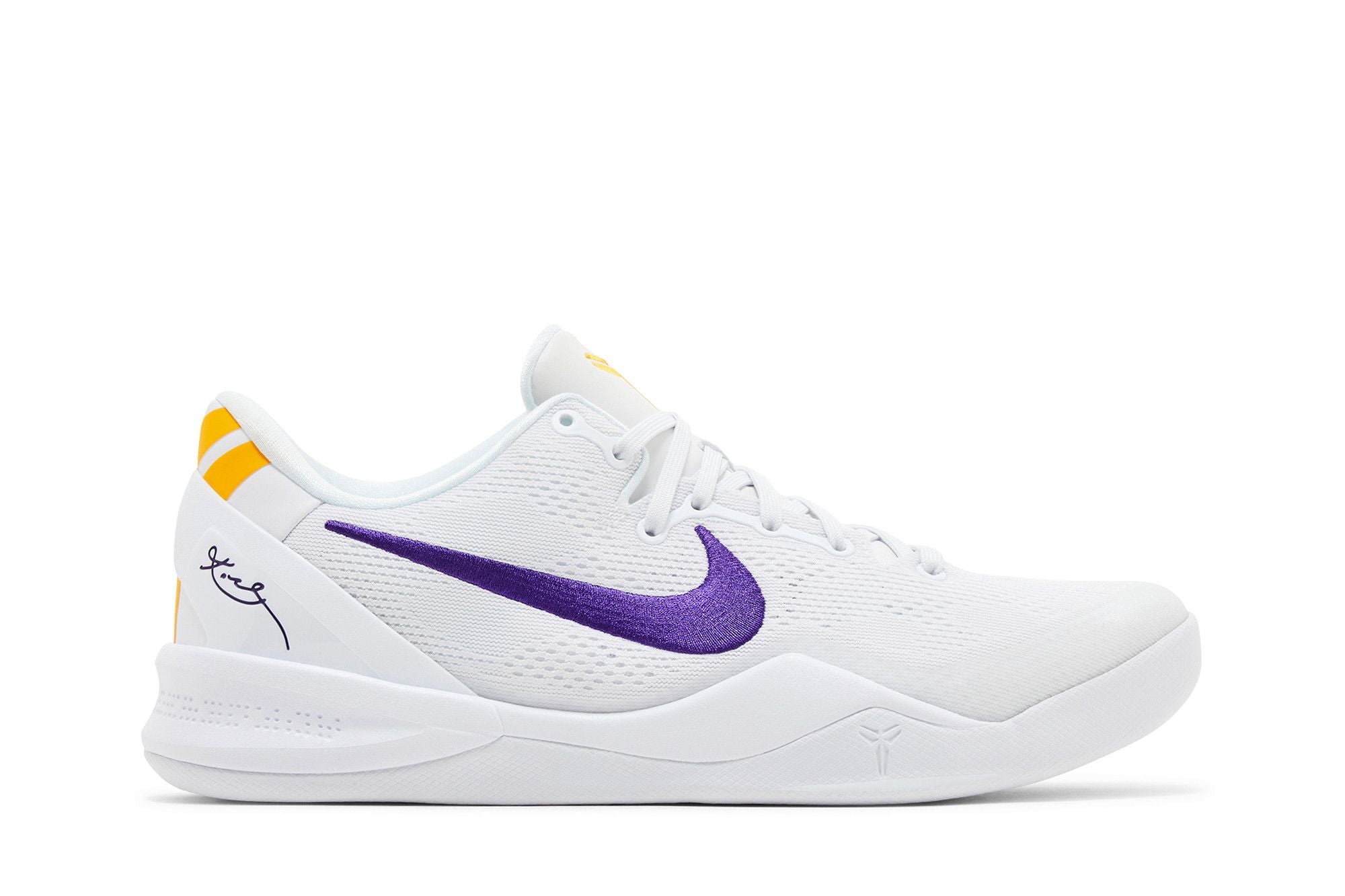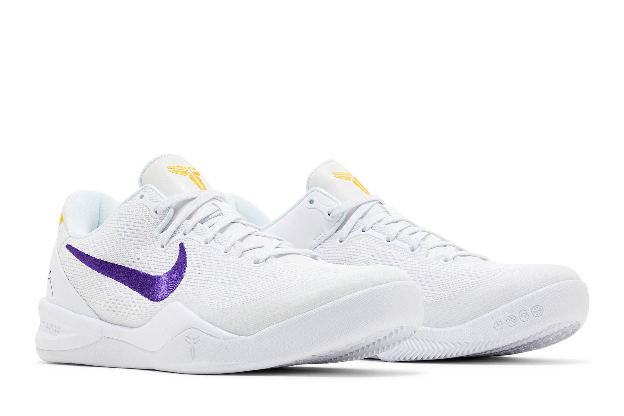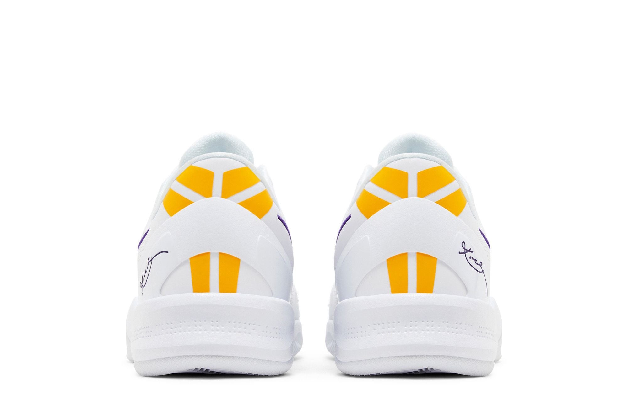 La Kobe 8 Protro Lakers Home porta l'energia dello Staples Center direttamente ai tuoi piedi. Questa vivace colorazione bianca è l'omaggio perfetto alle uniformi domestiche dei Lakers, caratterizzata da tomaia in mesh tecnico bianco, intersuola bianca e suola abbinata. Lo swoosh Nike ricamato in viola e la firma di Kobe in oro sulla clip del tallone forniscono contrasti sorprendenti, mentre i loghi dorati di Kobe sulla linguetta e sul tallone legano insieme l'intero design in vero stile Lakers.