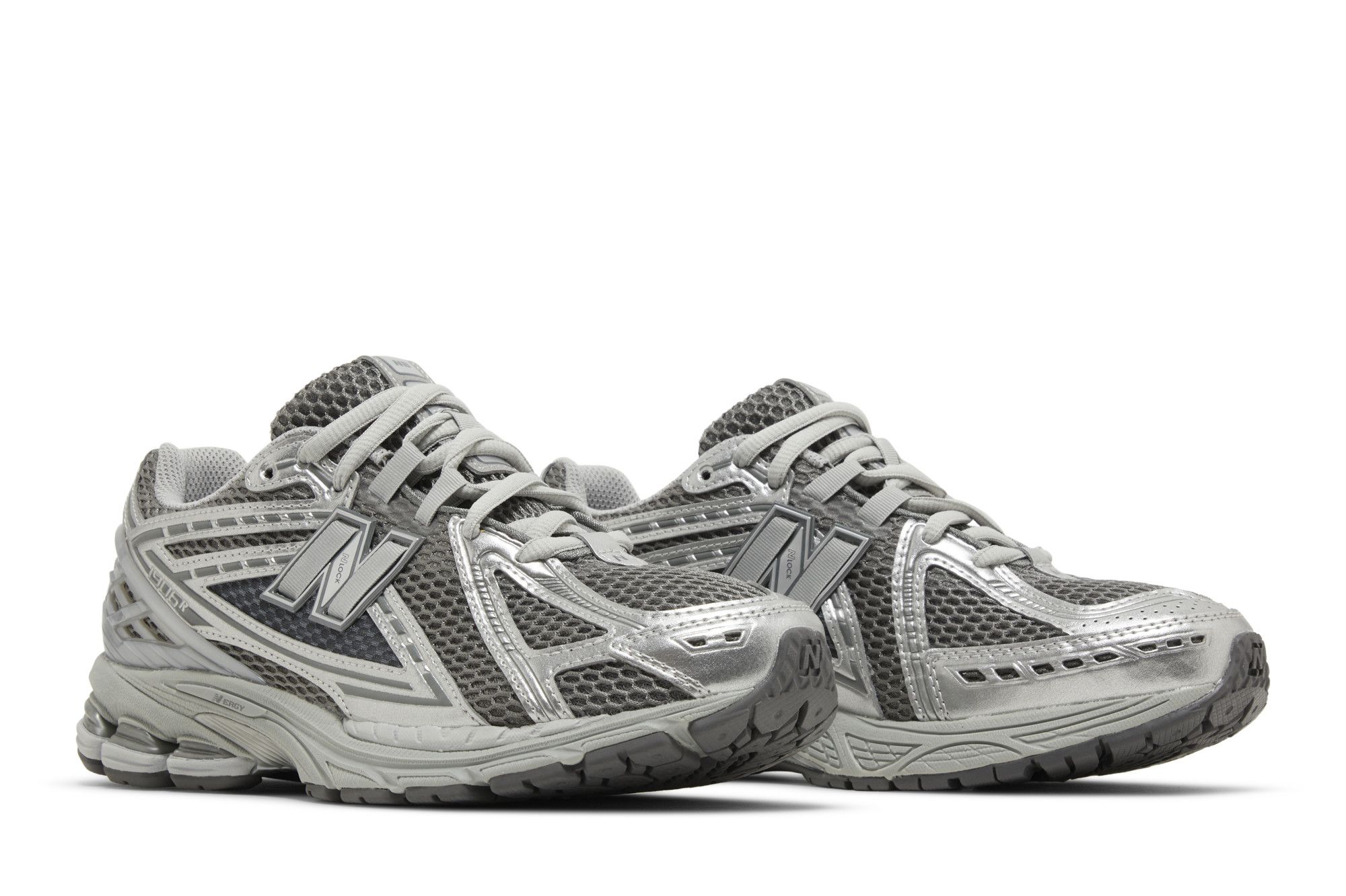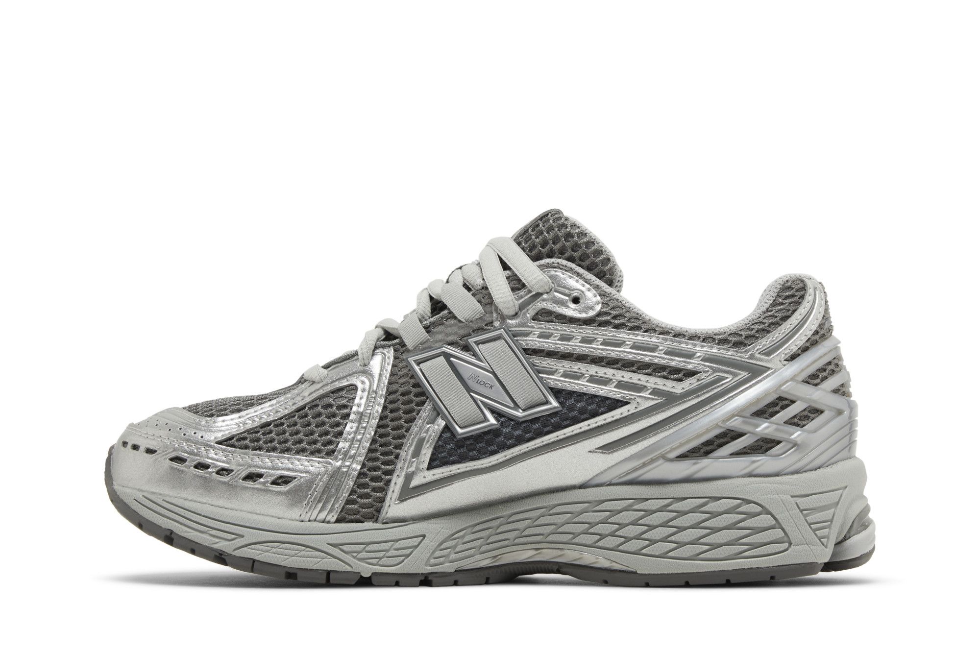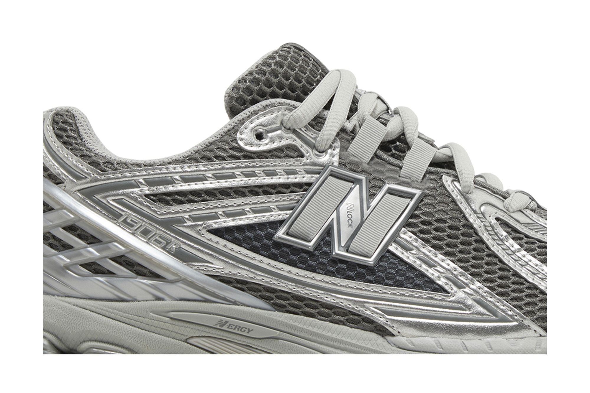 Questa iterazione della New Balance 1906R è realizzata con una tomaia in mesh in grigio scuro. Sovrapposizioni sintetiche in argento metallizzato attraversano l'intera tomaia, arrotondando la punta, attraversando l'intersuola e correndo sotto la parte superiore del tallone. La New Balance N adorna entrambi i lati sotto i lacci in un design a pannelli 3D con il marchio N-Lock che appare al centro. Il marchio 1906R si trova sul rivestimento sul lato laterale del tallone. Il tallone è inoltre supportato da una gabbia in TPU argento, che sfoggia il logo NB. Un altro logo si trova sulla linguetta, mentre una suola grigia fantasia completa il look.