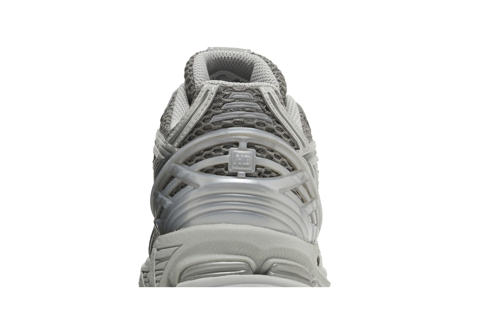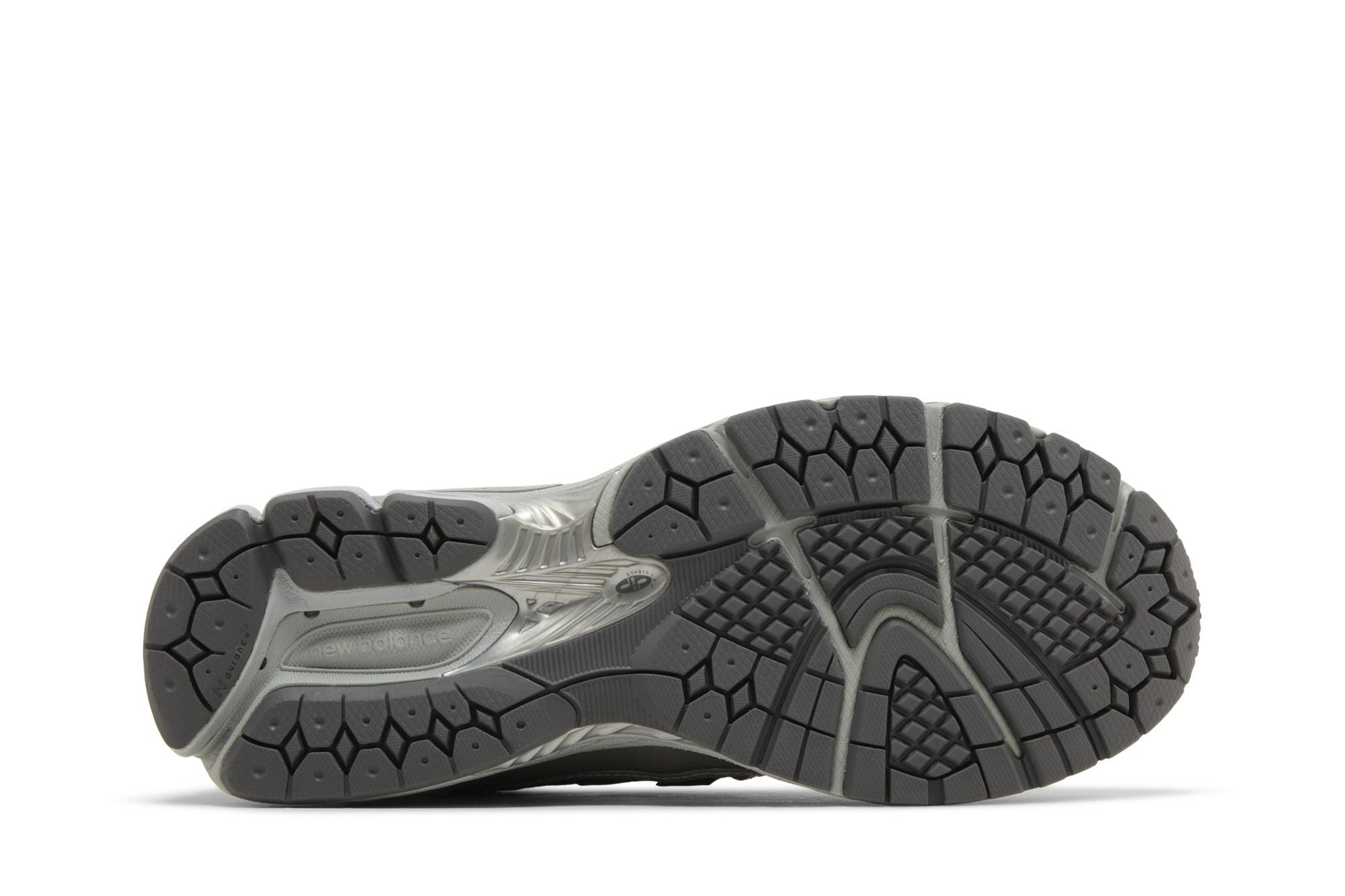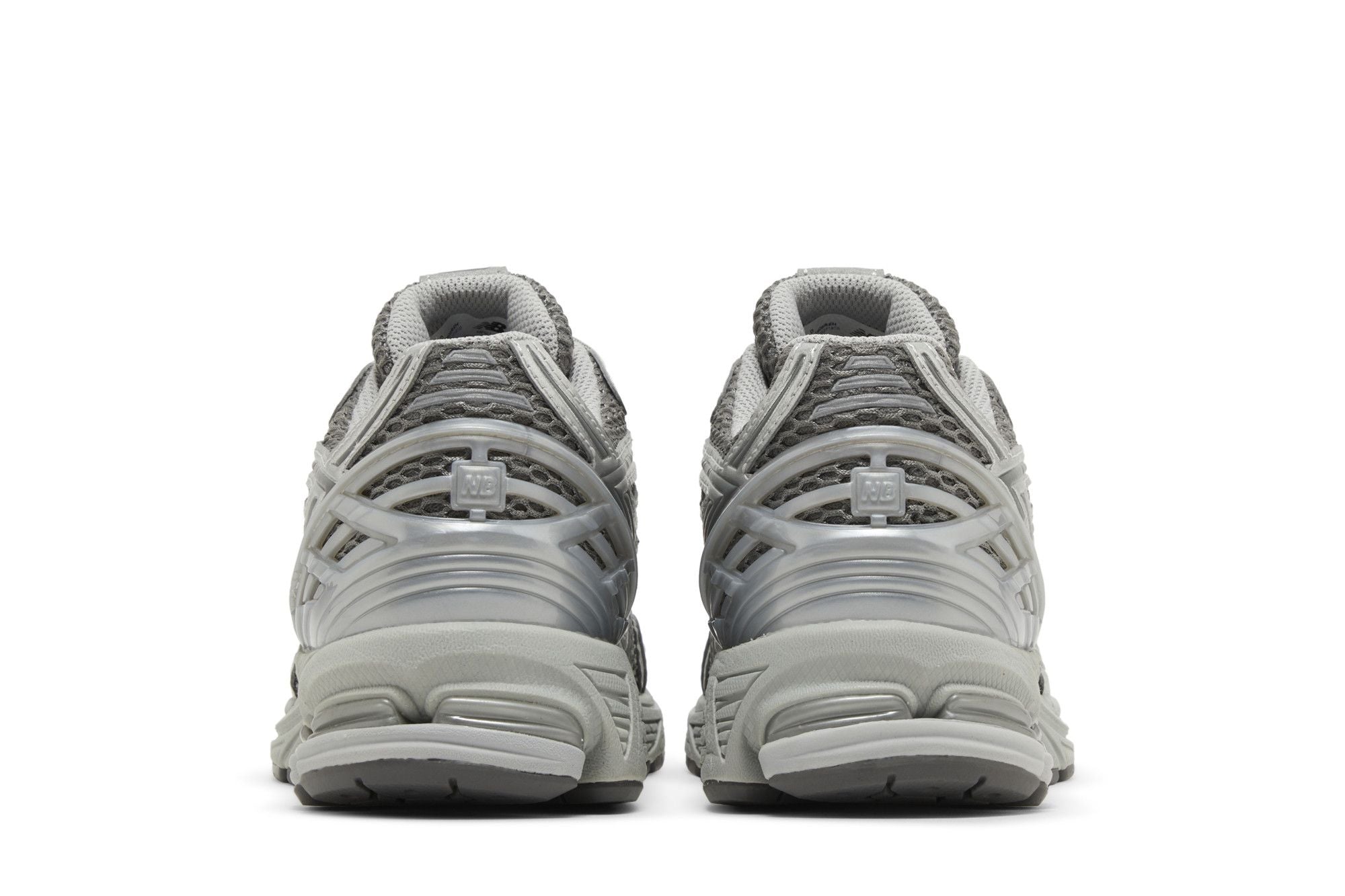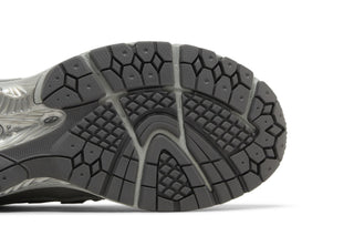 Questa iterazione della New Balance 1906R è realizzata con una tomaia in mesh in grigio scuro. Sovrapposizioni sintetiche in argento metallizzato attraversano l'intera tomaia, arrotondando la punta, attraversando l'intersuola e correndo sotto la parte superiore del tallone. La New Balance N adorna entrambi i lati sotto i lacci in un design a pannelli 3D con il marchio N-Lock che appare al centro. Il marchio 1906R si trova sul rivestimento sul lato laterale del tallone. Il tallone è inoltre supportato da una gabbia in TPU argento, che sfoggia il logo NB. Un altro logo si trova sulla linguetta, mentre una suola grigia fantasia completa il look.